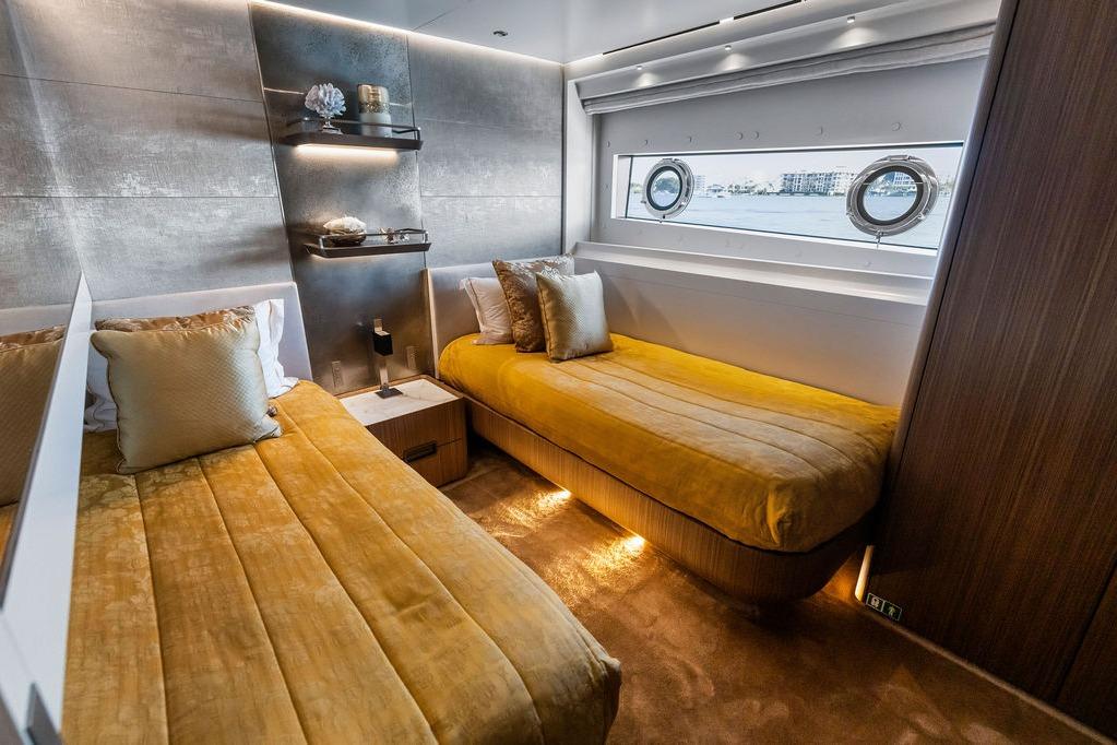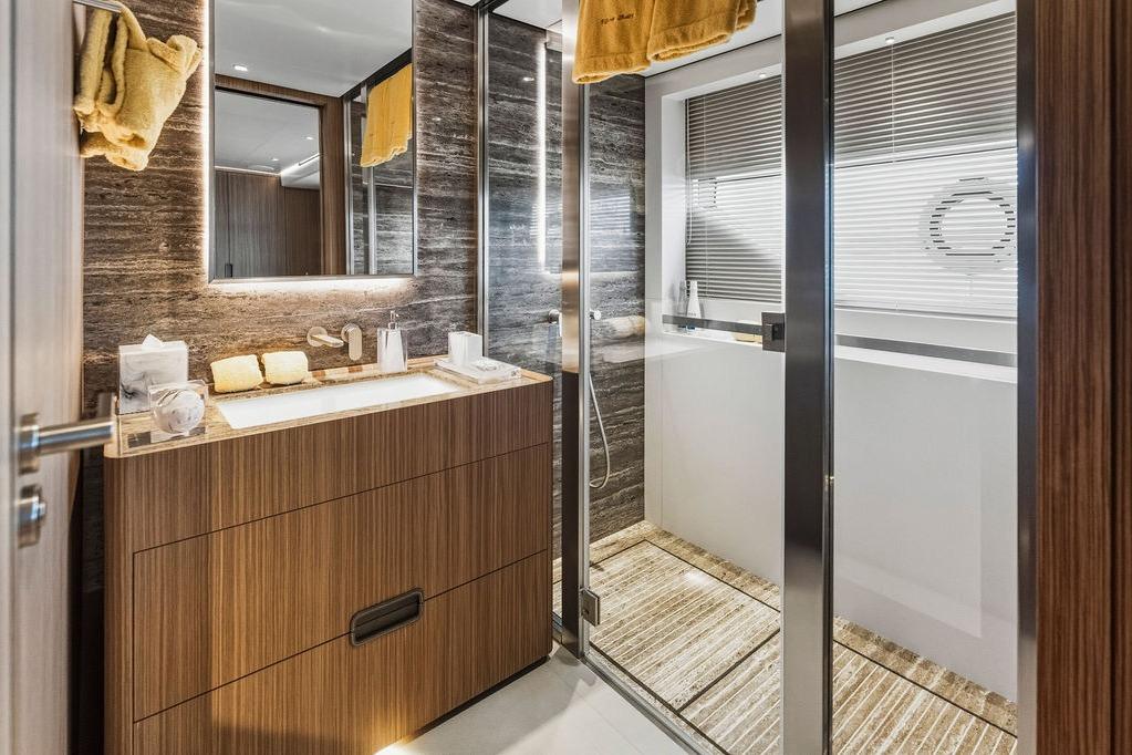 Accommodations are generous and well-planned, featuring a full-beam on-deck owner’s suite that offers exceptional privacy, ample storage, and a luxurious ensuite bathroom. Below deck, guest staterooms provide five-star comfort, each with its own ensuite, making the yacht ideal for extended cruising with family and friends.
