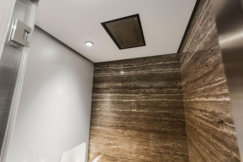 - Walk-in shower (marble walls and floor w/ rain shower head, shower wand, and large window w/ port hole for fresh air and blinds for privacy)