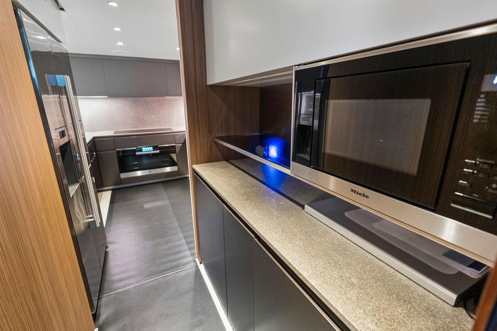 The outdoor spaces are a standout feature of the Custom Line 120’. The expansive flybridge offers multiple seating and dining areas, perfect for alfresco living, while the aft and fore decks provide additional options for sunbathing, dining, or quiet relaxation, whether underway or at anchor.