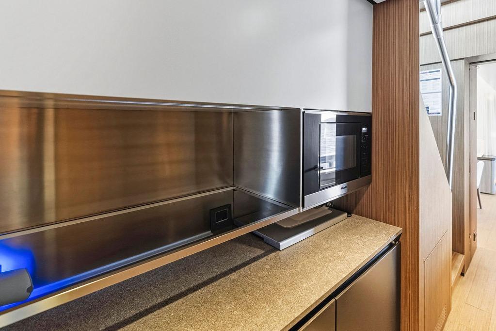 The main salon is spacious and inviting, with panoramic windows that create a seamless connection to the sea. The thoughtfully arranged lounge and dining areas make the space suitable for both relaxed cruising and elegant entertaining. High-quality materials, fine wood finishes, and intricate detailing reflect Custom Line’s commitment to craftsmanship and timeless design.