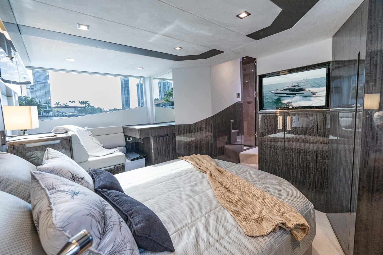 Down below, three cabins and two bathrooms await the passengers for a total of six berths. The master cabin, located midship, offers a double bed, large wardrobe and a private bathroom. Offer your guests the bow VIP cabin for spectacular night views thanks to a series of skylights. All quarters offer standing height and have access to natural light. The sumptuous master stateroom is the ideal space for privacy at the end of a day full of socializing and adventure.