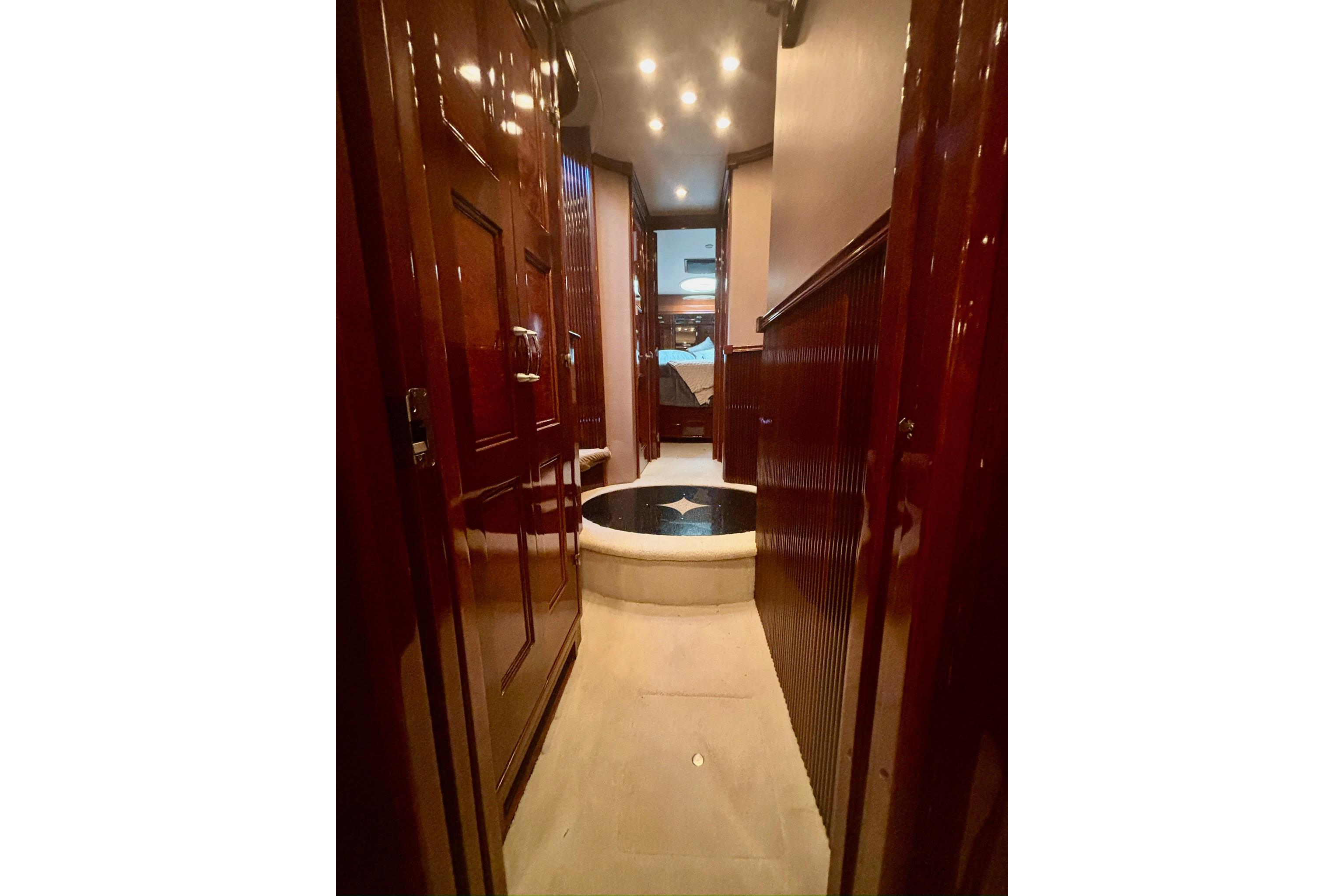 The yacht offers ample space with a full-beam master suite, additional guest cabins, salon, and flybridge. It is equipped with twin Volvo D12 engines for dependable performance.