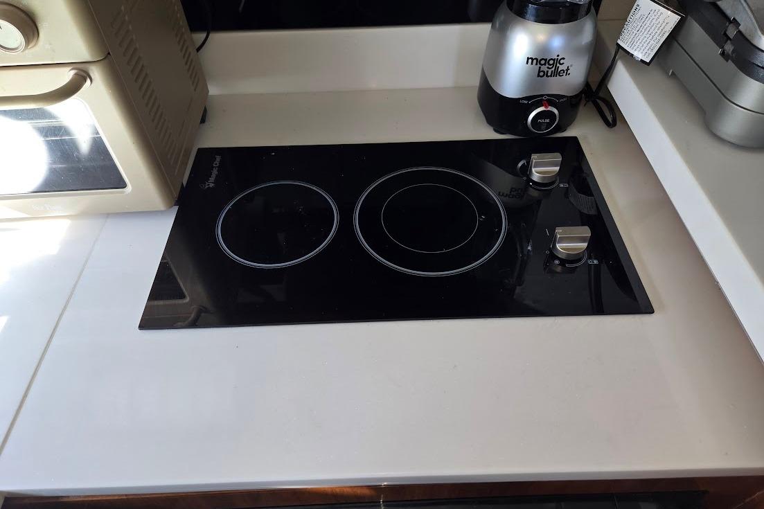 The beautiful, spacious, and spotless Galley is forward and to port in the salon. The galley features everything needed to make the chef happy. The large windows provide a beautiful view for the chefs' enjoyment. Prepare an elegant meal or just a quick snack with ease. From this central location, the chef can easily speak with the Captain at the helm, or guests in the salon. It is a joy to create in this absolutely spotless galley.