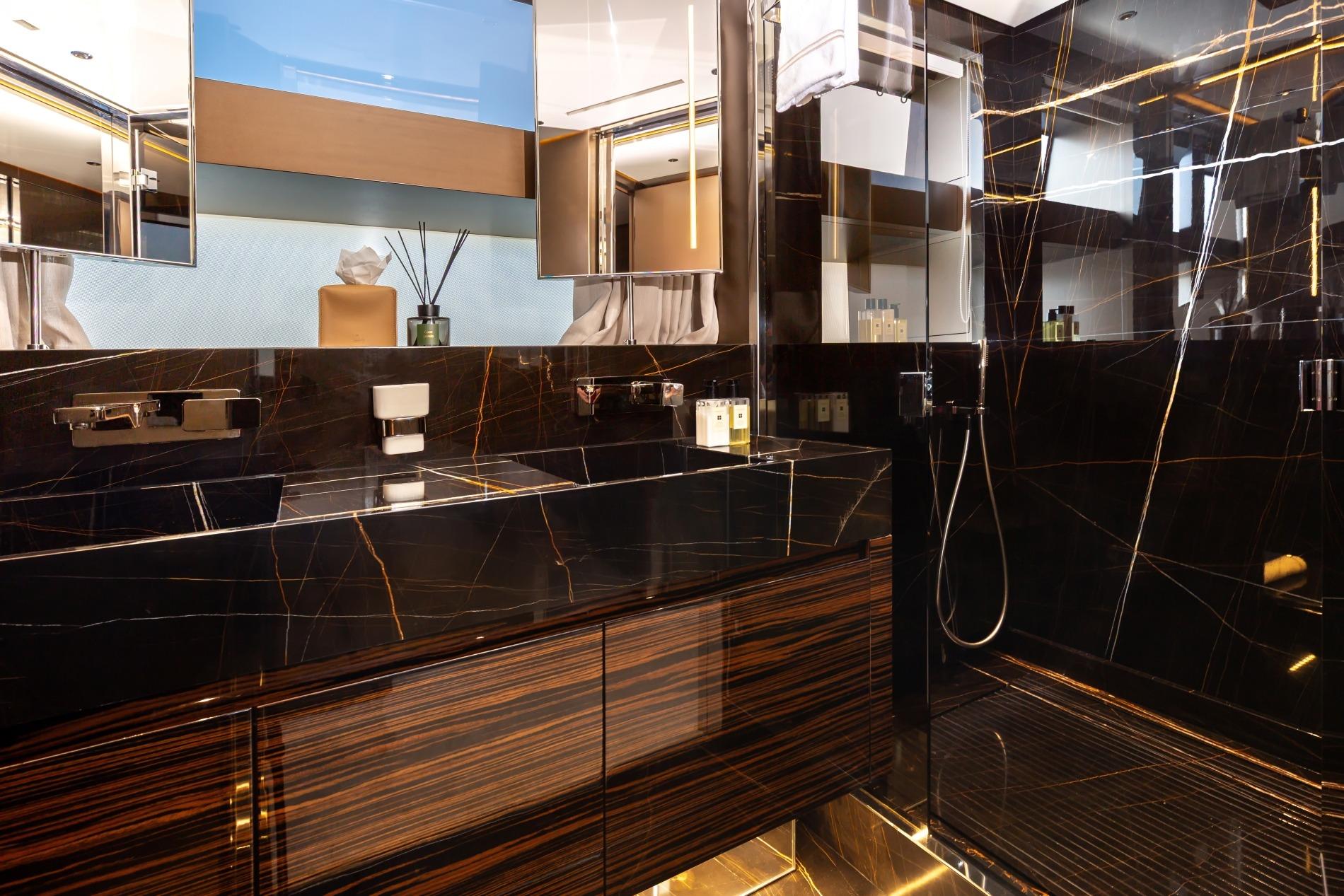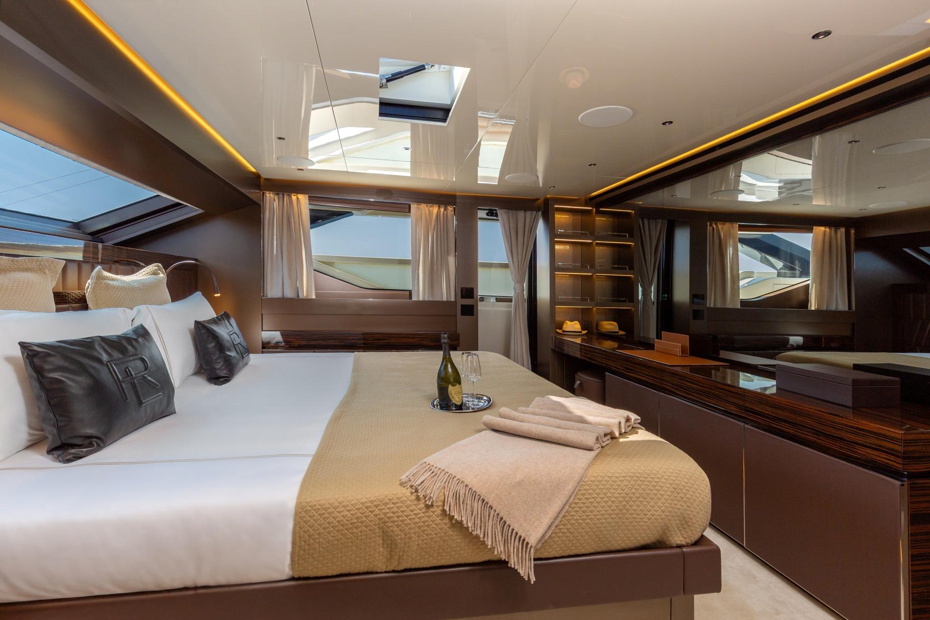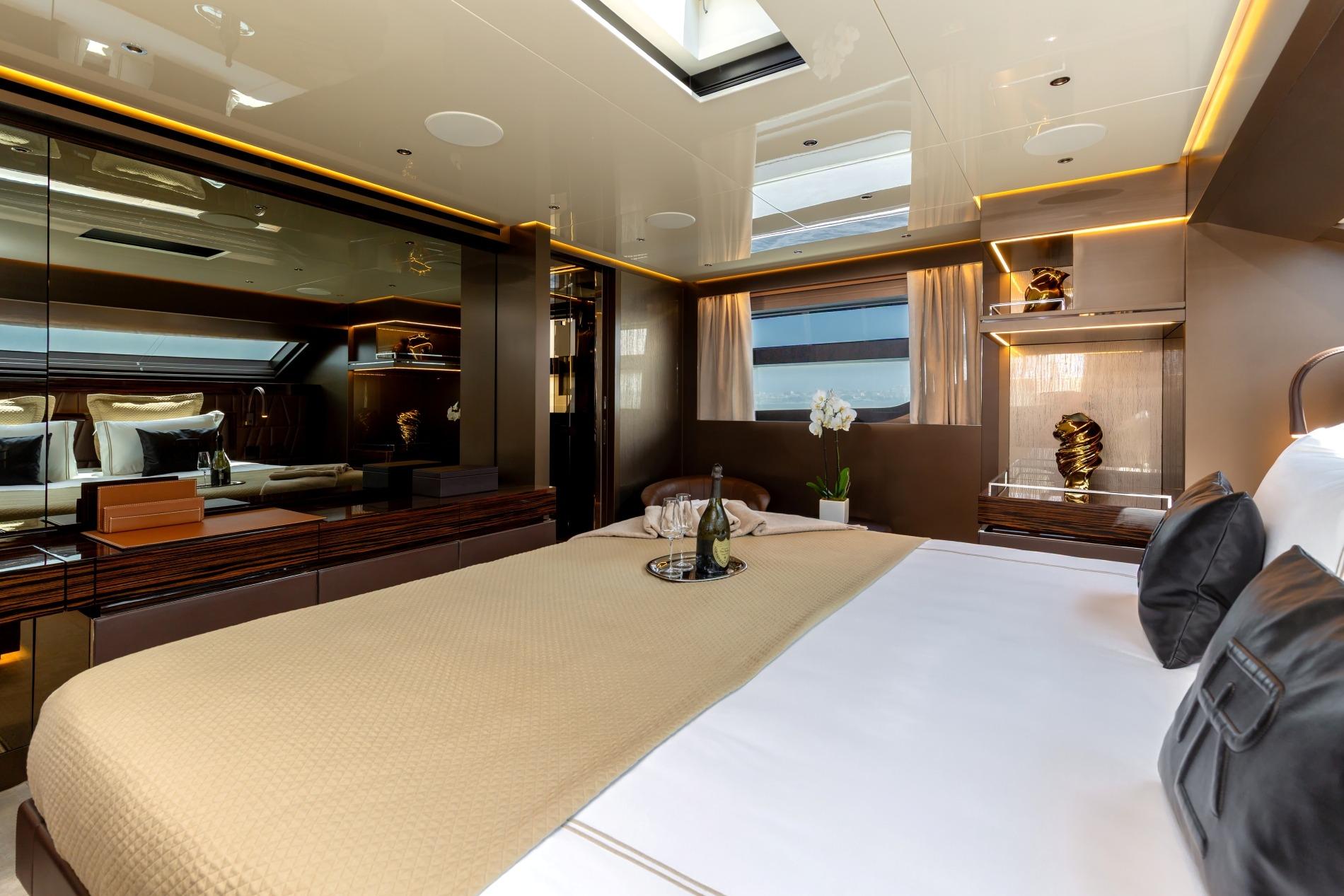 This stunning yacht showcases the owner’s considerable investment in elegant decoration, combining modern luxury with comfort. The light-filled salon features a fold-down balcony, offering an open and airy space for relaxation. Located on the main deck, her master cabin offers unparalleled privacy and comfort. The yacht also features 3 double guest cabins and 1 twin cabin/convertible, providing luxurious accommodation for up to 10 guests in total.
