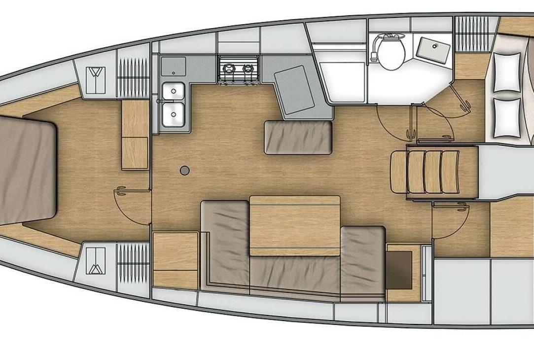 2 cabins: Owner’s cabin forward with centerline double berth and full vanity; aft cabin double berth.