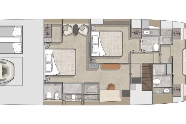 - Achternstrandbereich: Dusche, Radio und Lichter, USB-Buchse, Schwarzer mikroperforierter Sichtschutz; Teakholz-Trittbrett