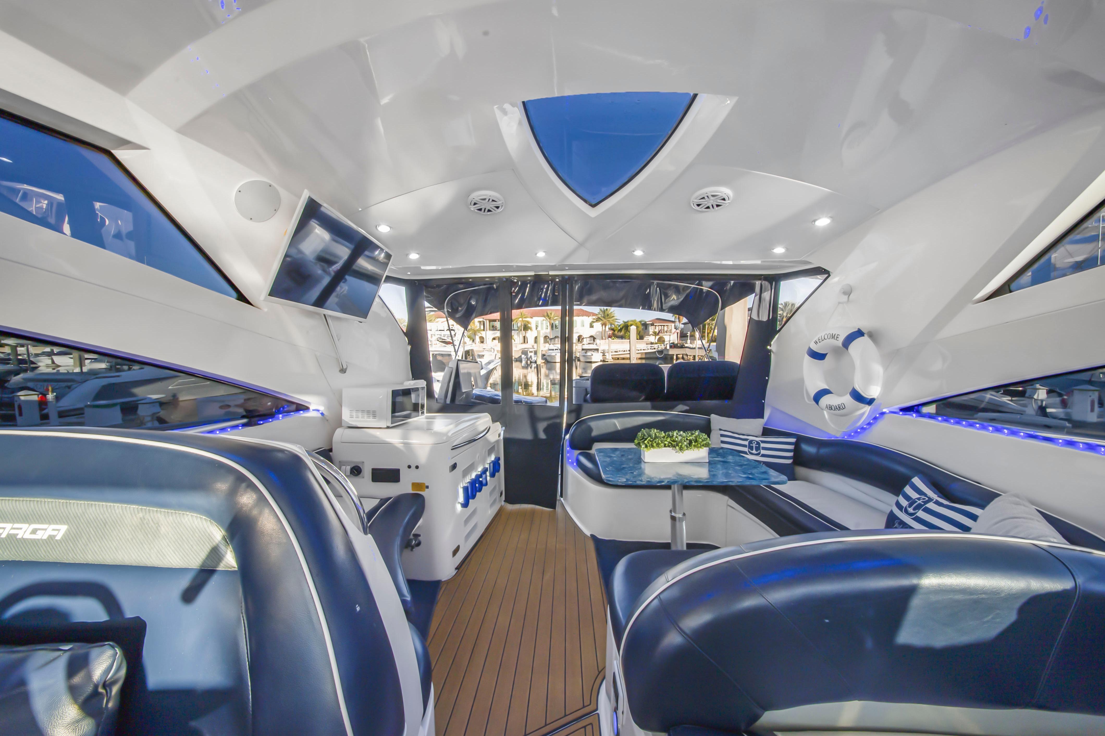 Power comes from twin Caterpillar C12 diesels (775 HP each / 1,550 total) with - 720 (Port) and 780 (Starboard) hours, delivering confident cruising and a thrilling ride listed at approximately 27 knots cruise and 31 knots top speed. Docking is made easy with bow and stern thrusters, and the on-deck experience is upgraded with a retractable sunroof, large social cockpit, and a tender garage for a 10’ tender (tender not included).