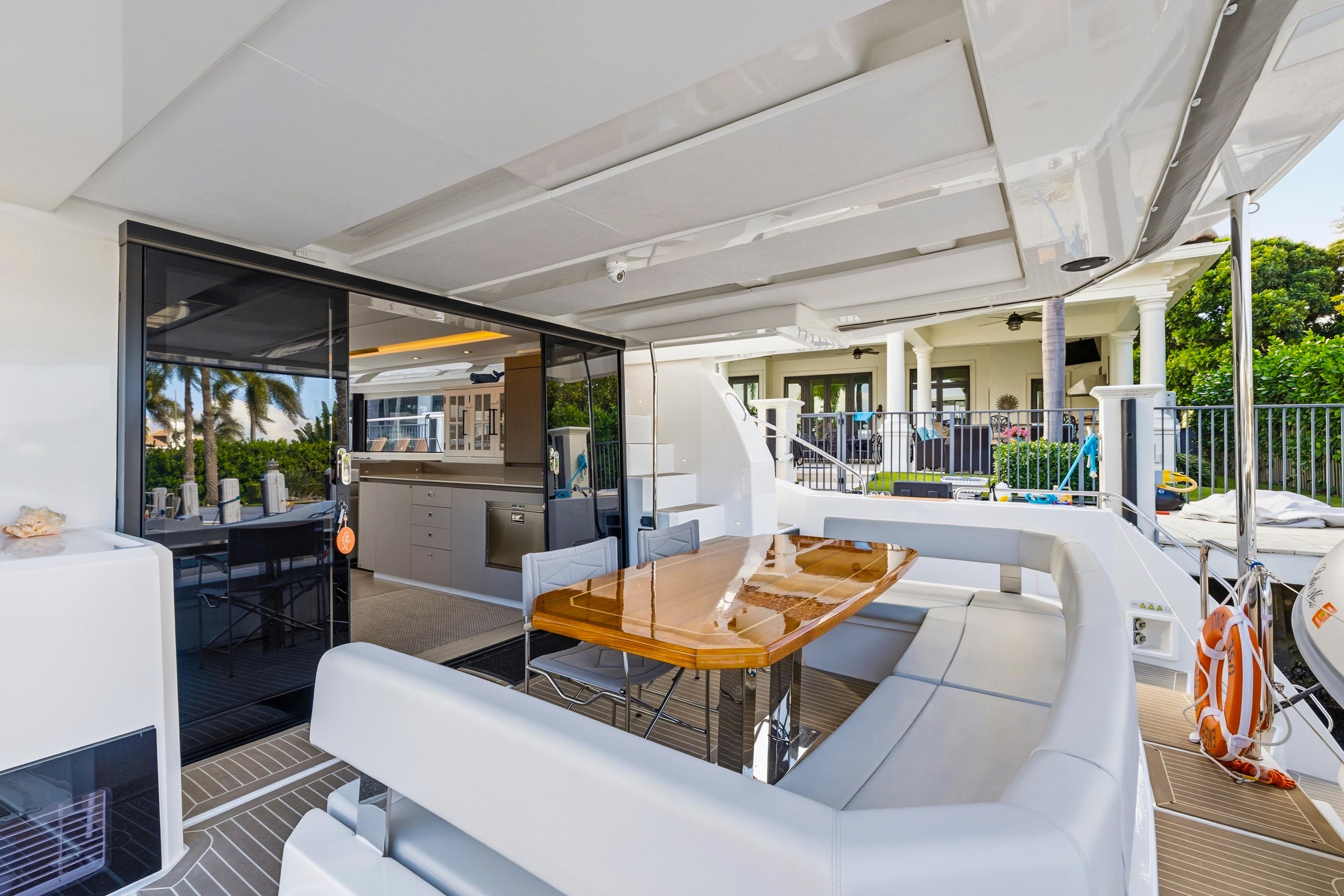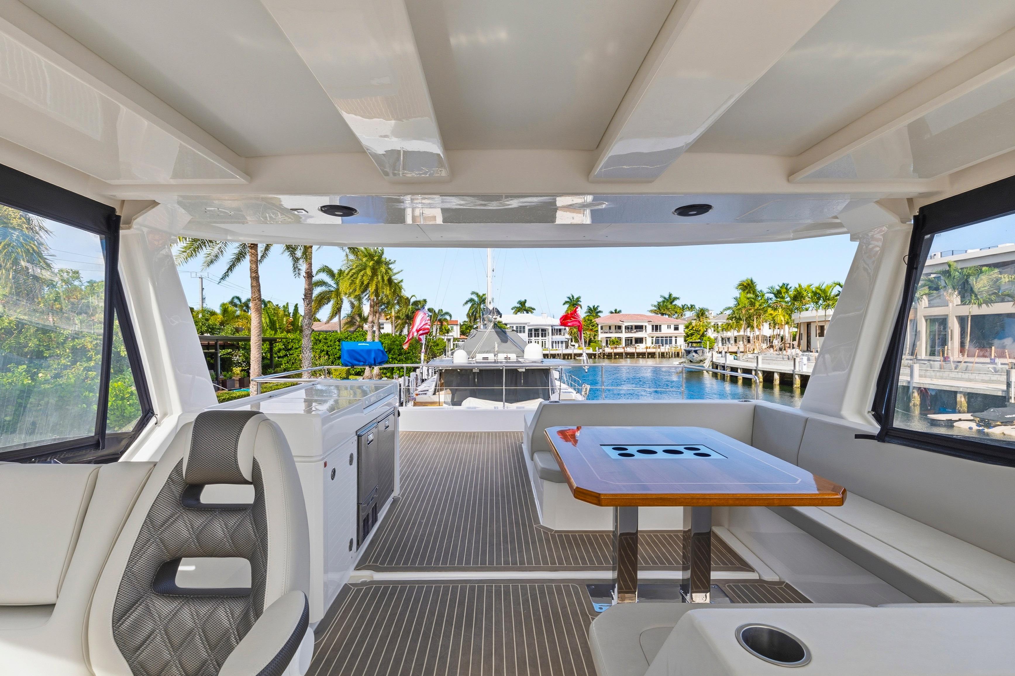 The bright salon showcases Sunbrella Pebble upholstery, panoramic windows, and a fully appointed galley with dishwasher, induction cooktop, convection oven, and additional refrigerator.