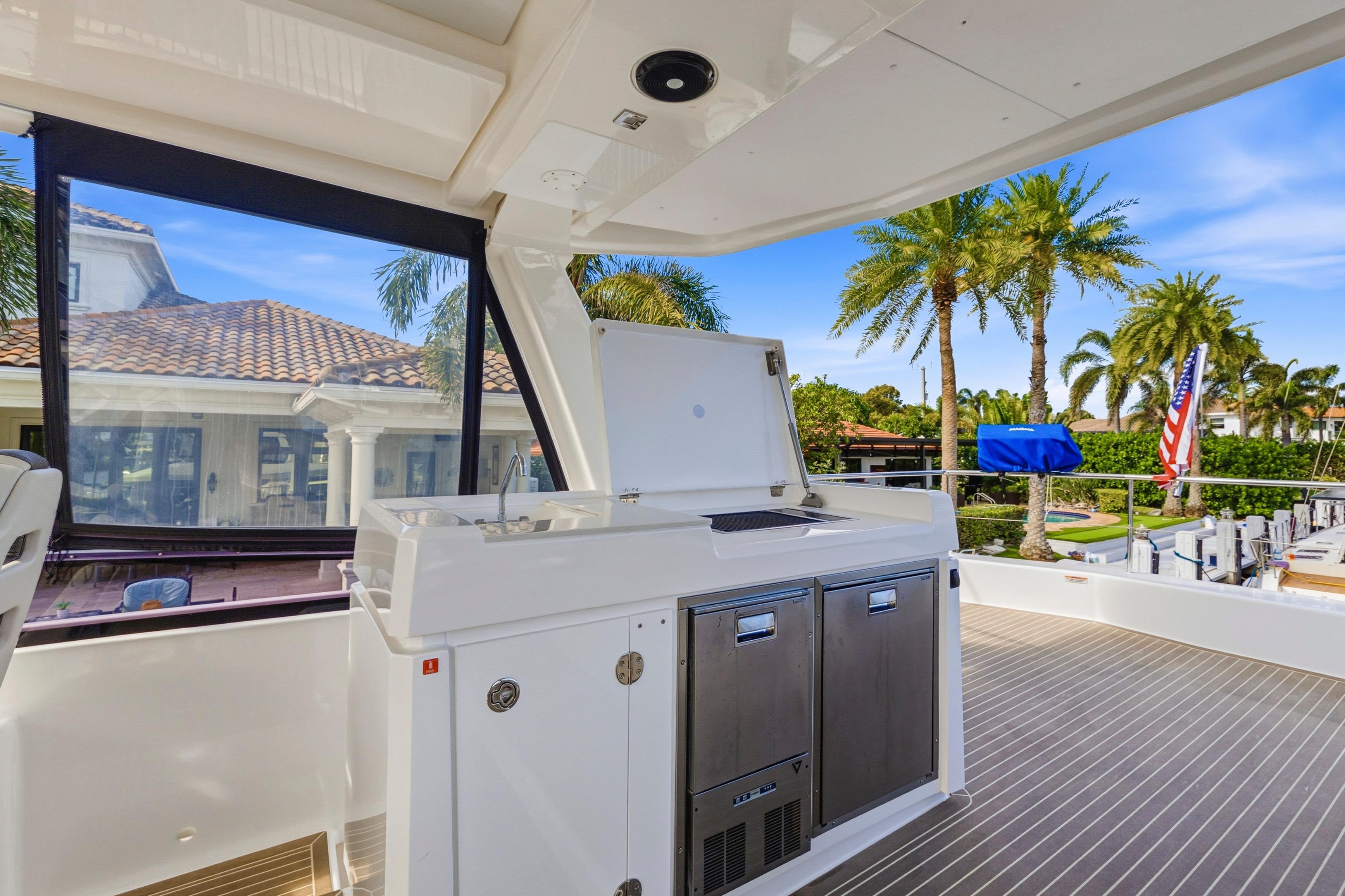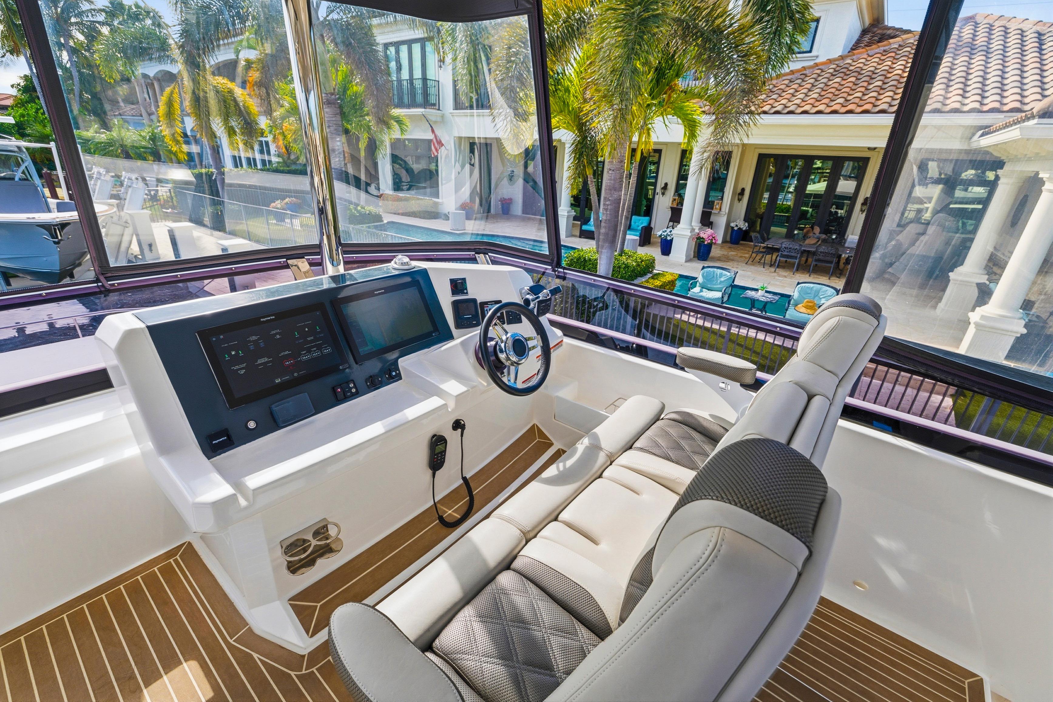 Featuring the desirable Maestro layout with three queen cabins and three ensuite heads, she's equipped with composite weathered teak decking throughout, an electric swim platform, DockMate controls, and a flybridge that serves as the ultimate entertaining space with Raymarine dual 16-inch displays, Starlink connectivity, wet bar with electric grill, refrigerator, and icemaker.