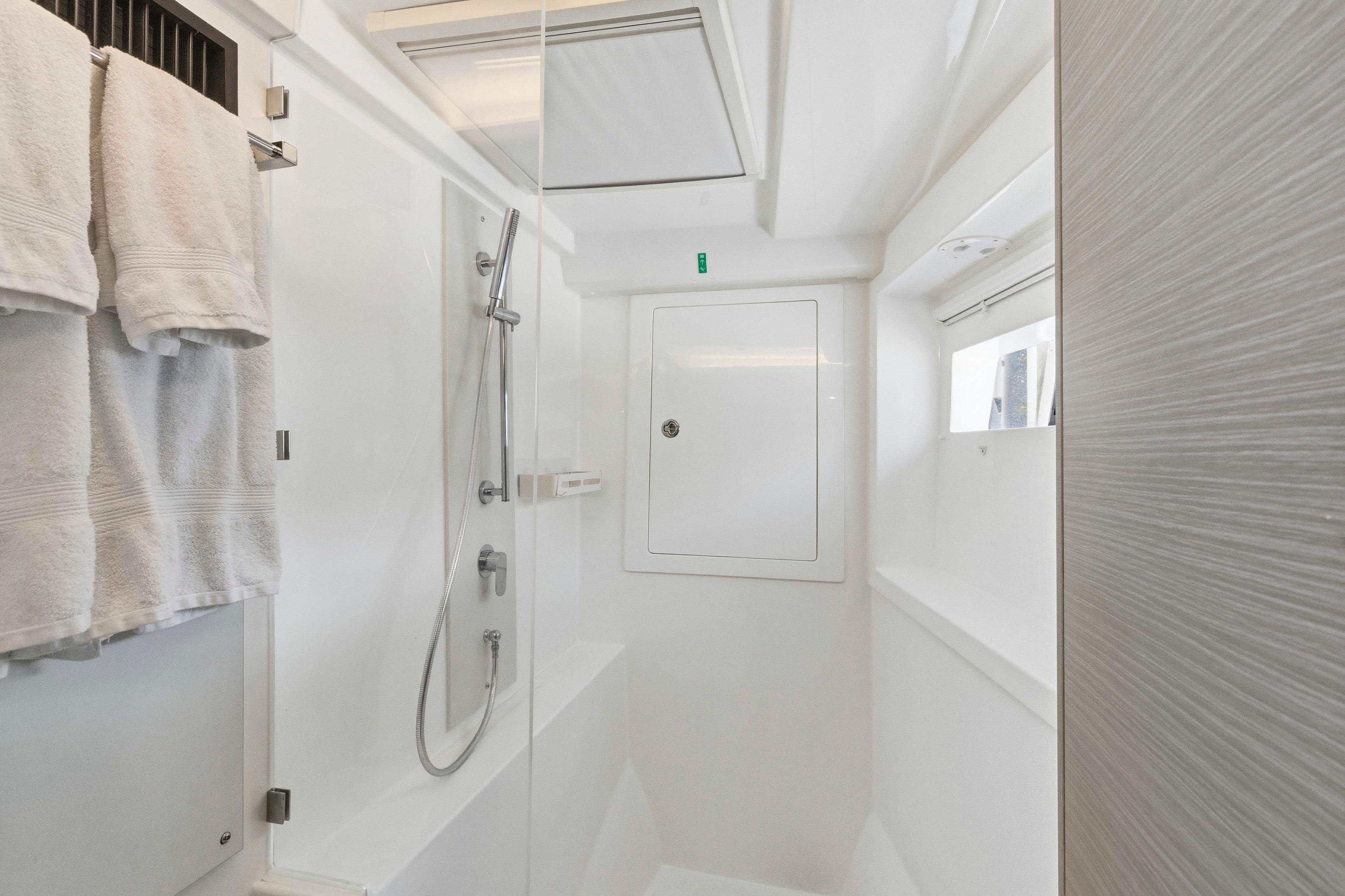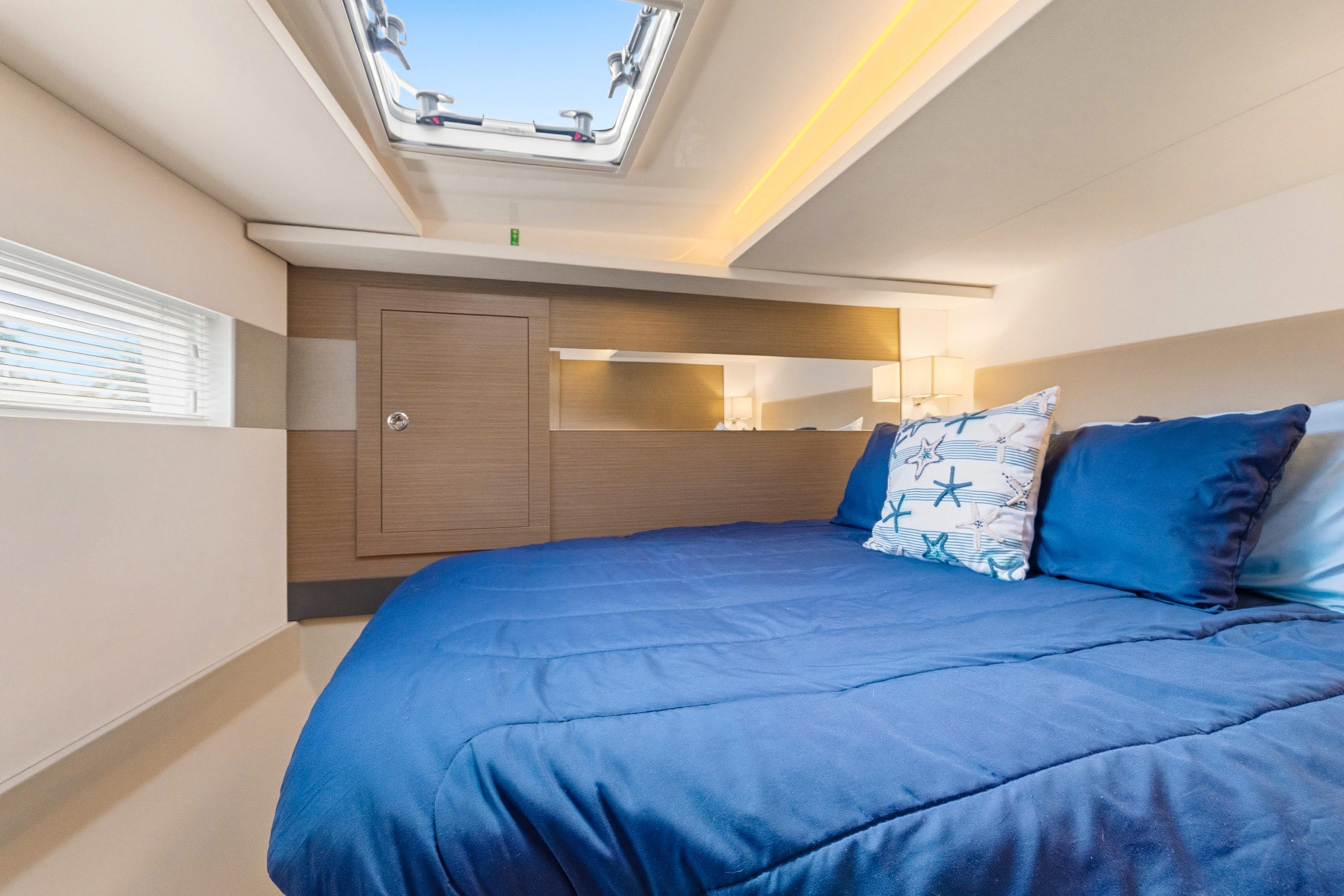 The cabin feature full length mirrors, 12V fans and oversized hull-side windows as well flush-mounted deck hatches for superior ventilation and natural light
