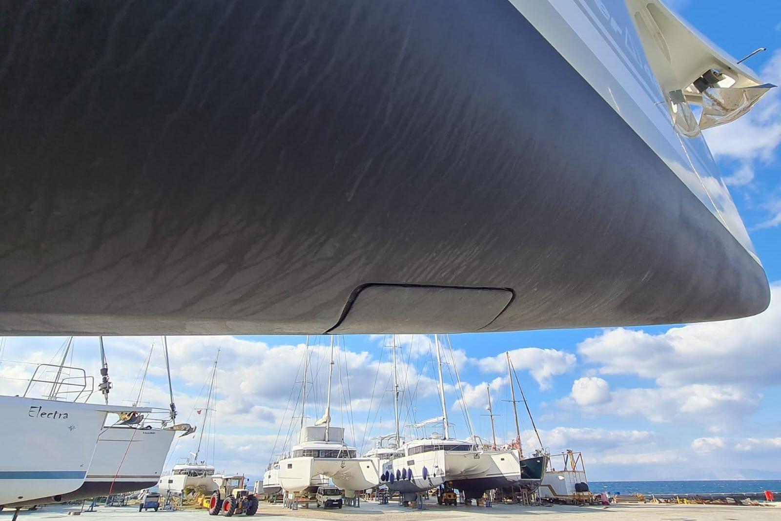 Currently located on the hardstand in Aegina, Greece, Loki has been sanded and is ready for antifouling.