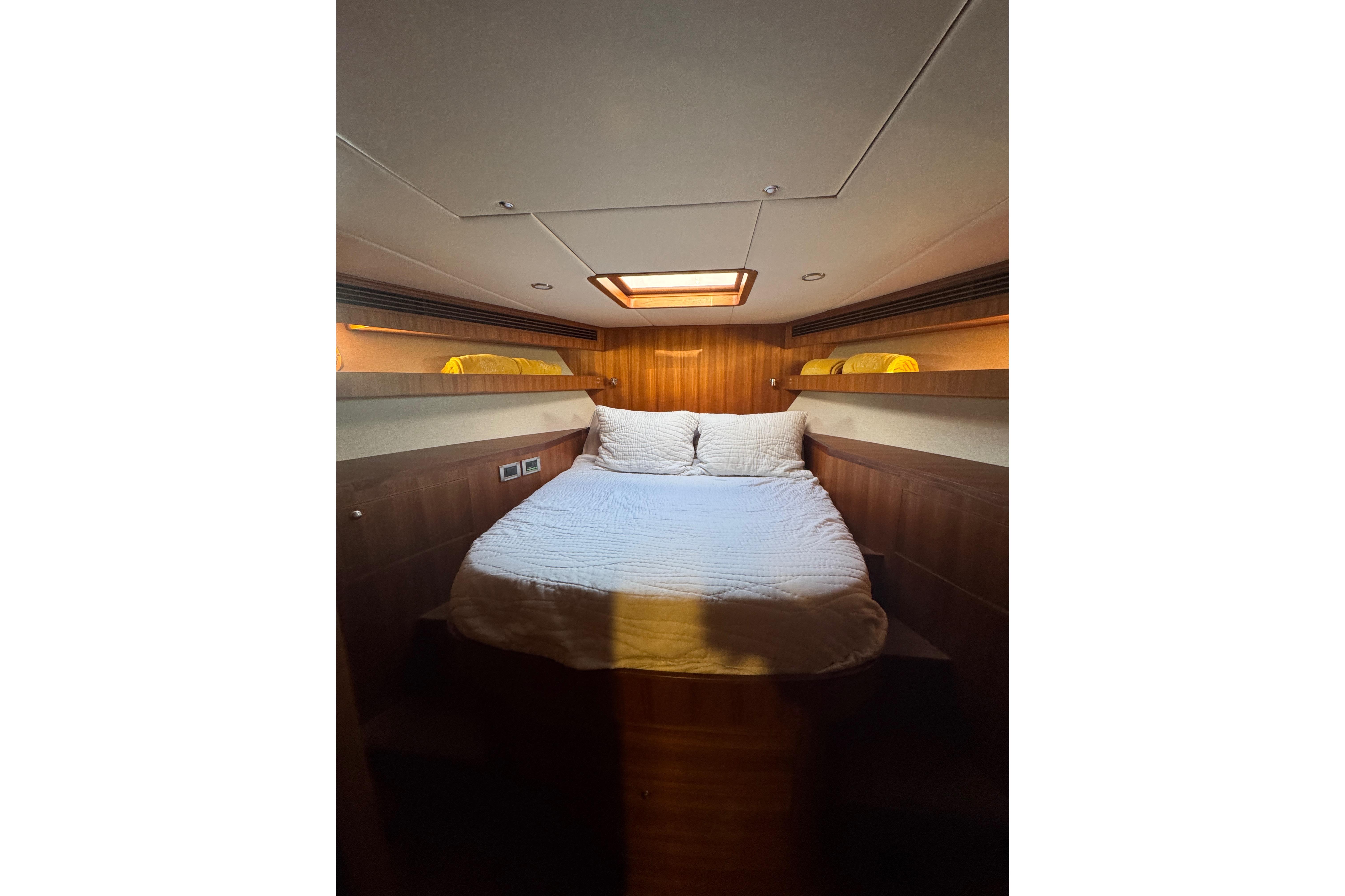 • Tapered queen-size lifting berth with teak storage drawers under