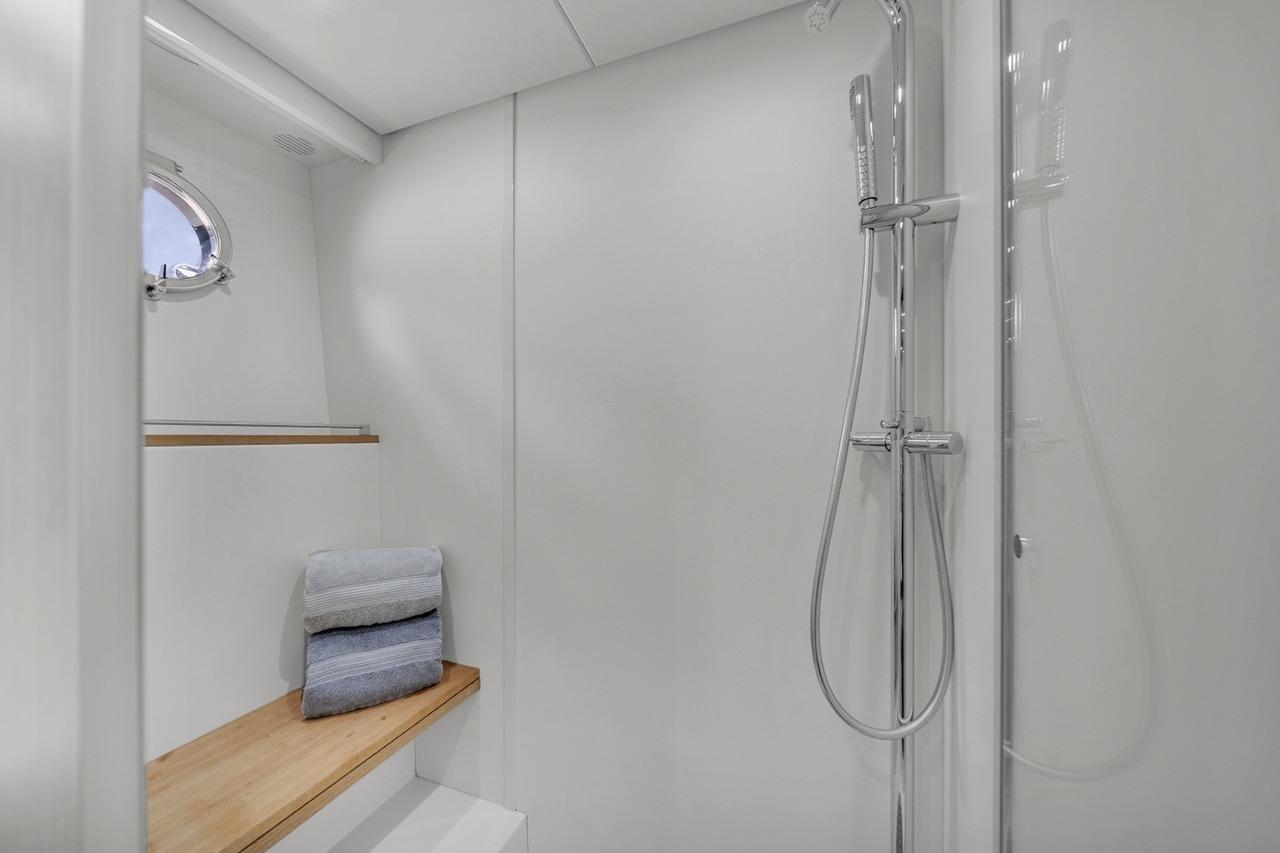 - The VIP bathroom has a round shower glass with 2 shower heads combined in a very stylish stainless steel tower and a teak shower deck