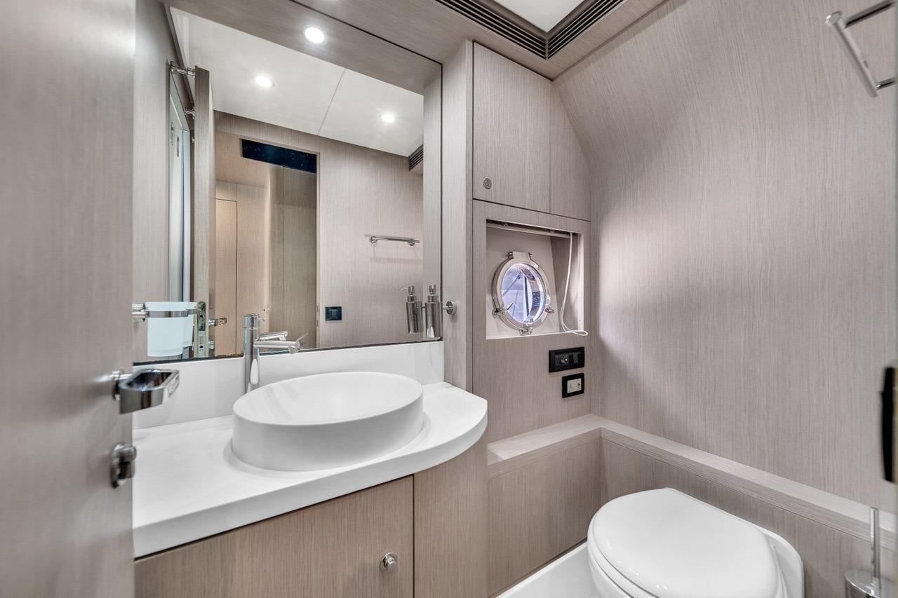 - The cabin is provided of a single bed and a bathroom which has a porthole, a mirror, a bowl sink, an electric Tecma toilet, a shower, a Fusion stereo and a separate a/c unit.
