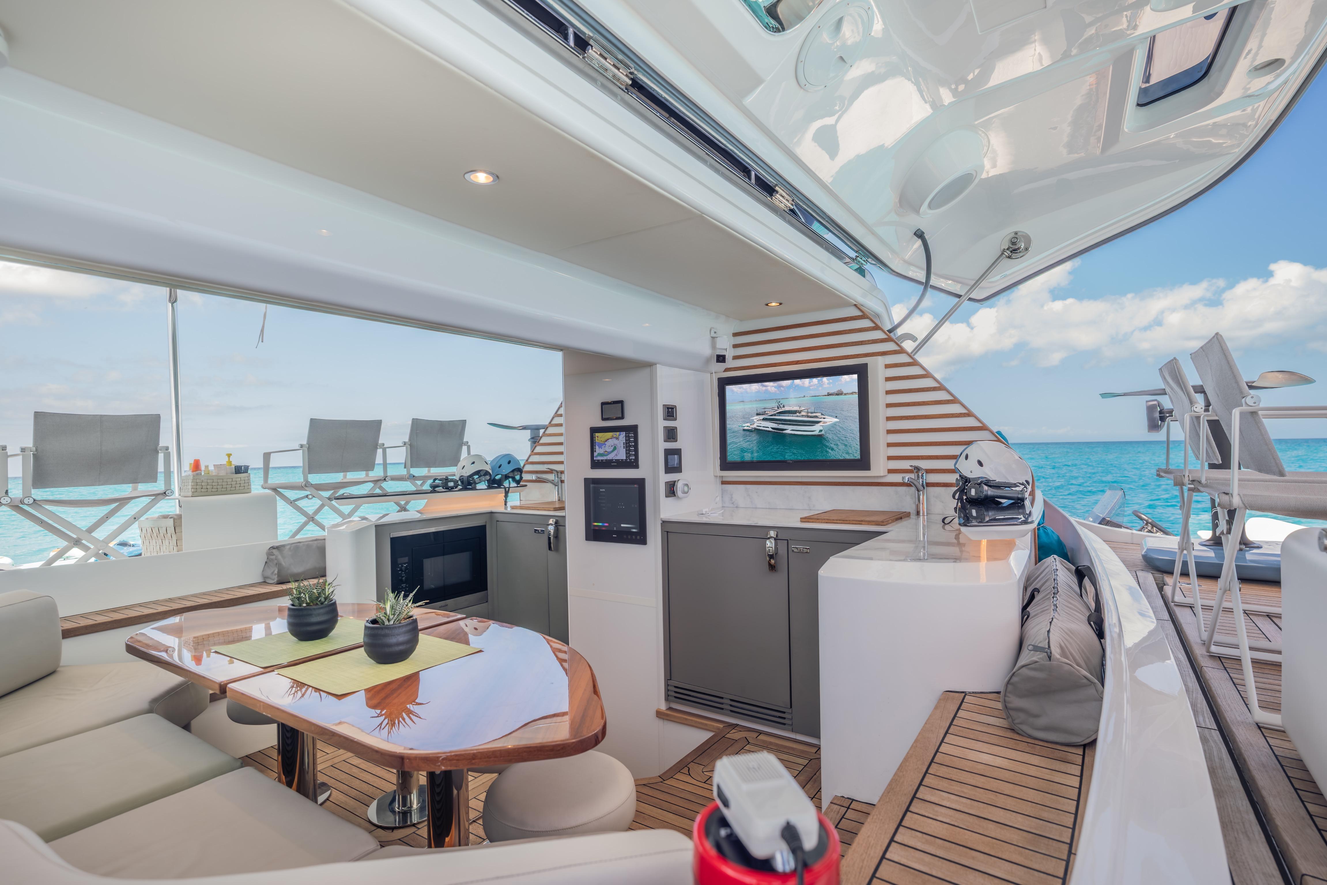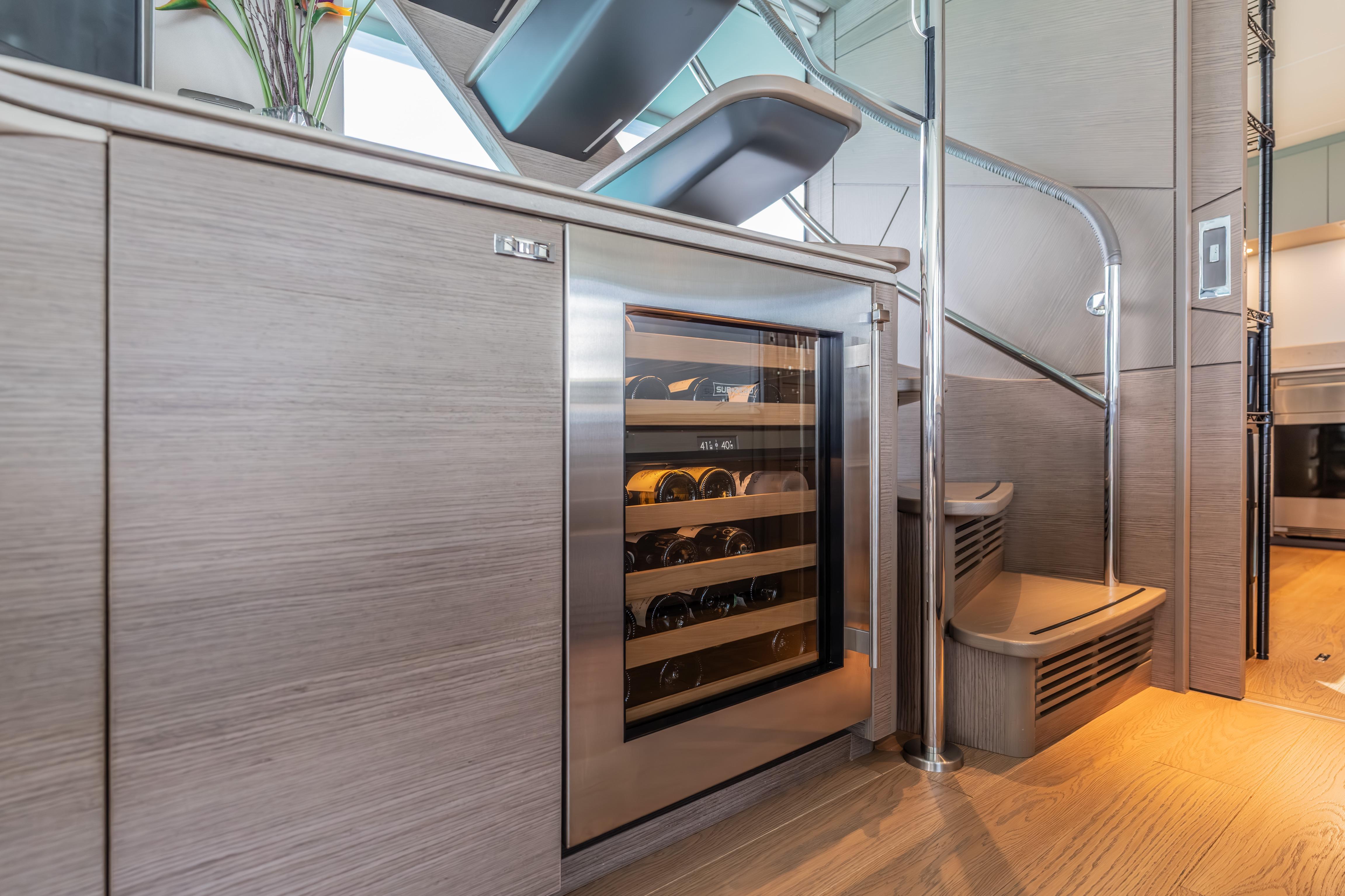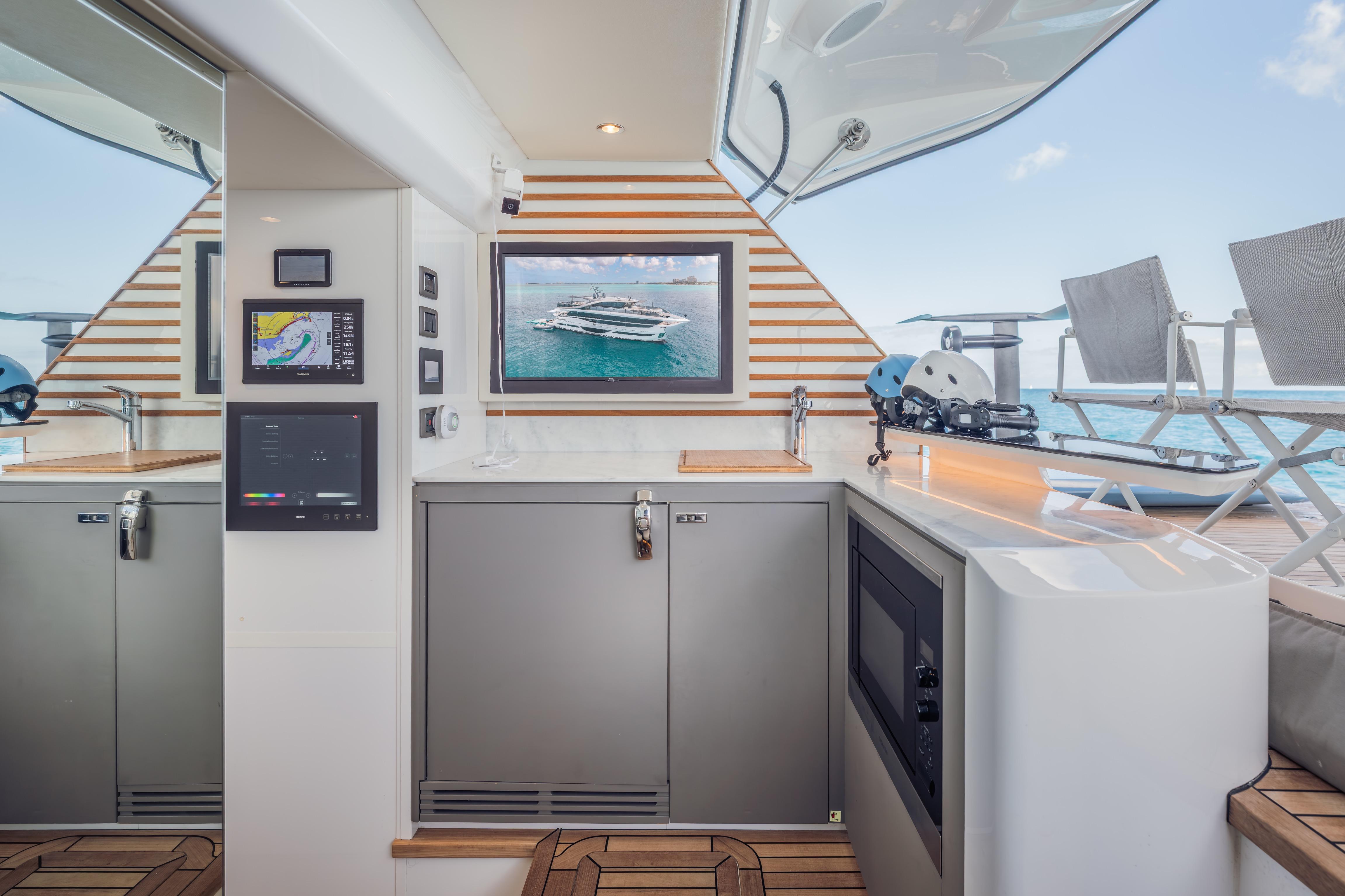 Flybridge port side bar with electric grill, induction hob, refrigerator, sink, and waste bin