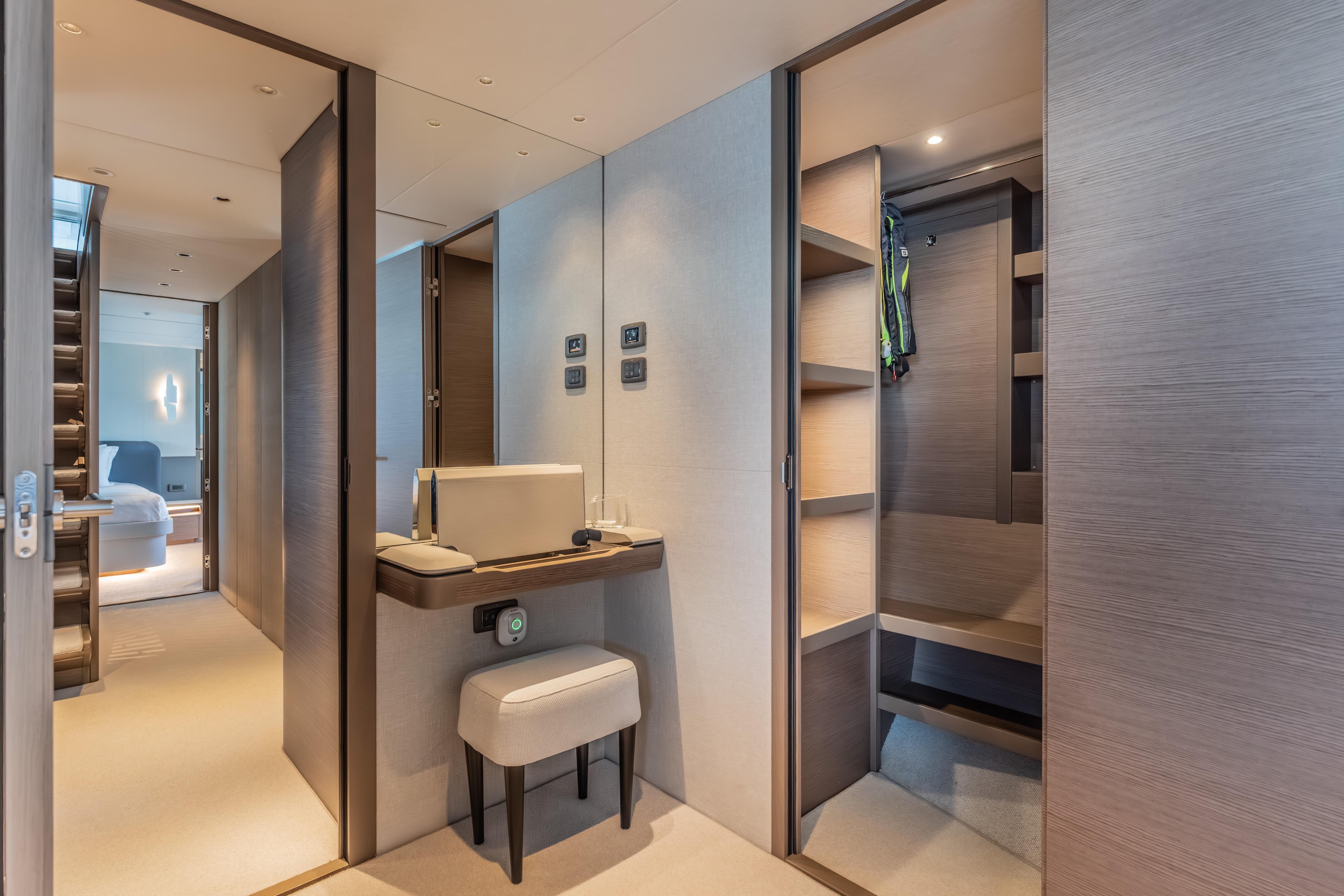 - Separate Washer & Vented Dryer on main deck located in chair storage forward of day head. Includes soundproofing fitted between cupboard and master cabin, relocation of salon passageway AC unit to stateroom wardrobe.