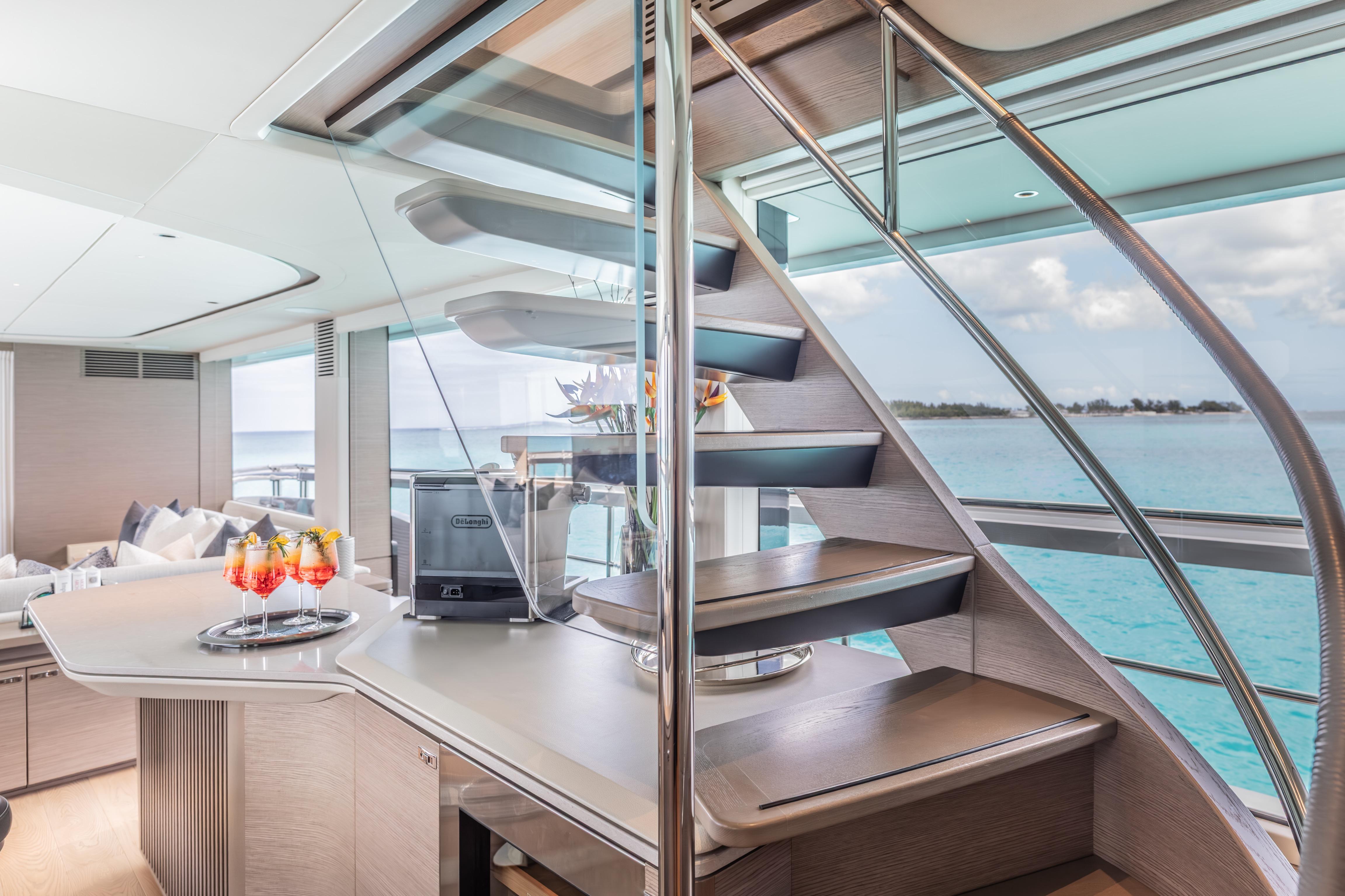 - Revised crew arrangement with 3 cabins, 2 heads, and beach club/crew mess (Note: price includes credit for optional transom configuration under 'layout' above) Non-standard Artwood flooring in main deck salon with inlaid rug* and forward bar / dining area. Note: the skylounge & wheelhouse will also have the same Artwood flooring as standard with in inlaid rug* in the sky lounge.