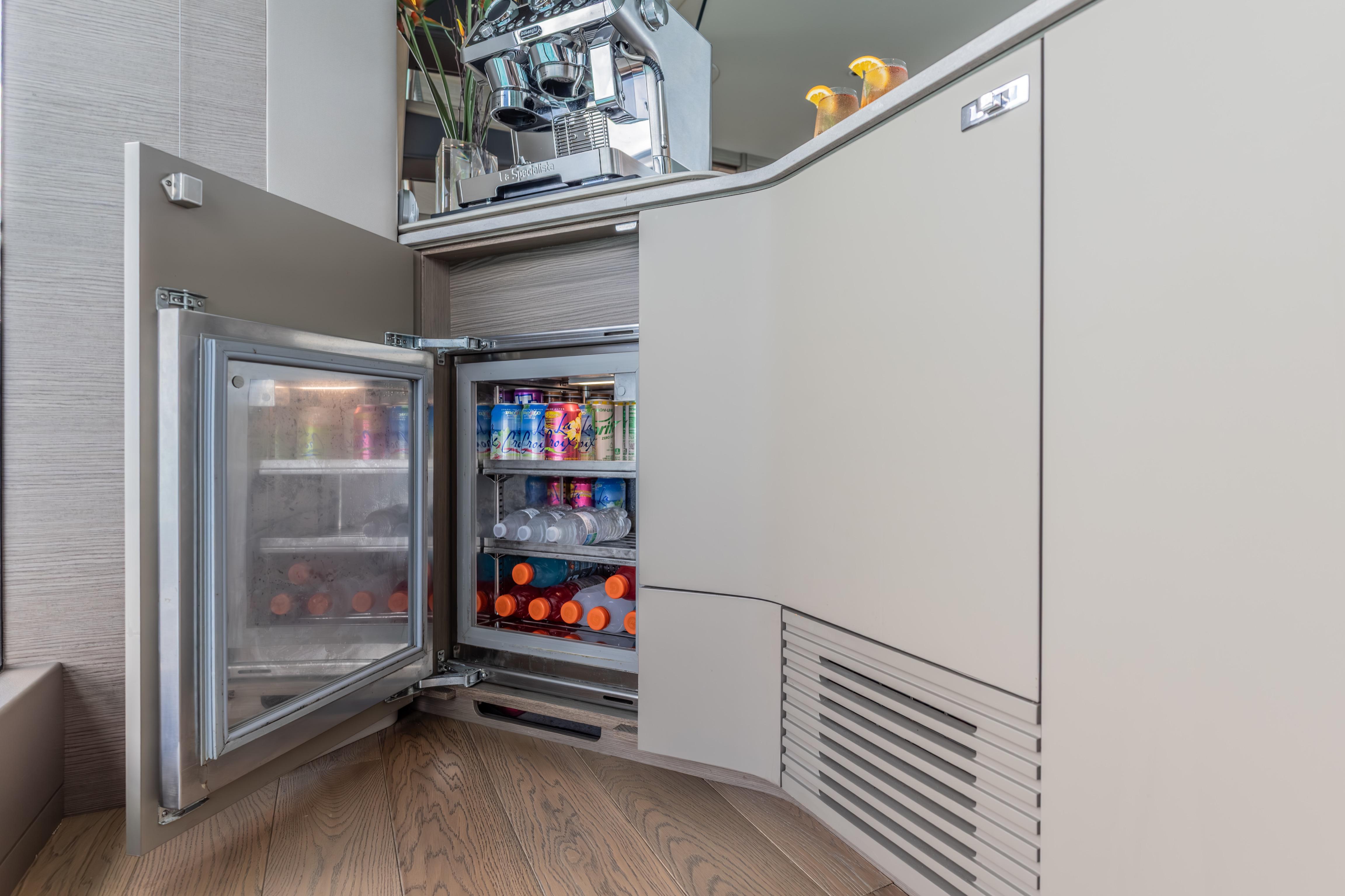 Optional salon bar with refrigerator, ice maker, sink, and storage