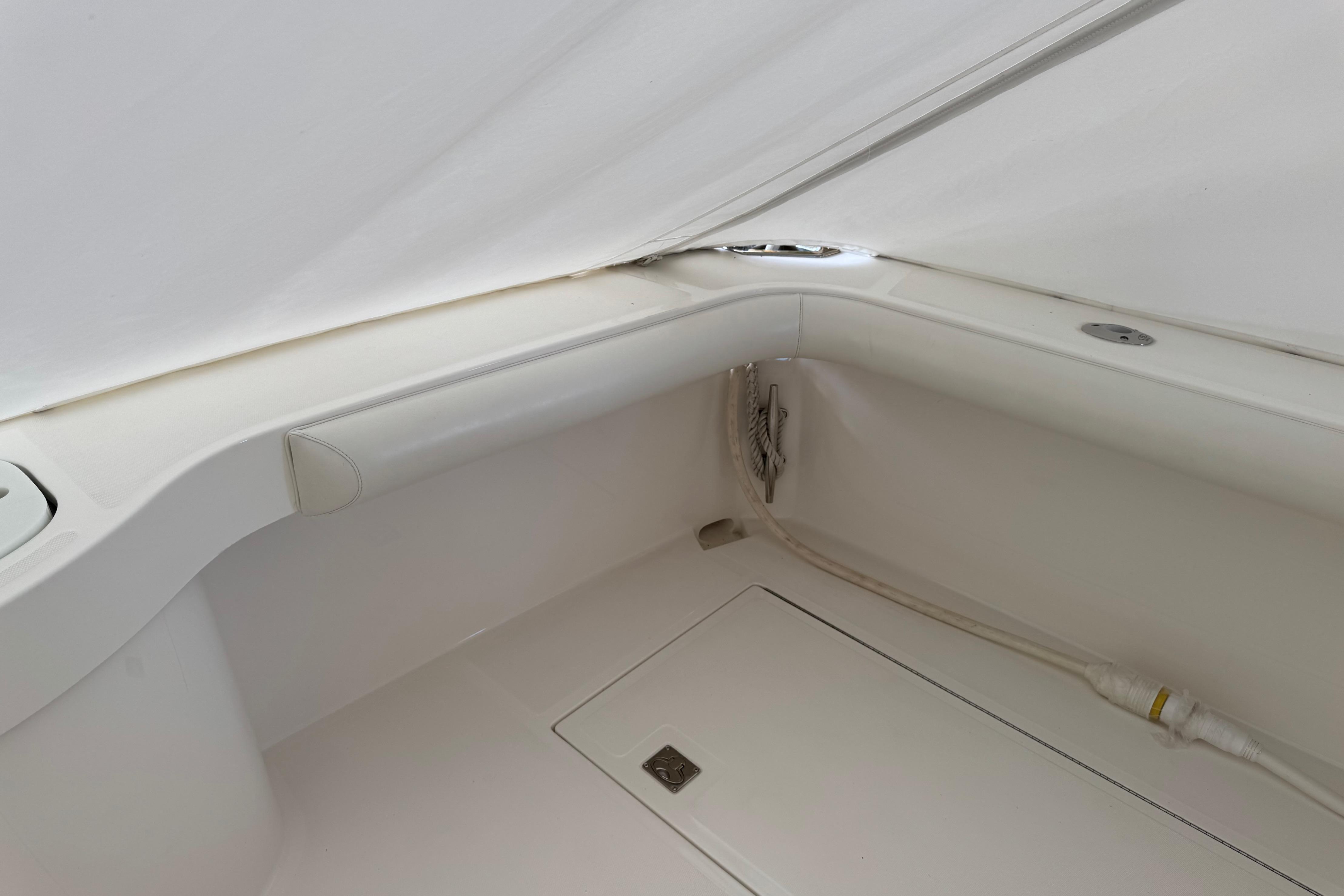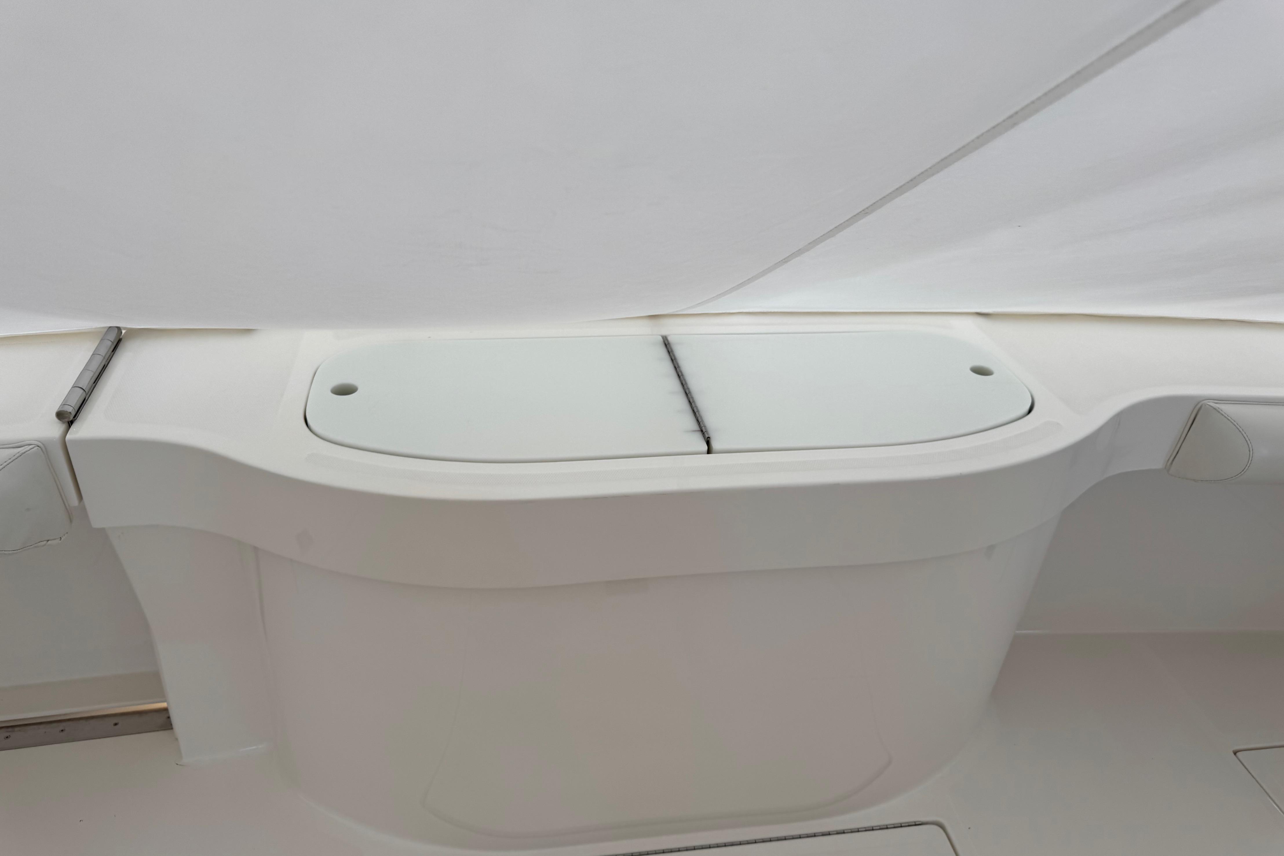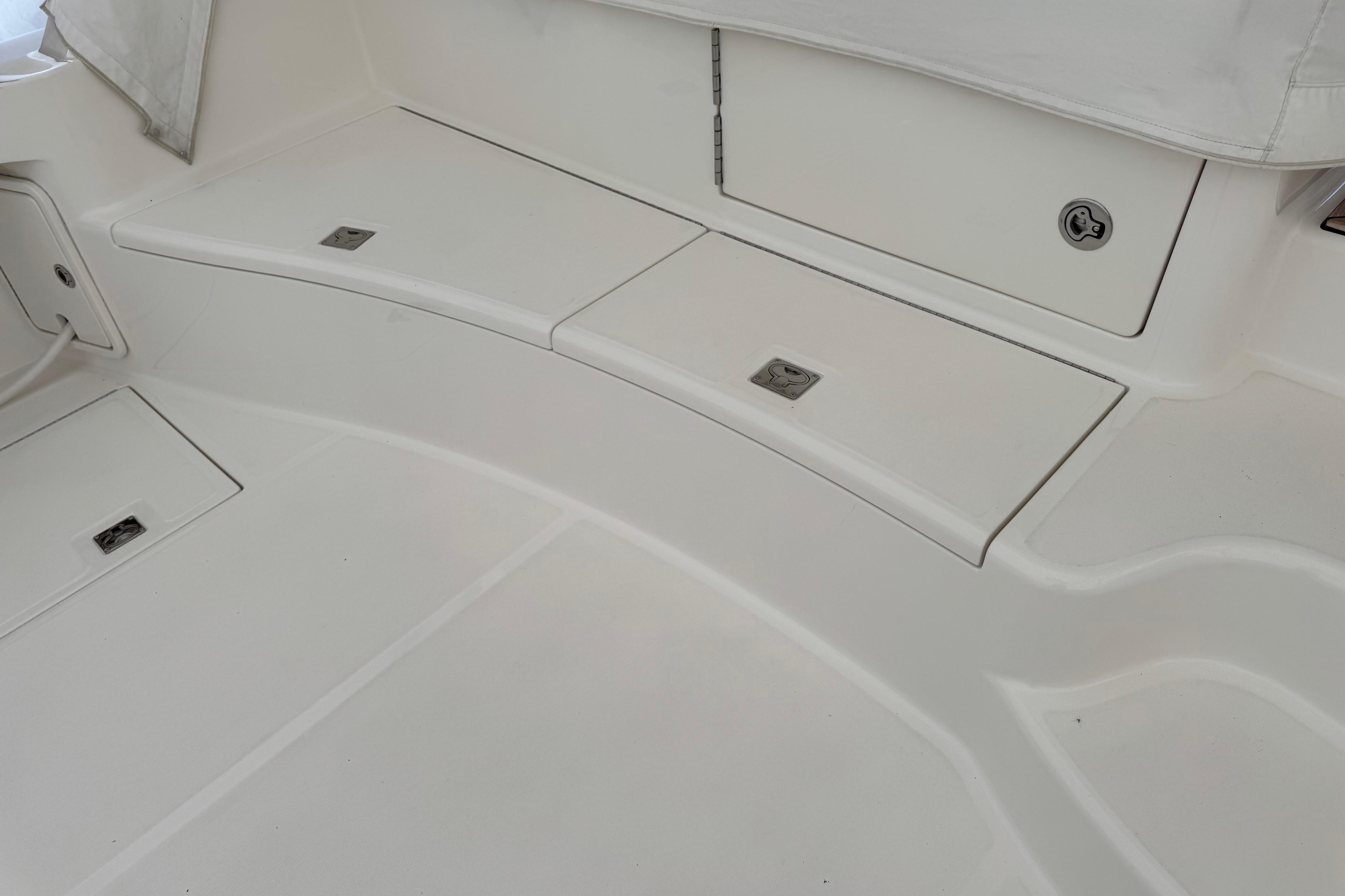 Careful planning and forethought go into the placement of every element in the cockpit - especially essentials such as the bait tank, tackle center and rod storage. Mezzanine seating provides a comfortable perch while watching the spread. Insulated fishboxes are molded into the sole and equipped with in-line macerators. Full-length piano hinges and rubber gaskets allow for a tight seal, to keep your catch fresher longer. Lures and rigging equipment are neatly organized, in a custom-designed tackle center at the rigging station. A number of additional options are also available.
