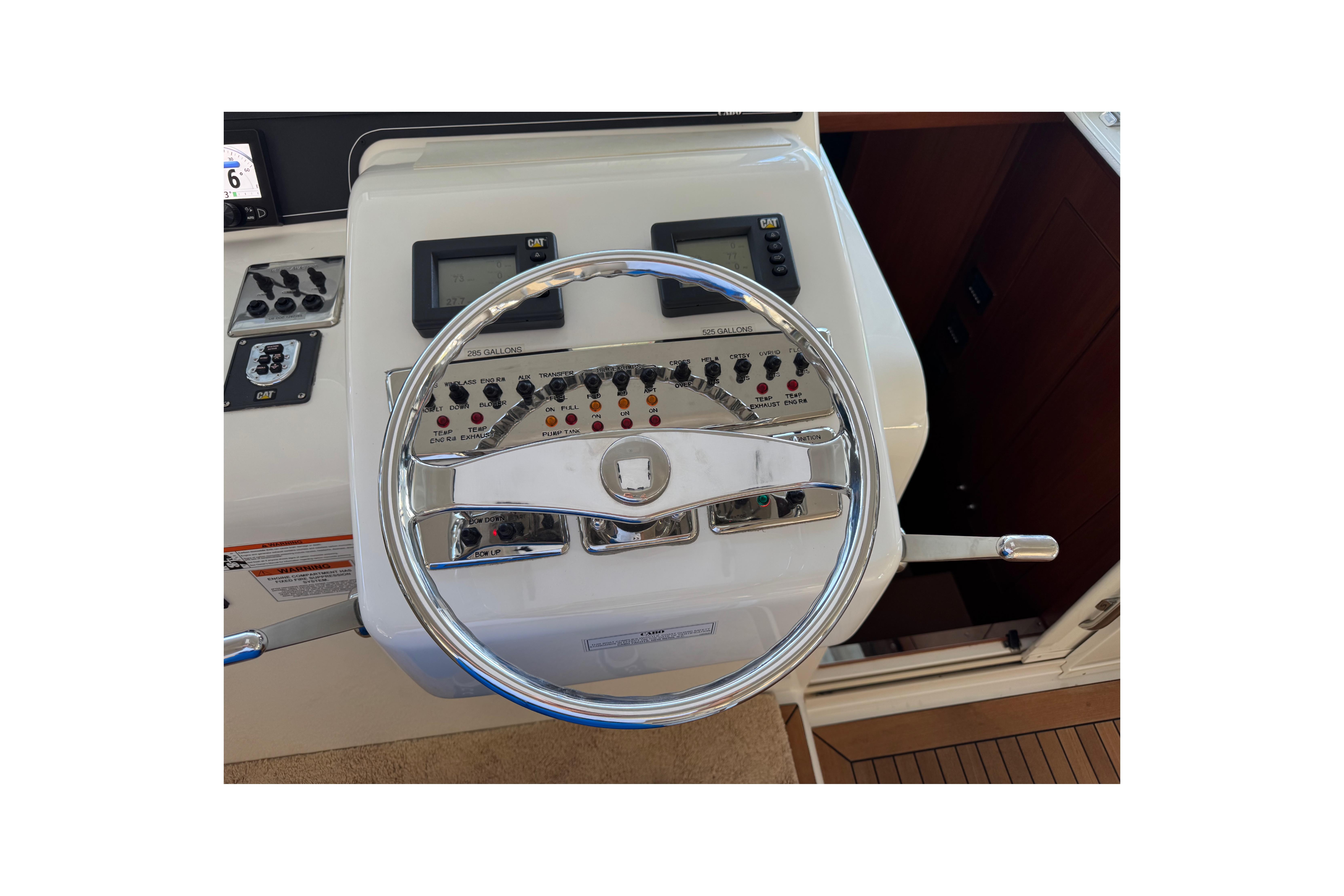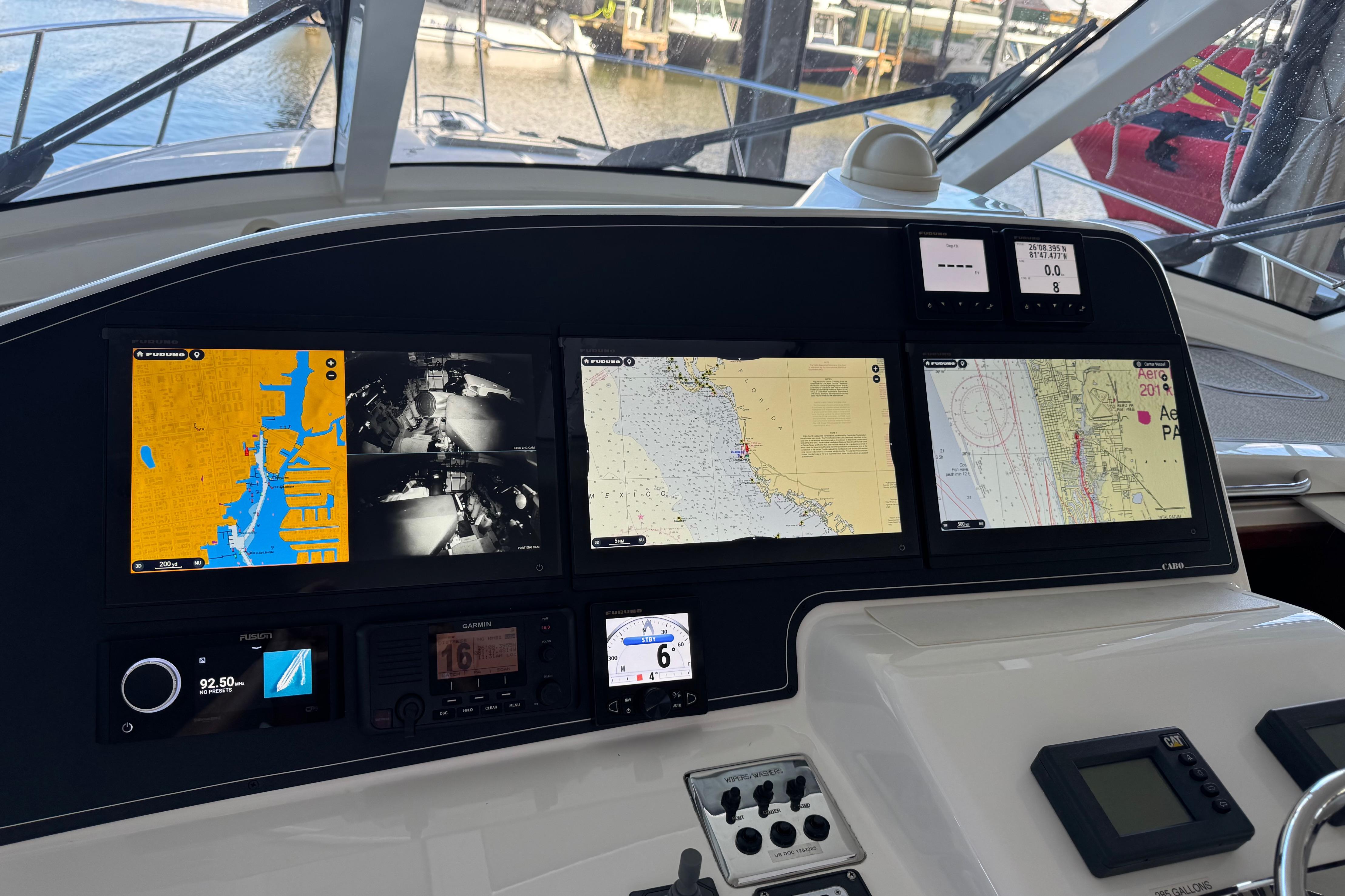 2013 44 Cabo Express with 536 original hours on the CAT 1015 HP engines 32-34 KTS cruise speed. Second owner, freshwater boat for the first owner. In water under cover storage since coming to Florida. Bow and stern thruster with remote, Freedom lift tender system, cockpit freezer. 2024 new Starlink system installed. 2024 All new Furuno electronics installed, three touch screens with new auto pilot, new stereo with remote and new garmin VHF radio. Engines and generator just service in October of 2025. Ready for the next adventure!