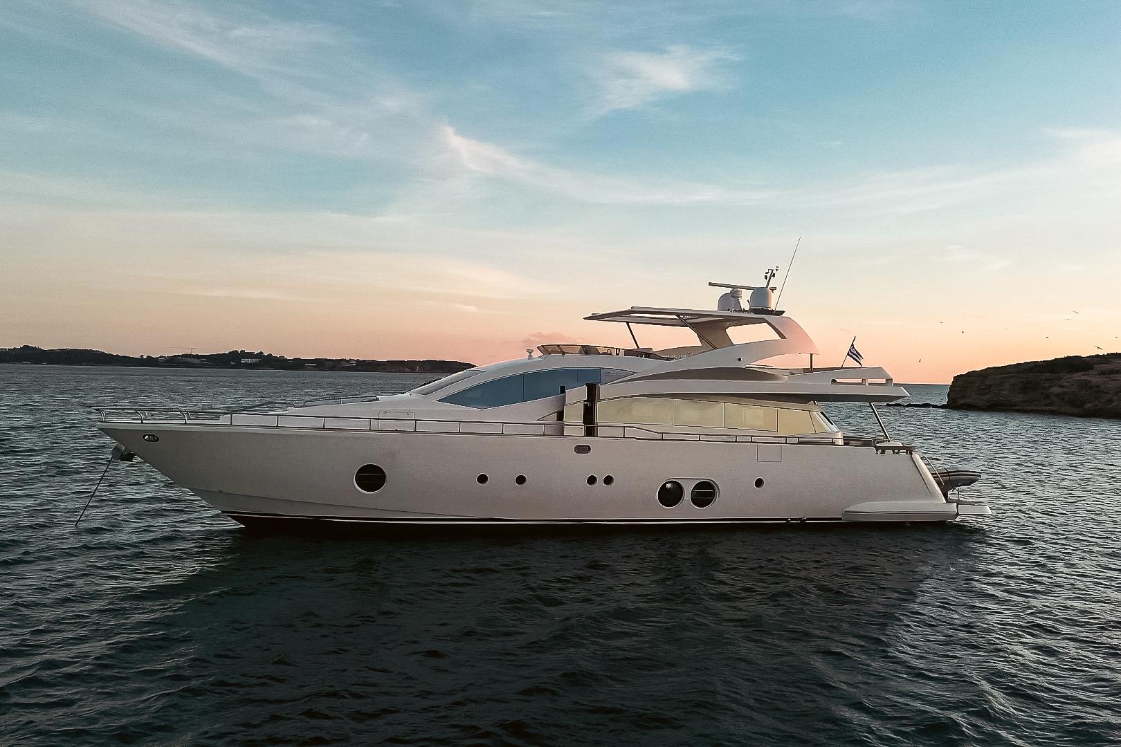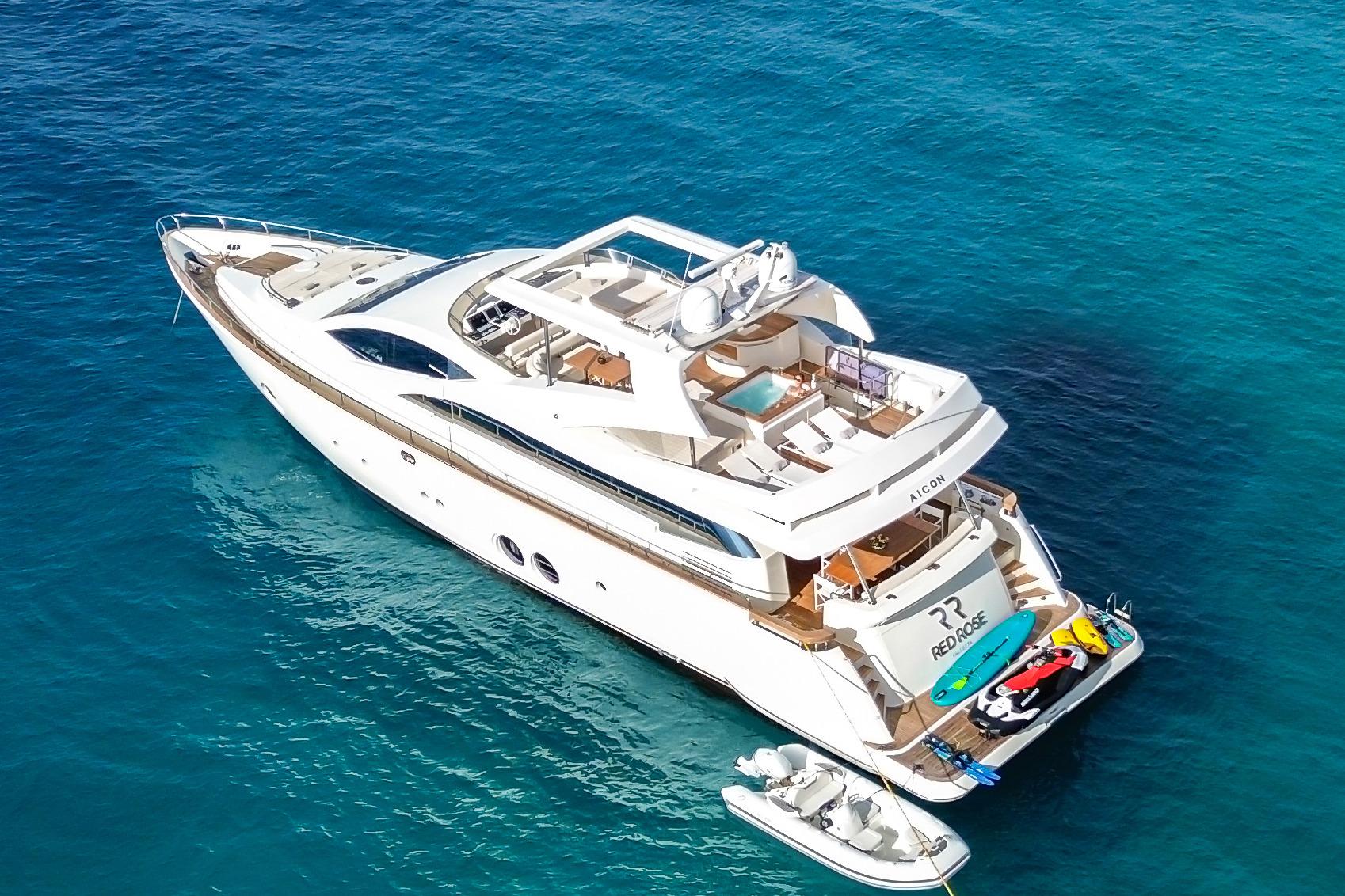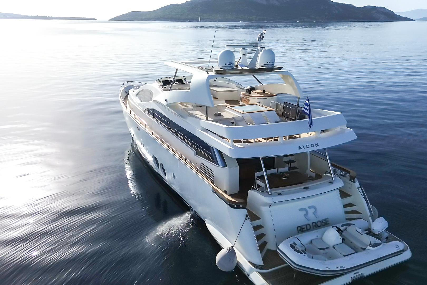 Introducing the magnificent Aicon 85, a stunning motor yacht from 2010 that embodies luxury and performance. With an impressive overall length of 27 meters, this vessel is designed for both comfort and adventure on the water. The deep Vee hull, crafted from durable fiberglass, ensures a smooth and stable ride, perfect for cruising at a speed of 26 km/h, with a maximum hull speed of 30 km/h. Powered by twin CAT C32 inboard engines, each delivering an impressive 1360.9 kW, the Aicon 85 boasts a reliable and robust performance, having logged just 980 hours. Accommodating up to six cabins and eight heads, this yacht provides ample space for relaxation and entertainment. The thoughtful features and elegant design make the RED ROSE an exceptional choice for those seeking a blend of sophistication and adventure on the open seas.
