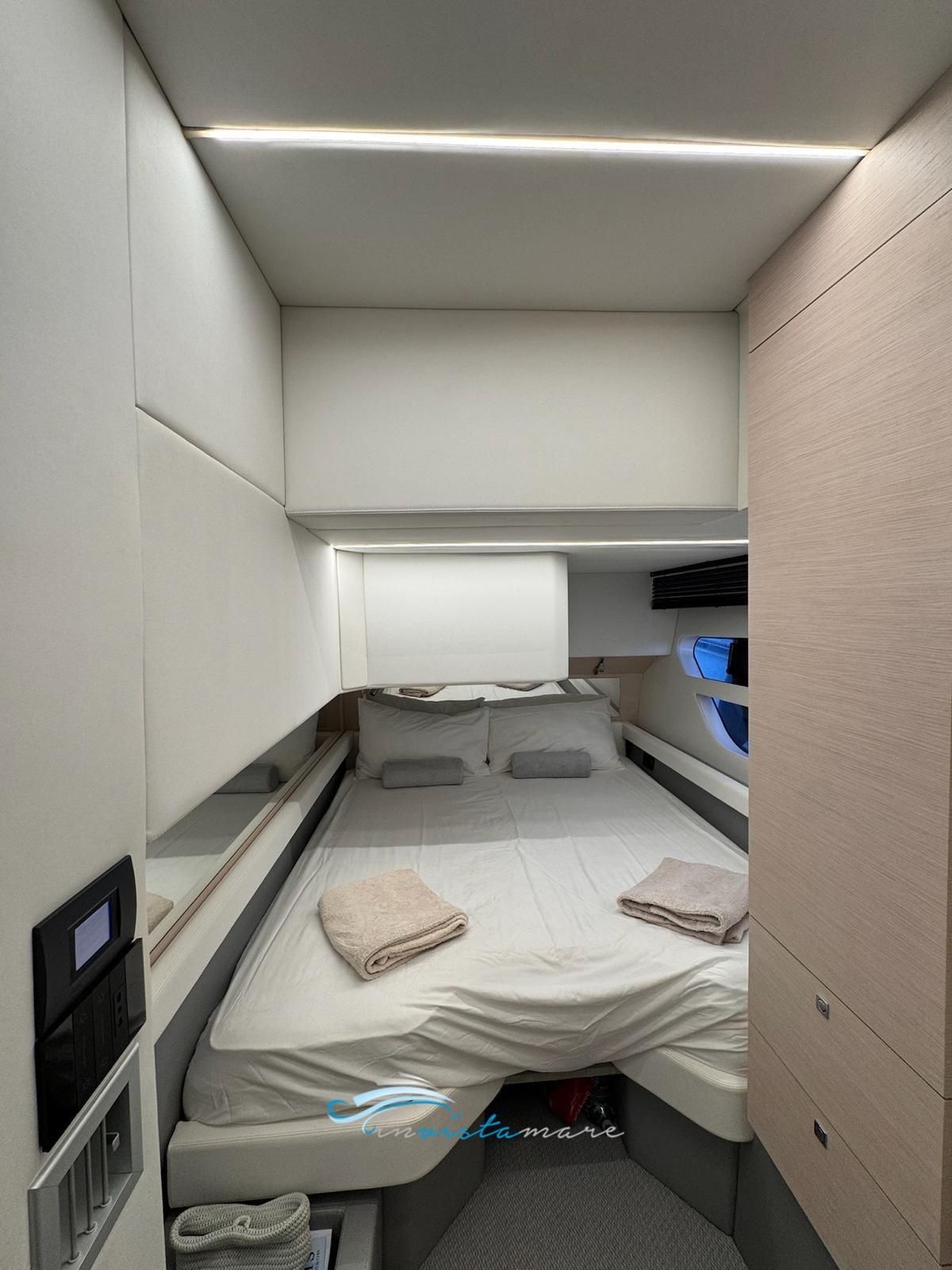 Doppia scaletta a scomparsa, cucina esterna (con lavello, frigo ,piastra ad induzione 4 fuochi e frigorifero), parabrezza frontale laterale in cristallo, pulpito inox con draglia e bitte prua/poppa, pavimento bagni SICIS, sistema ACP protezione correnti galvaniche Volvo, 2 Glass Cockpit 12', Interceptor Volvo con Auto Trim + Cruiser control, caricatori wireless smartphone (uno per ogni cabina), caricabatterie dedicato solo al generatore, catena inox 60 metri diametro 12 mm, telo copricucina, antivegetativa, verniciatura hard top grigio metallizzato, ingresso carburante e acqua sdoppiato da entrambi i lati