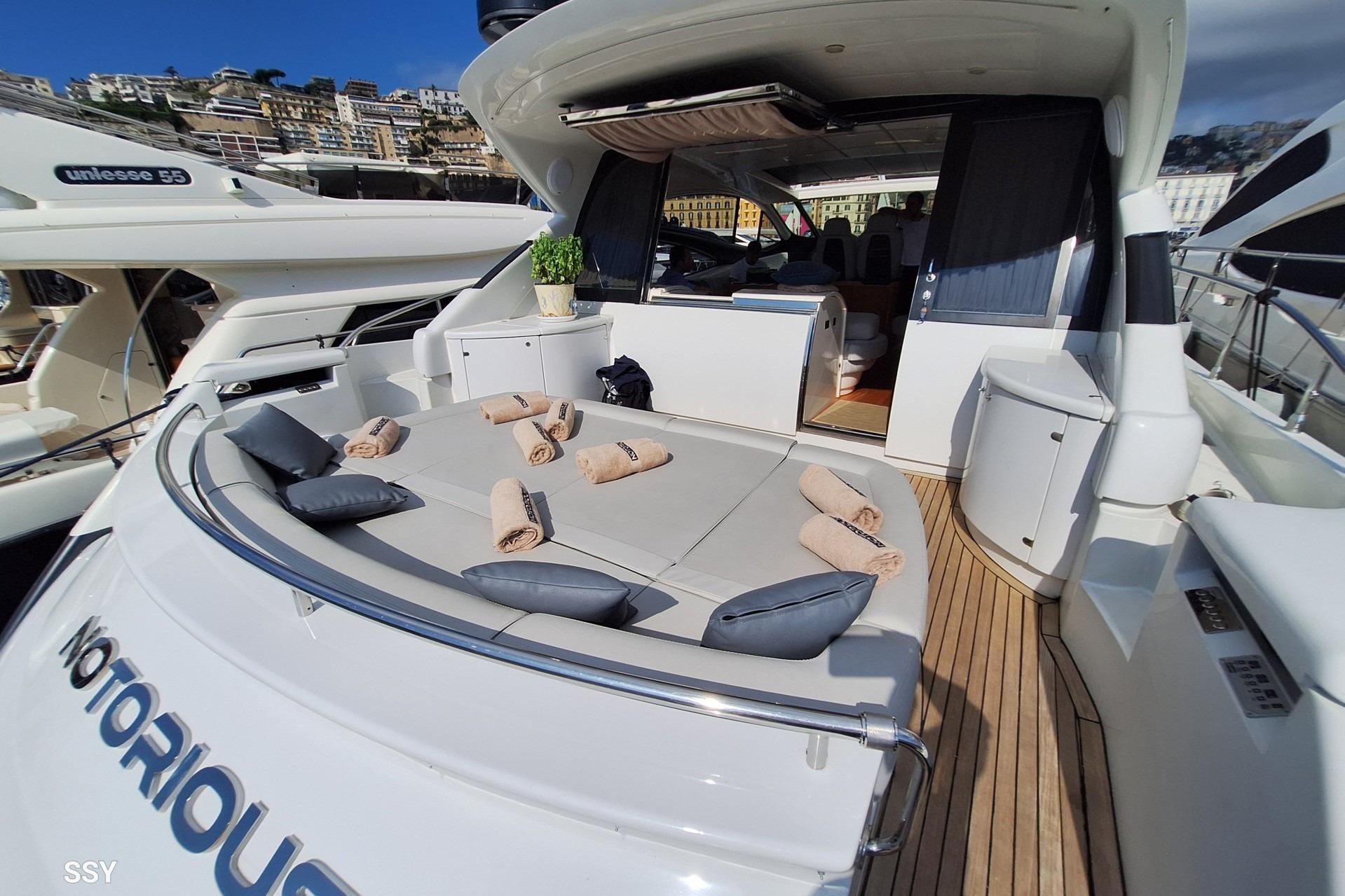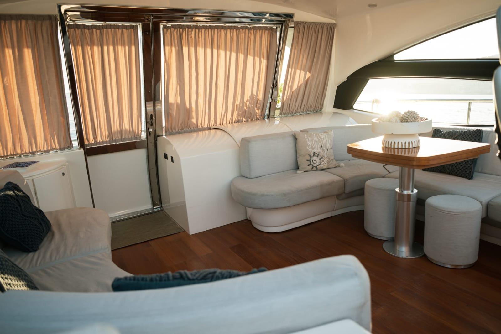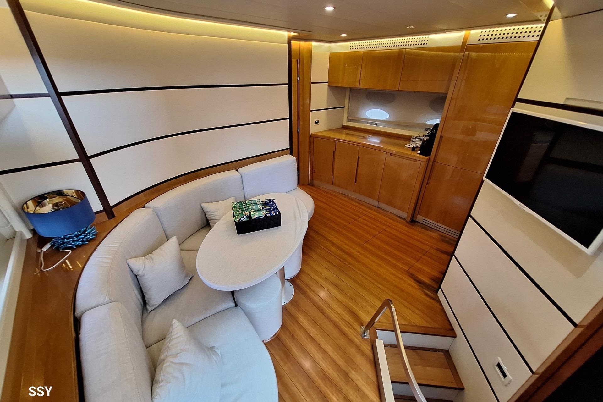 Bright and spacious saloon, enhanced by large side windows, furnished with comfortable sofasand a well-integrated dining area. Central helm station with excellent visibility, equipped with twoelectrically adjustable Besenzoni seats. Onboard entertainment includes a Sharp Aquos TV andFusion Hi-Fi system.Fully equipped and functional galley featuring cooktop, Bosch dishwasher, full-height fridge andfreezer, and oven.