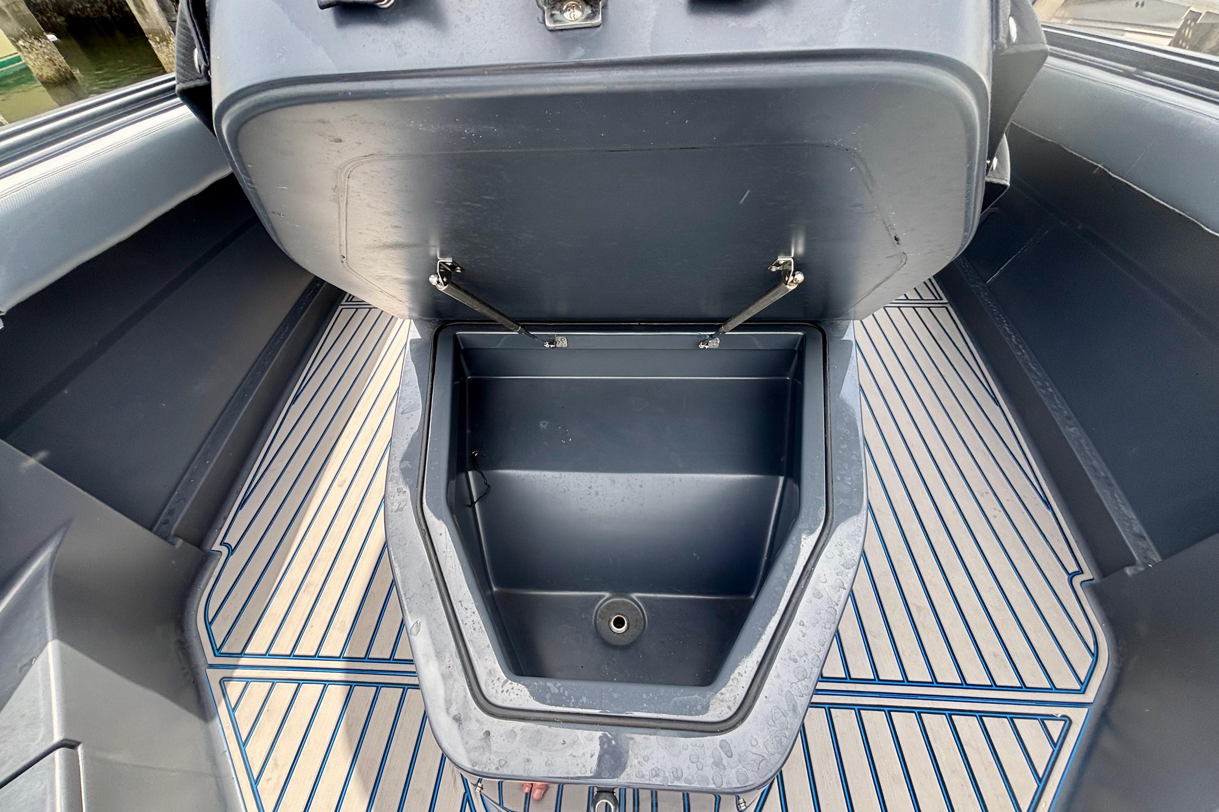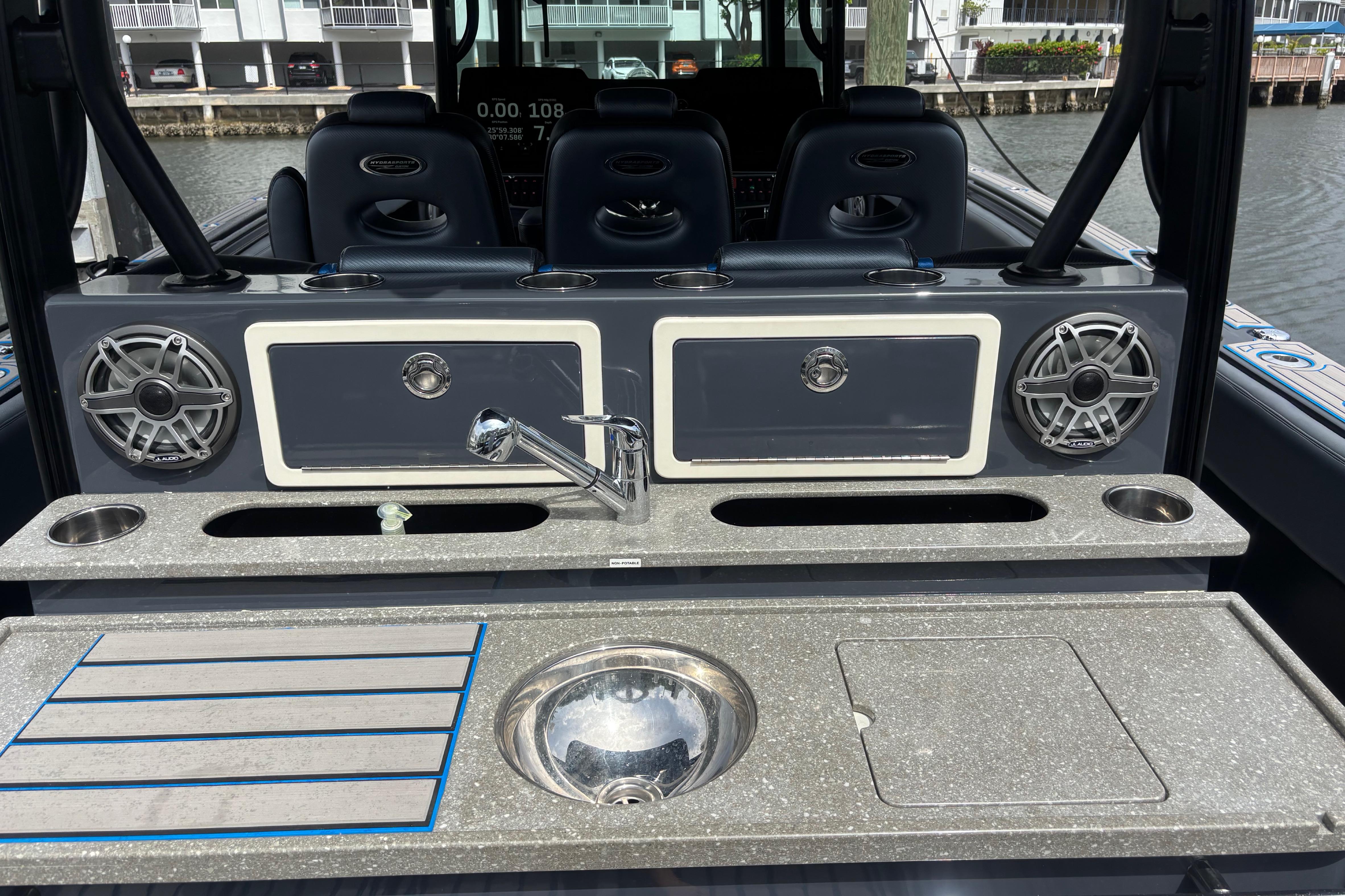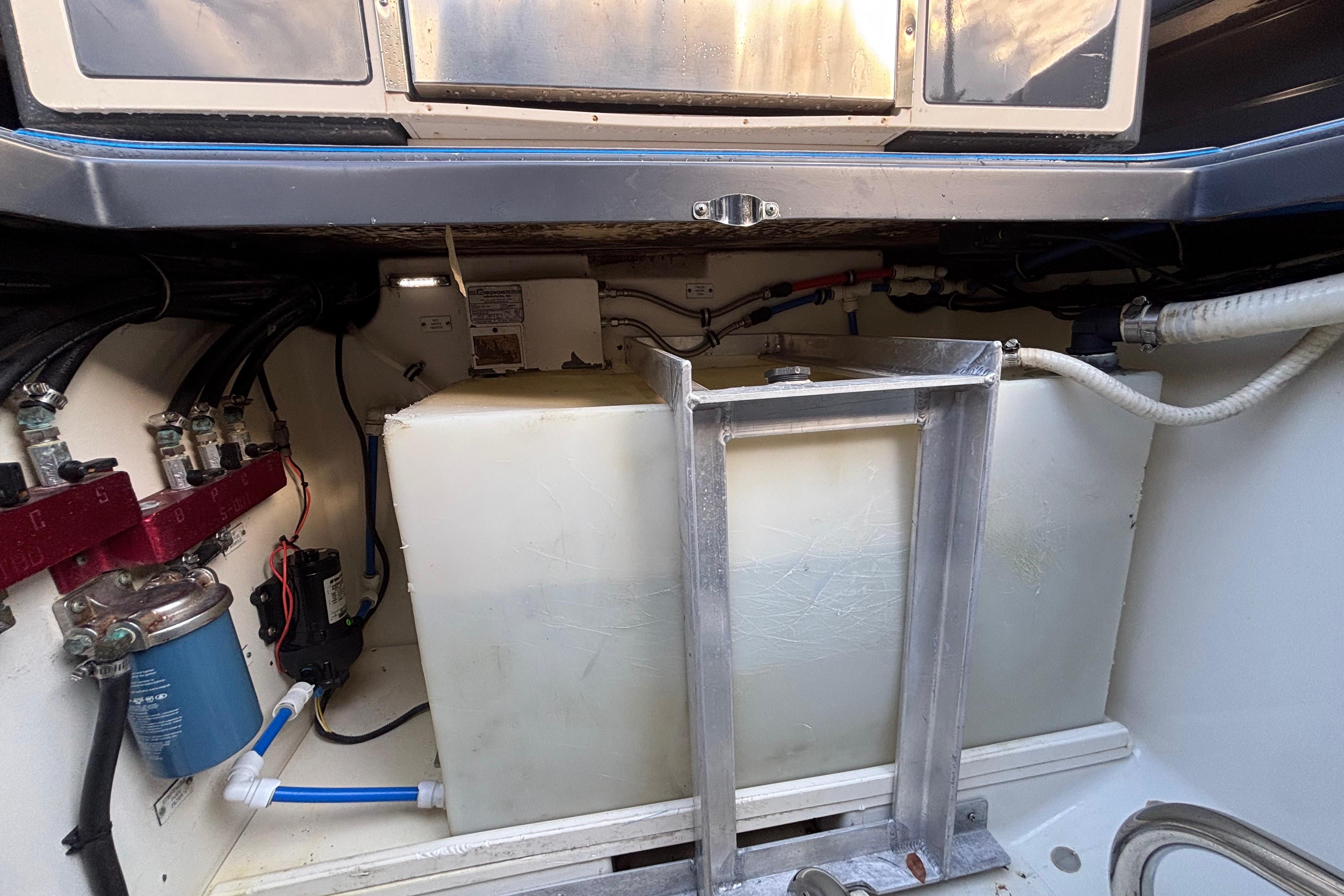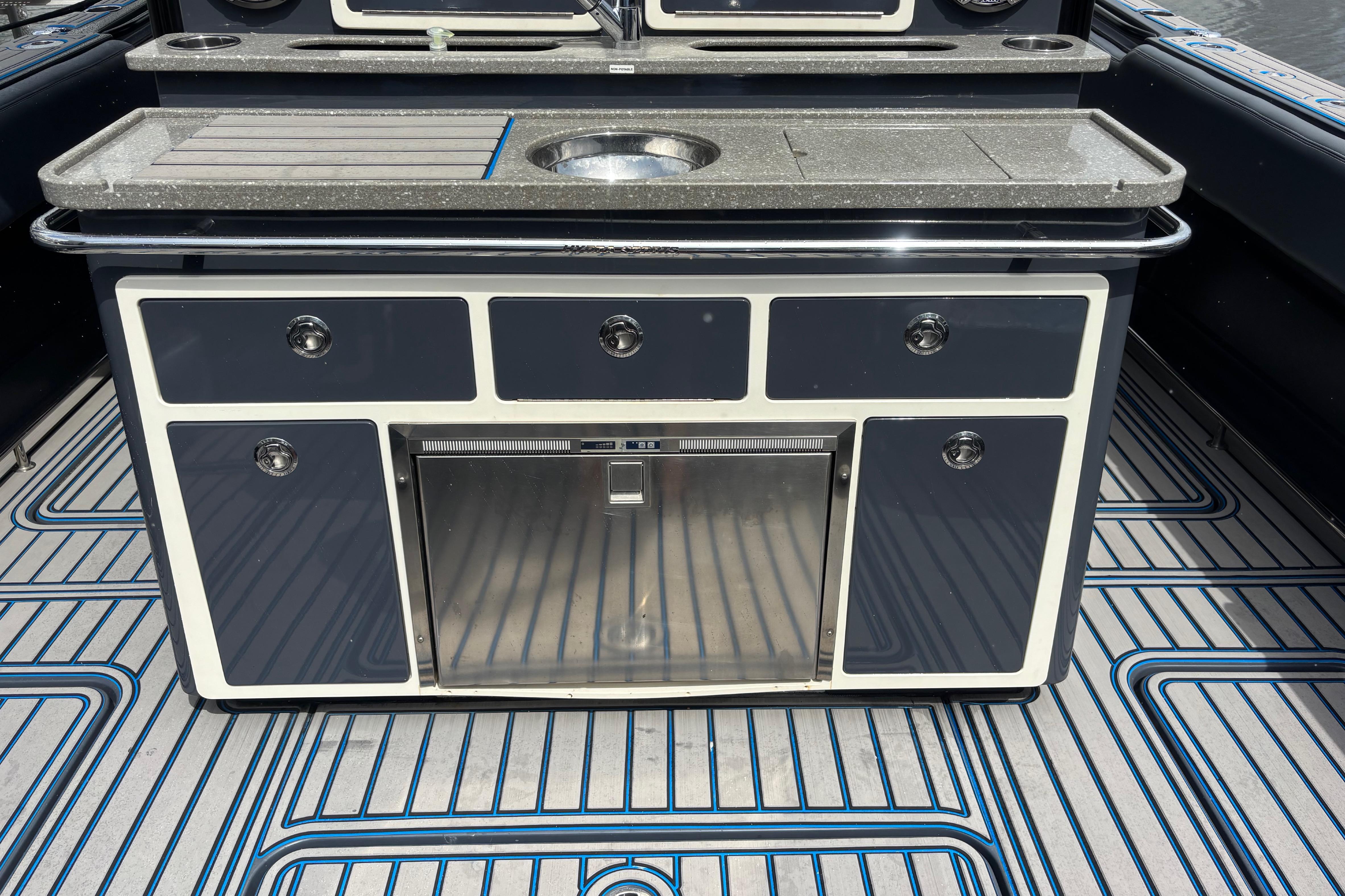 Tackle prep center with freshwater sink and Isotherm stainless refrigerator