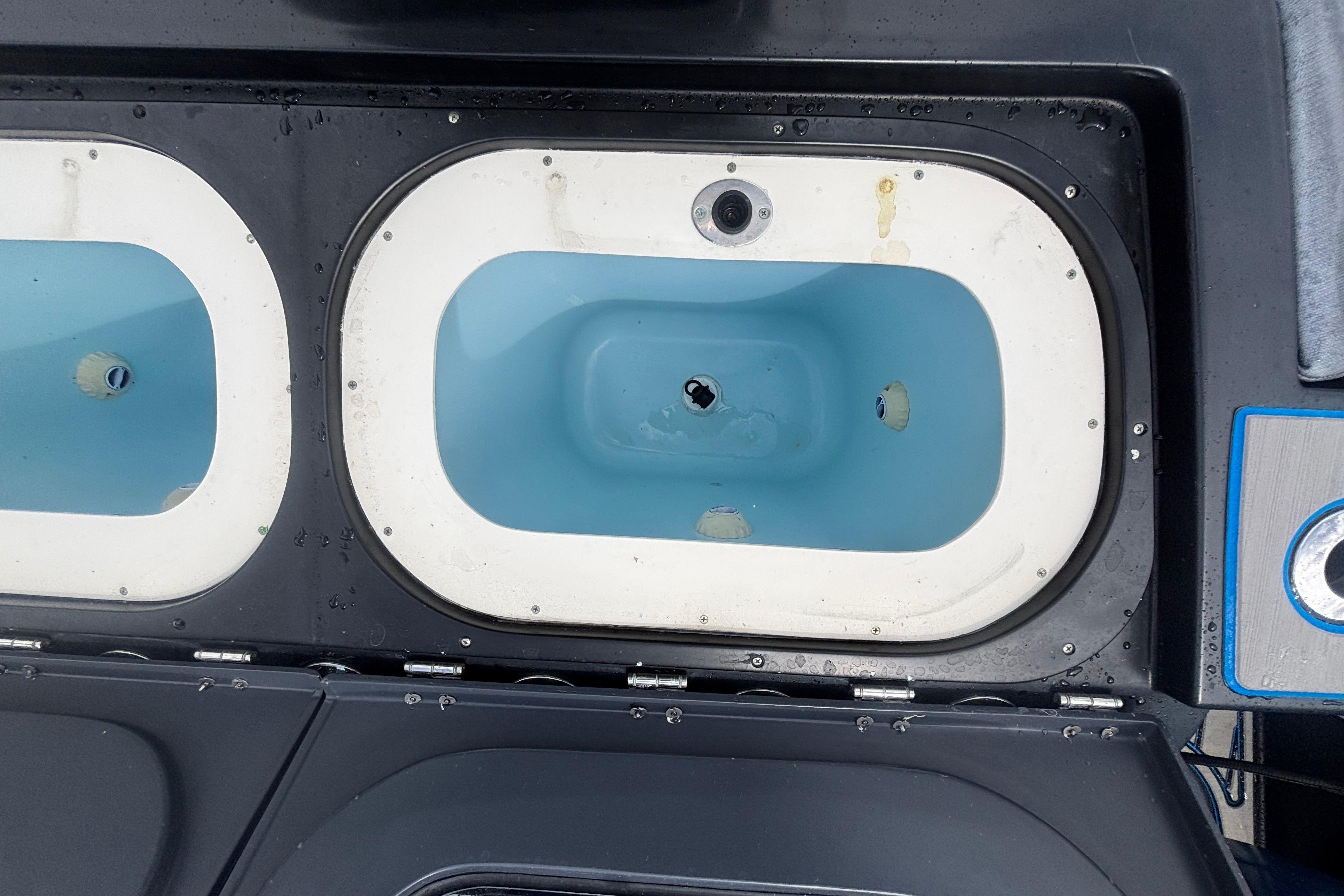 Dual 45-gallon transom live wells with clear acrylic HydraSports-branded lids