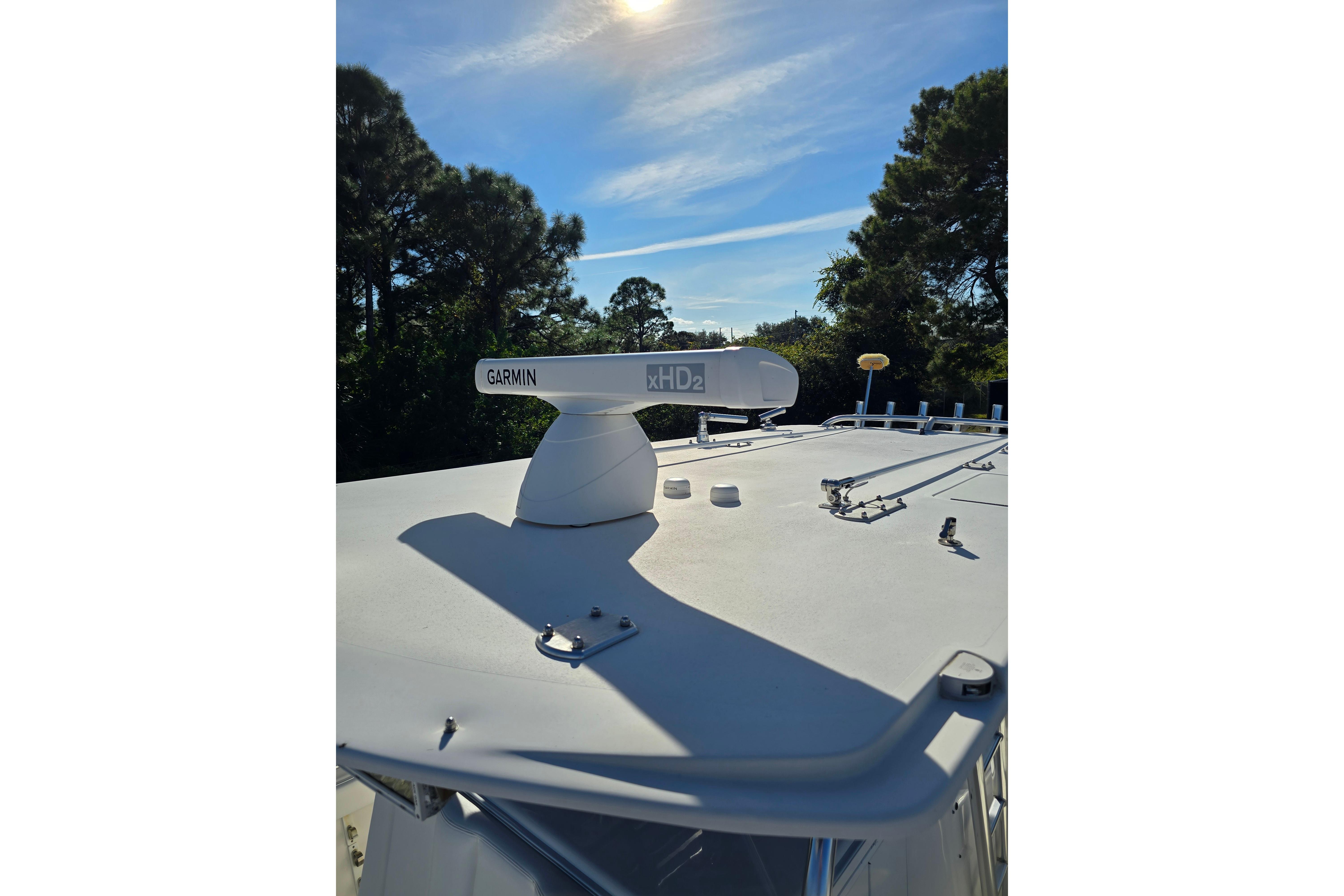 Newer Garmin electronics · radar-ready · JL Audio premium stereo · bow thruster