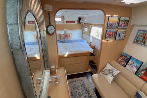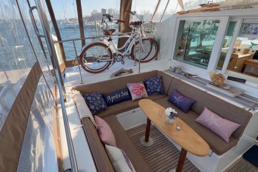 The galley faces the cockpit, keeping the cook part of the action, with generous counter space, storage, and seamless indoor-outdoor flow via sliding doors and a glass bay window—perfect for entertaining. A forward-facing nav station with panoramic views offers safe, dry night watches.