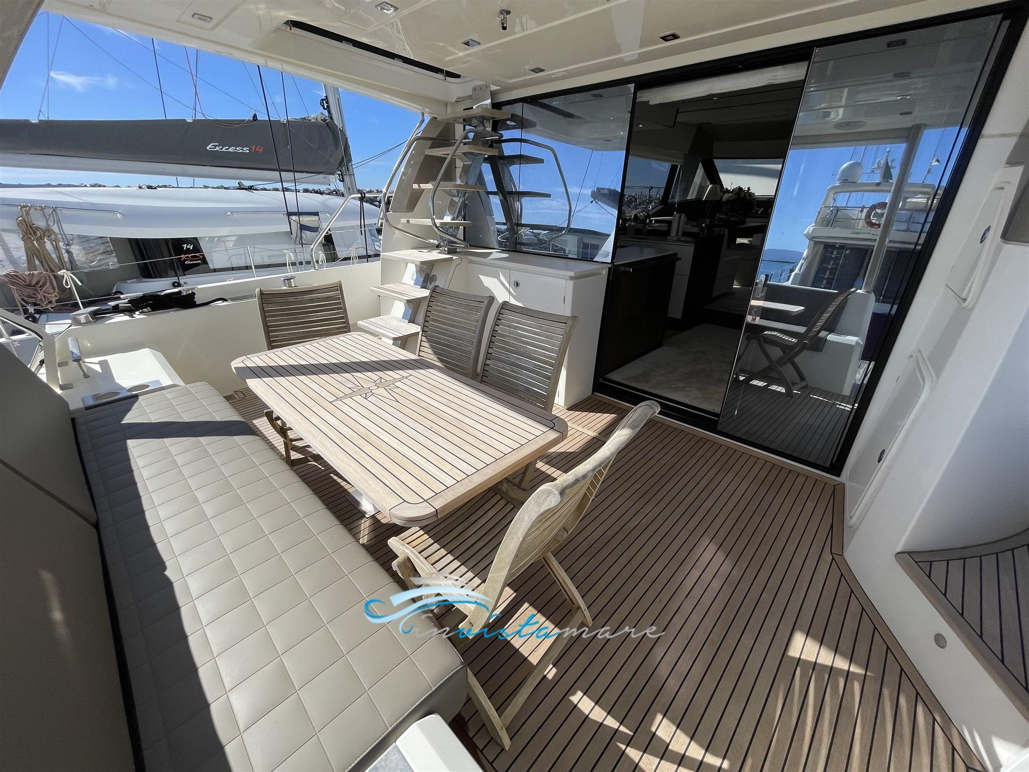 Allarme fumo/gas, Allarme motore, Allarme sentina, Ancora, Autoclave, Batterie, Cavo corrente di banchina, Doppia timoneria, Faro orientabile, Flap idraulici, Impianto antincendio, Lavandino nel Pozzetto, Luci di cortesia, Luci subacquee (di carena), Piattaforma (Affondabile), Pompa di sentina automatica, Ponte in teak, Porta ingresso, Presa 220V banchina, Presa acqua banchina (Con addolcitore e cavo di 10 m), Raddrizzatore, Selle per Tender, Stabilizzatori (Seakeeper), Tavolo pozzetto (x 6 comodo), Tavolo Salone Abbattibile (Modificato estenzione e abbassamento), Tromba, T-Top (Nel Fly con Tenda elettrica), 2 Winch tonneggio di poppa.