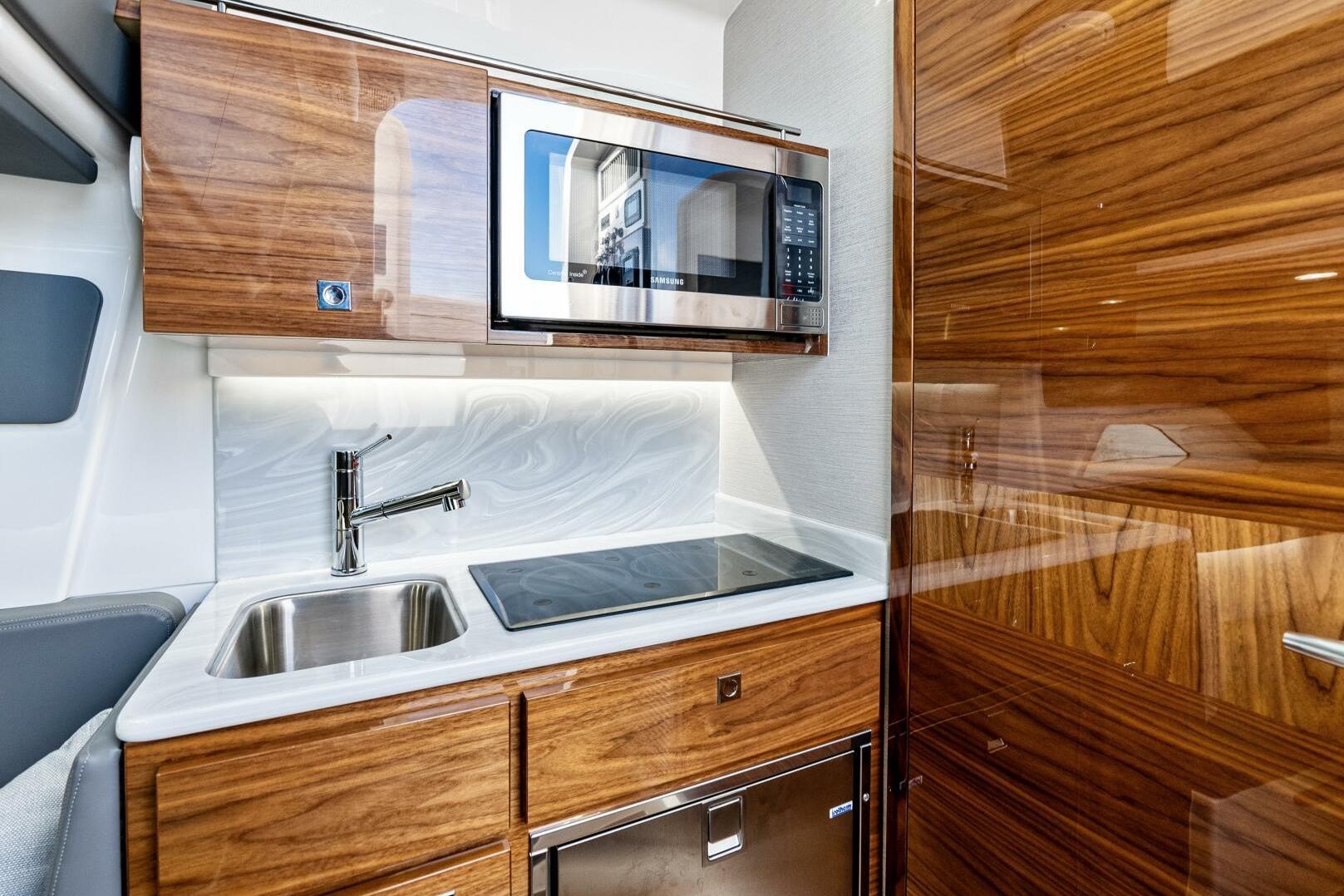 - Microwave located in upper galley cabinet