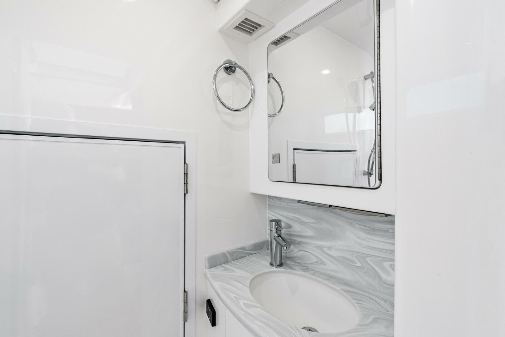 - Head compartment enclosed with molded-in vanity with freshwater sink and faucet, toilet, exhaust fan, and shower head fixture