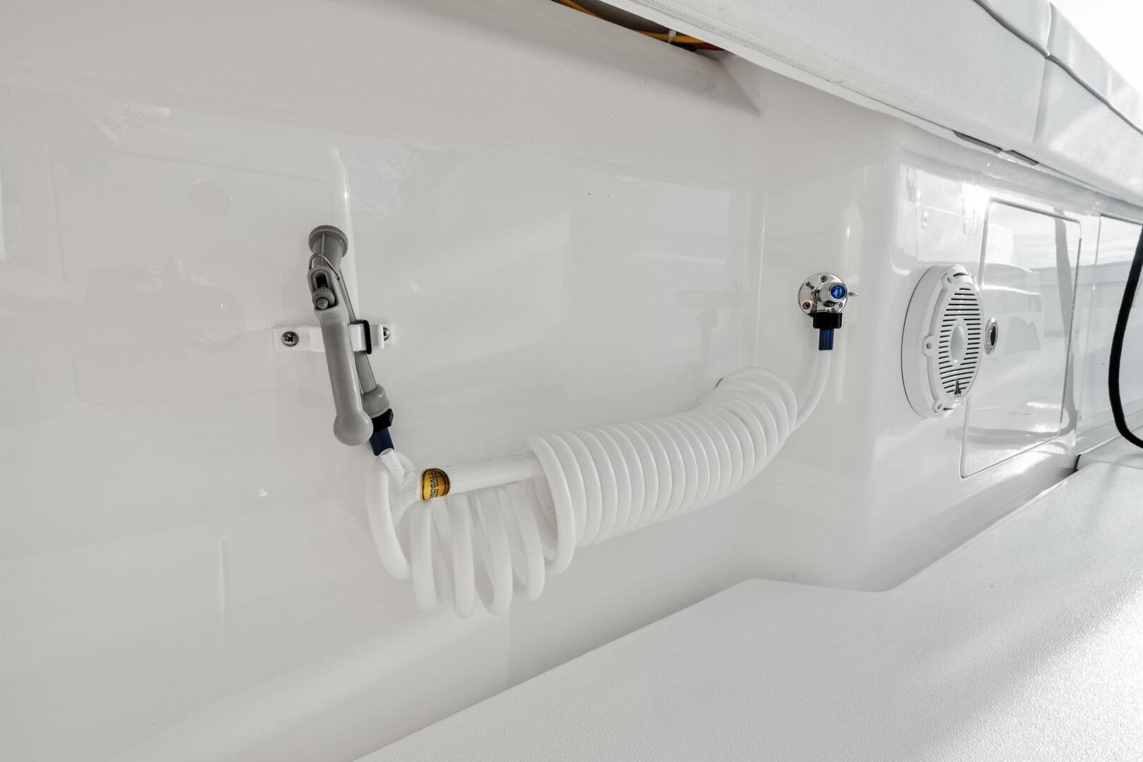 - Powder-coated aluminum coiled hose holder mounted under gunnel