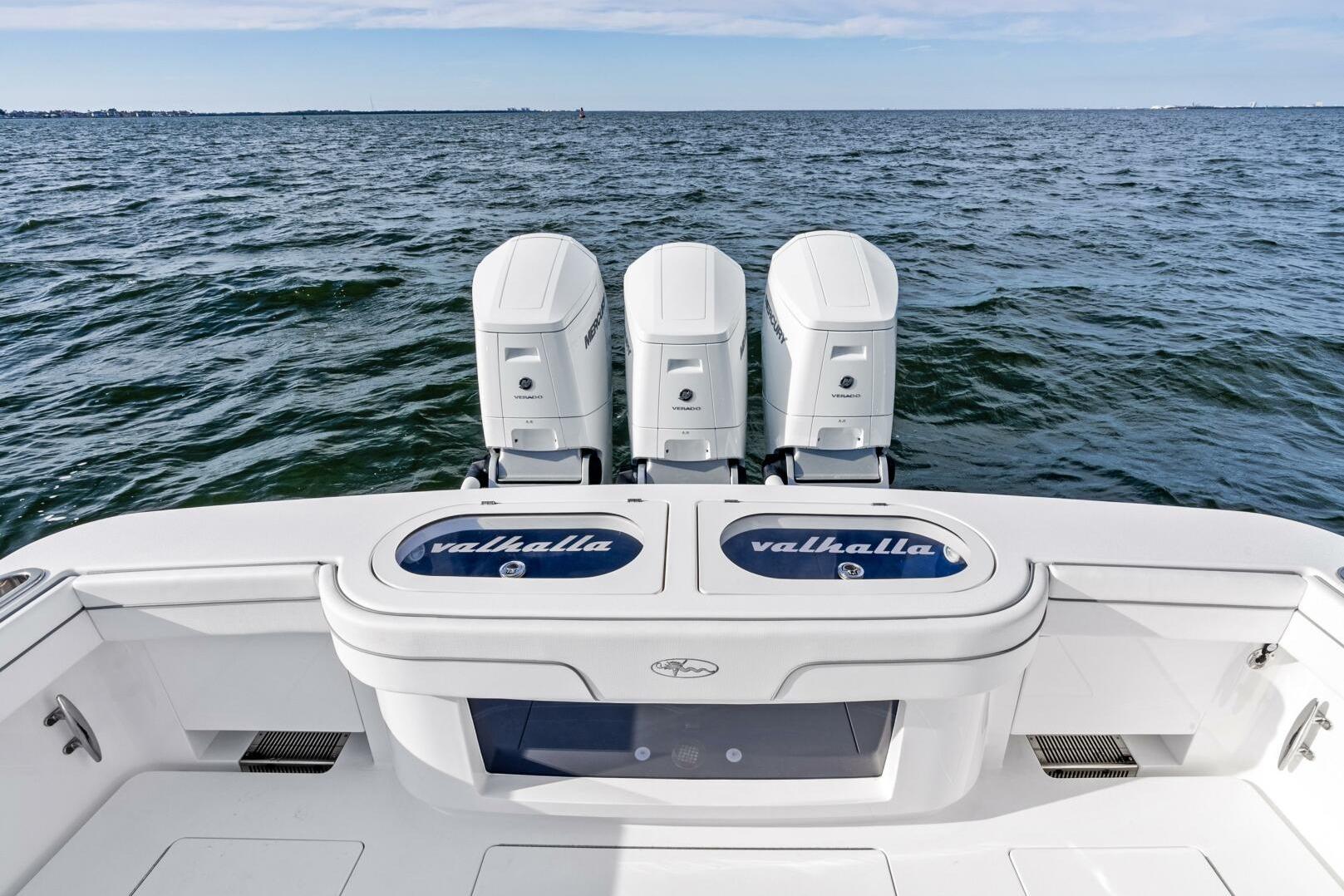 This boat was spec’d with all the popular options and in a great color combination. It features the preferred triple 600 Mercury power, attractive Kingston grey hull color, Garmin electronics and full release helm chair package. It is now on display at the Miami International Boat Show. The next available new 46 Valhalla isn't available until November of this year, but you can have this one immediately following the Miami Show. Please call for details. Sistership photos shown but almost identical except for a slightly darker grey hull color.