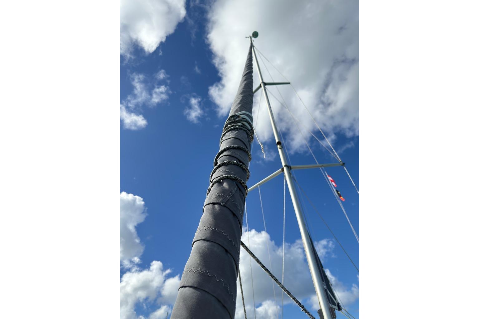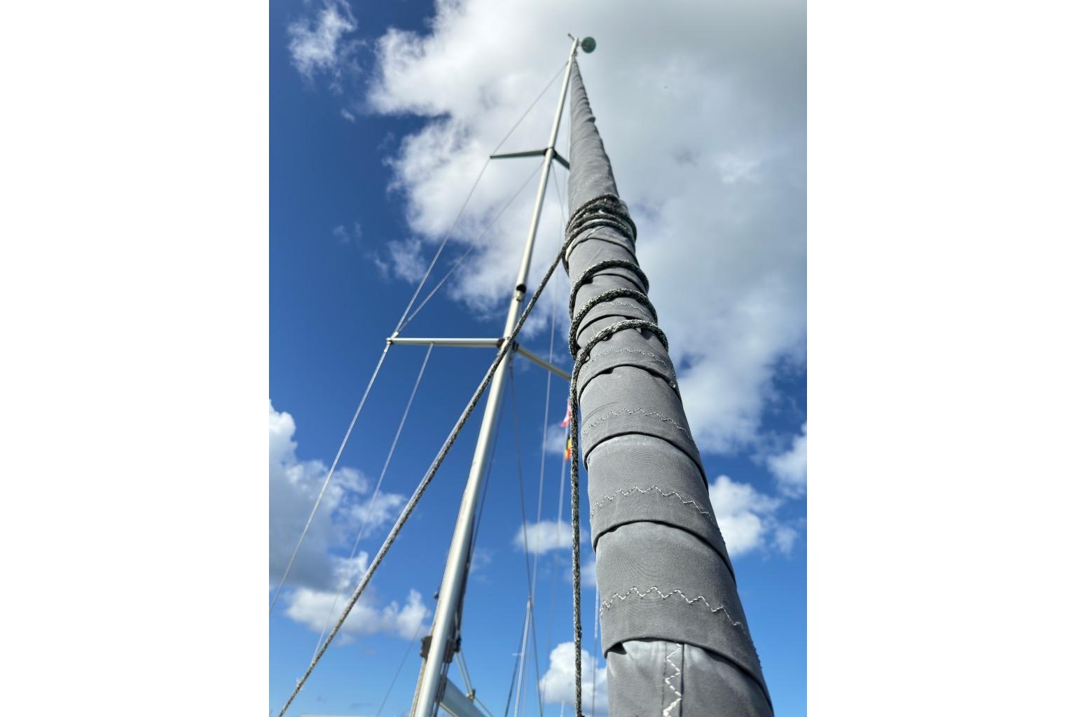 Aluminum mast with serviced standing rigging.