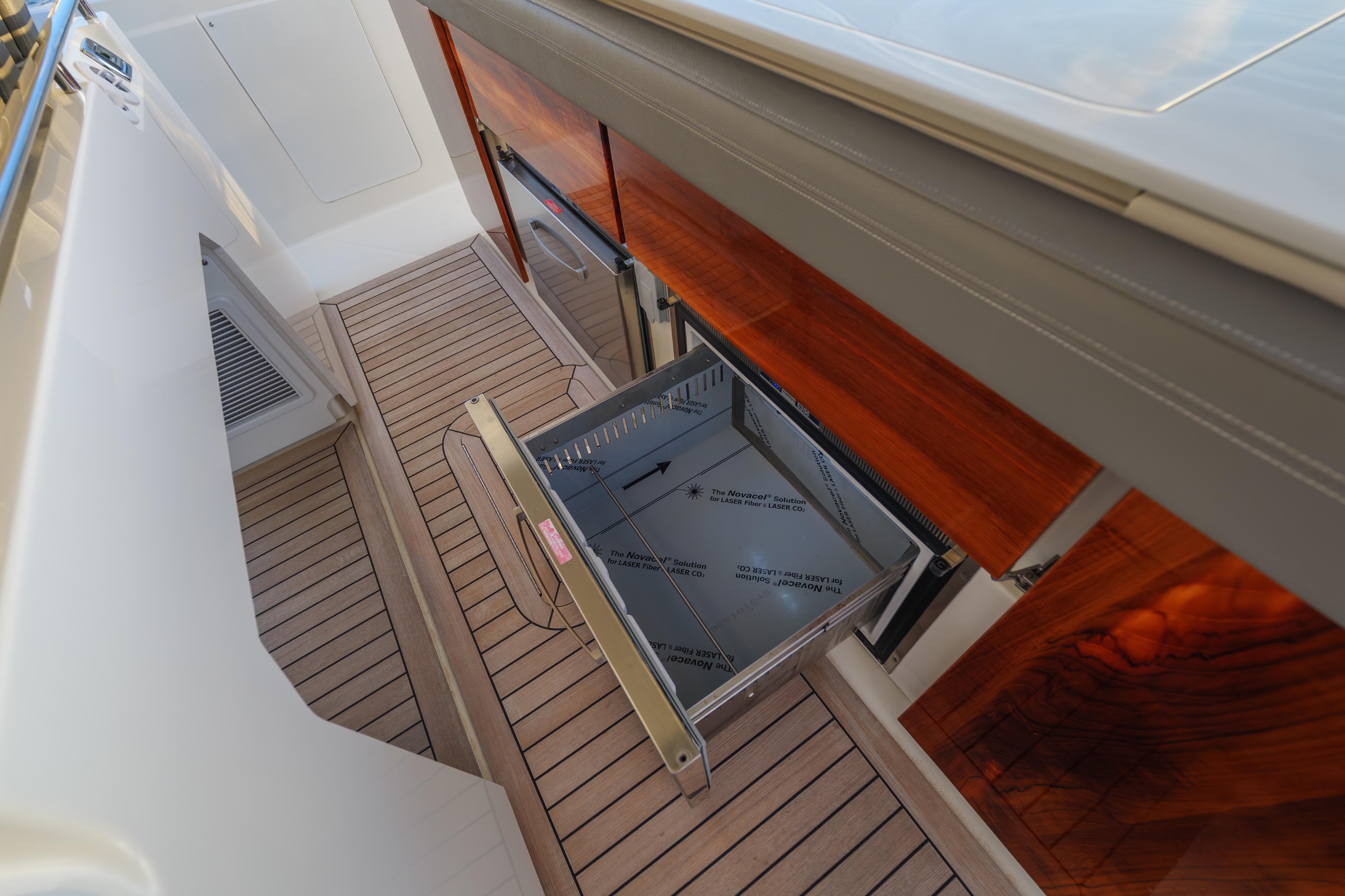 On deck, the 43 LS offers multiple social and entertaining zones with an open, flowing layout. The cockpit is designed for effortless hosting, featuring generous seating, excellent visibility, and a well-appointed galley area beneath the hardtop—perfect for day cruising or evening gatherings. The helm provides outstanding ergonomics and visibility, while the forward seating and aft lounge areas create inviting spaces for guests to relax underway or at anchor.