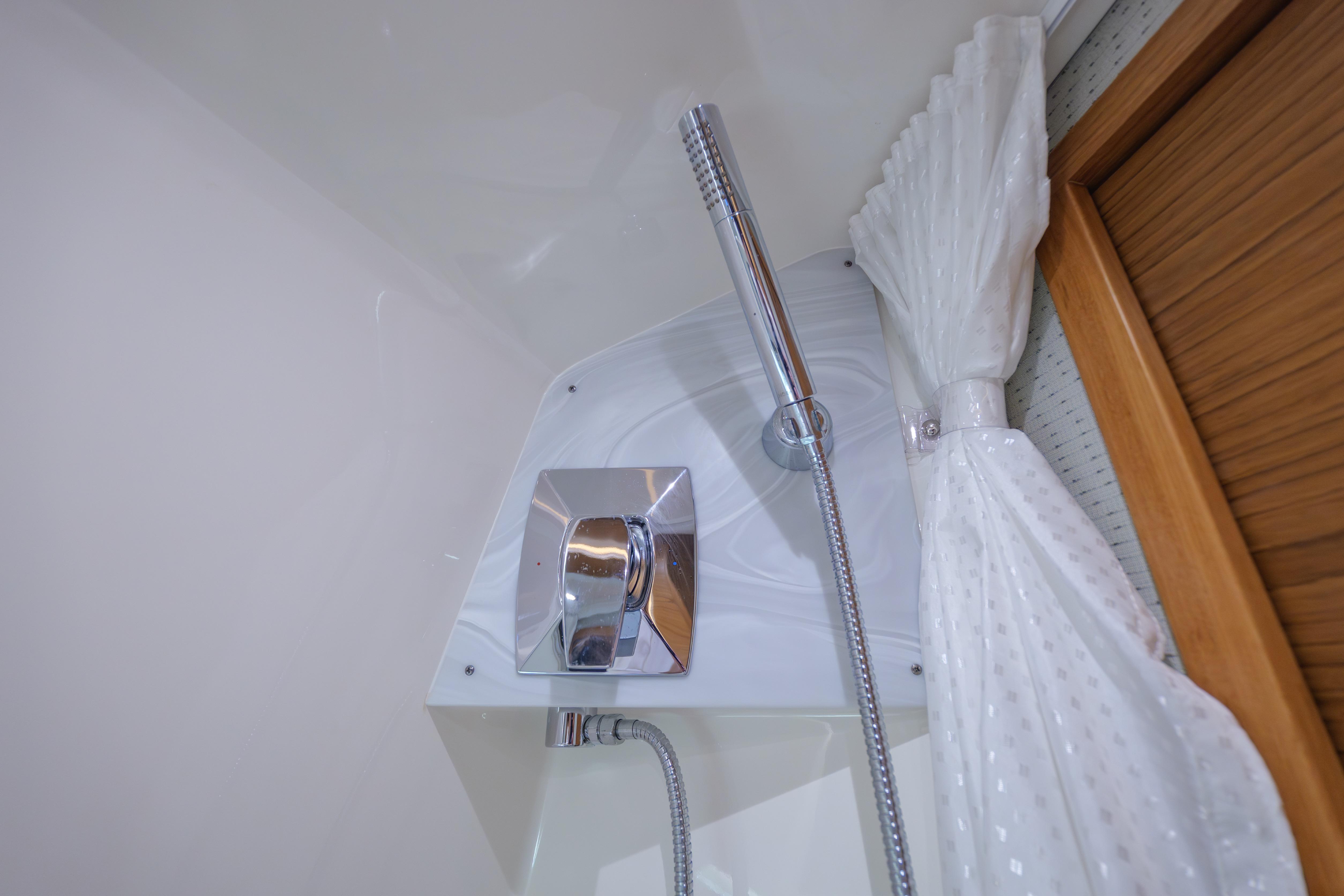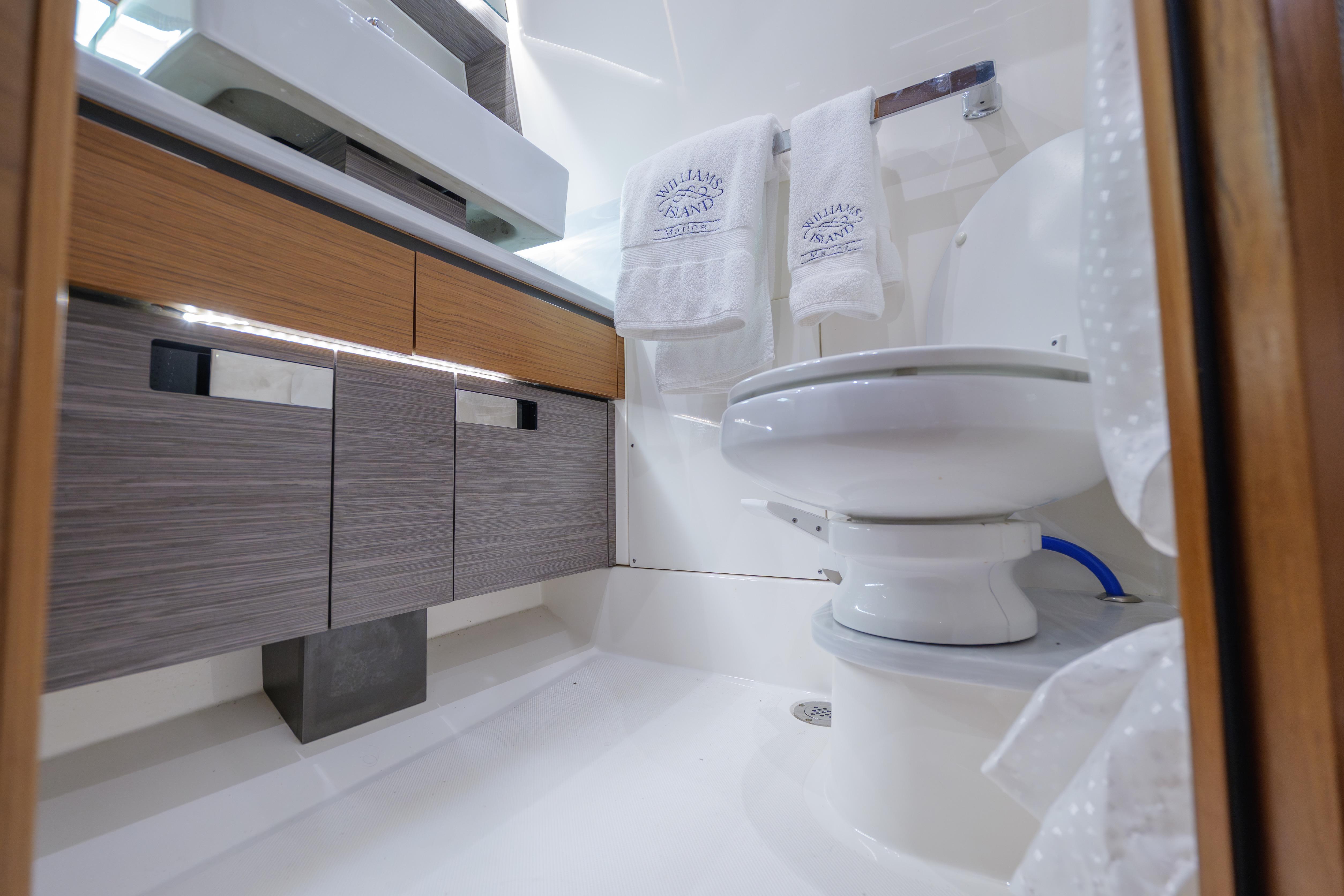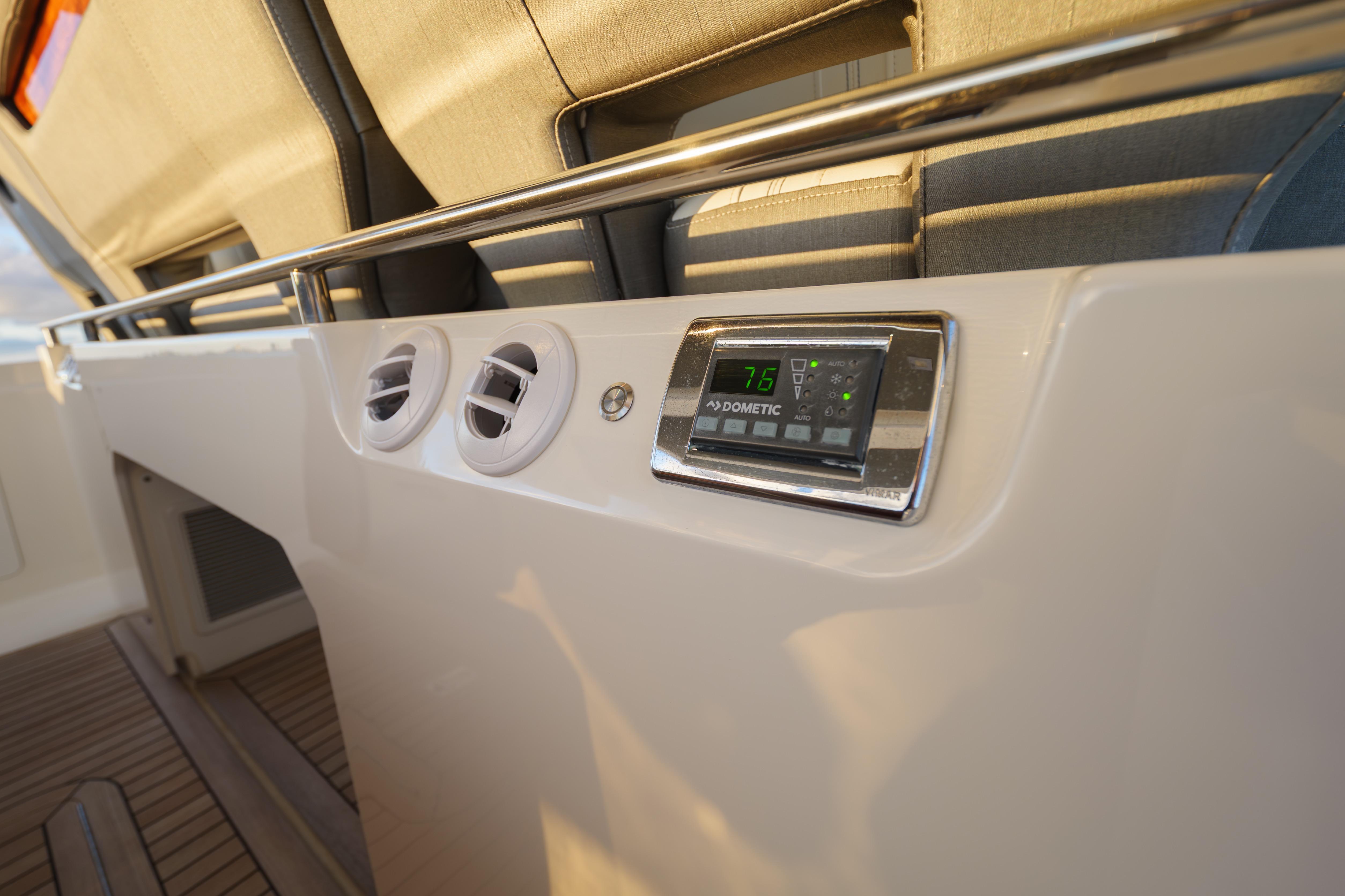 The private head is beautifully finished and yacht-grade throughout, complete with a full shower, solid-surface countertop, ceramic sink, toilet, and proper ventilation. Air conditioning and reverse-cycle heat ensure year-round comfort below deck, making this vessel just as enjoyable for weekends aboard as for extended cruising.