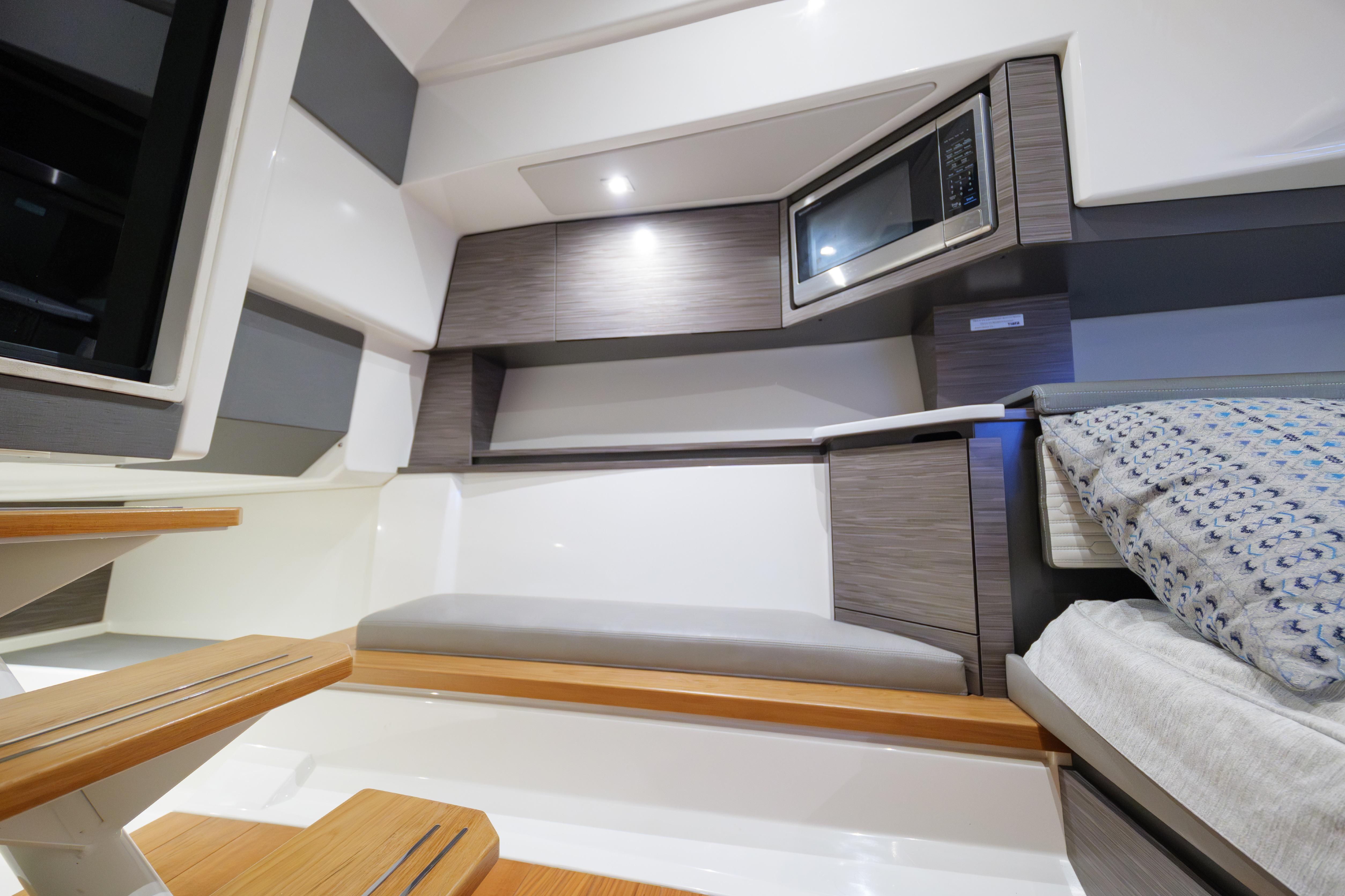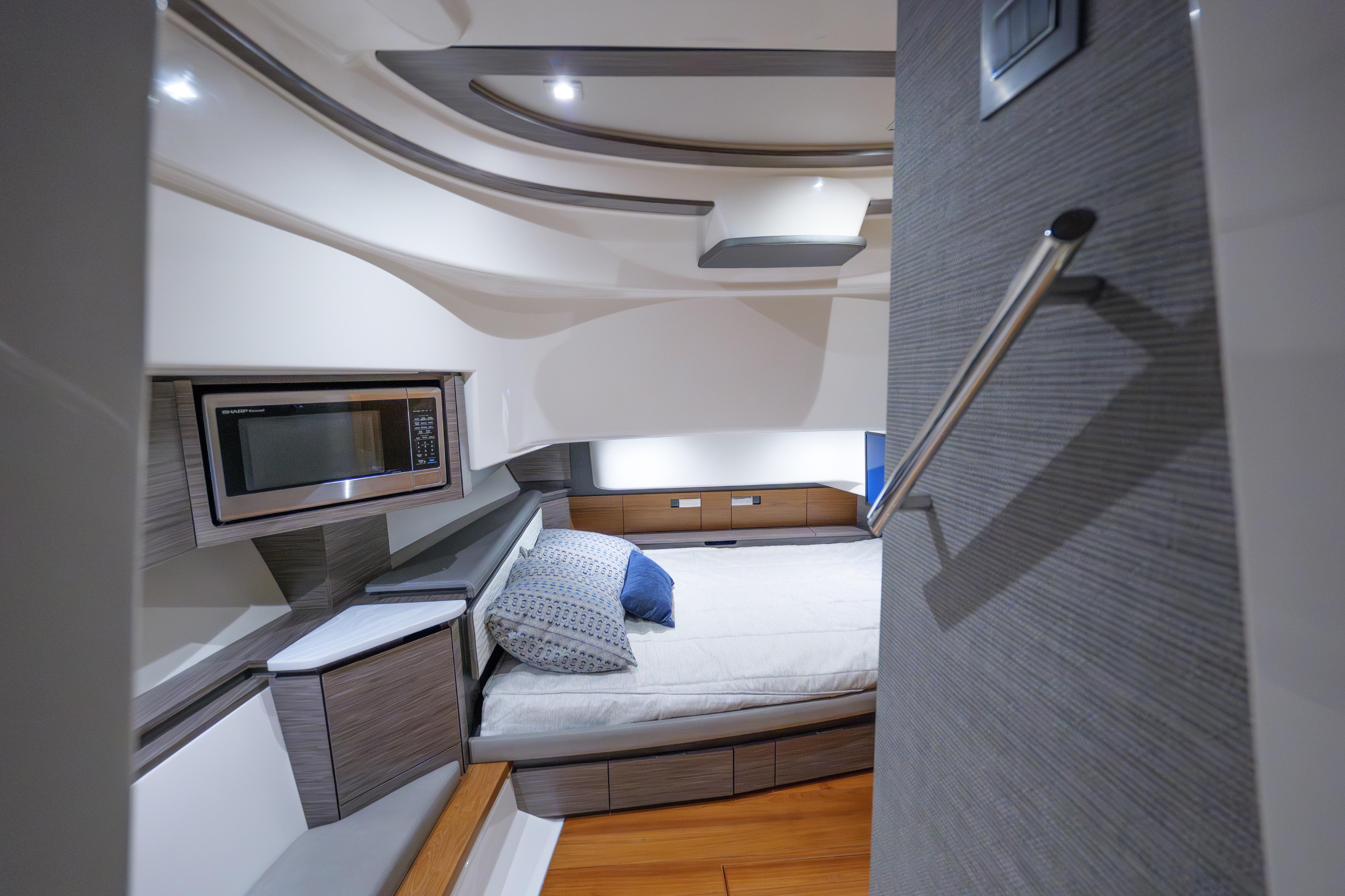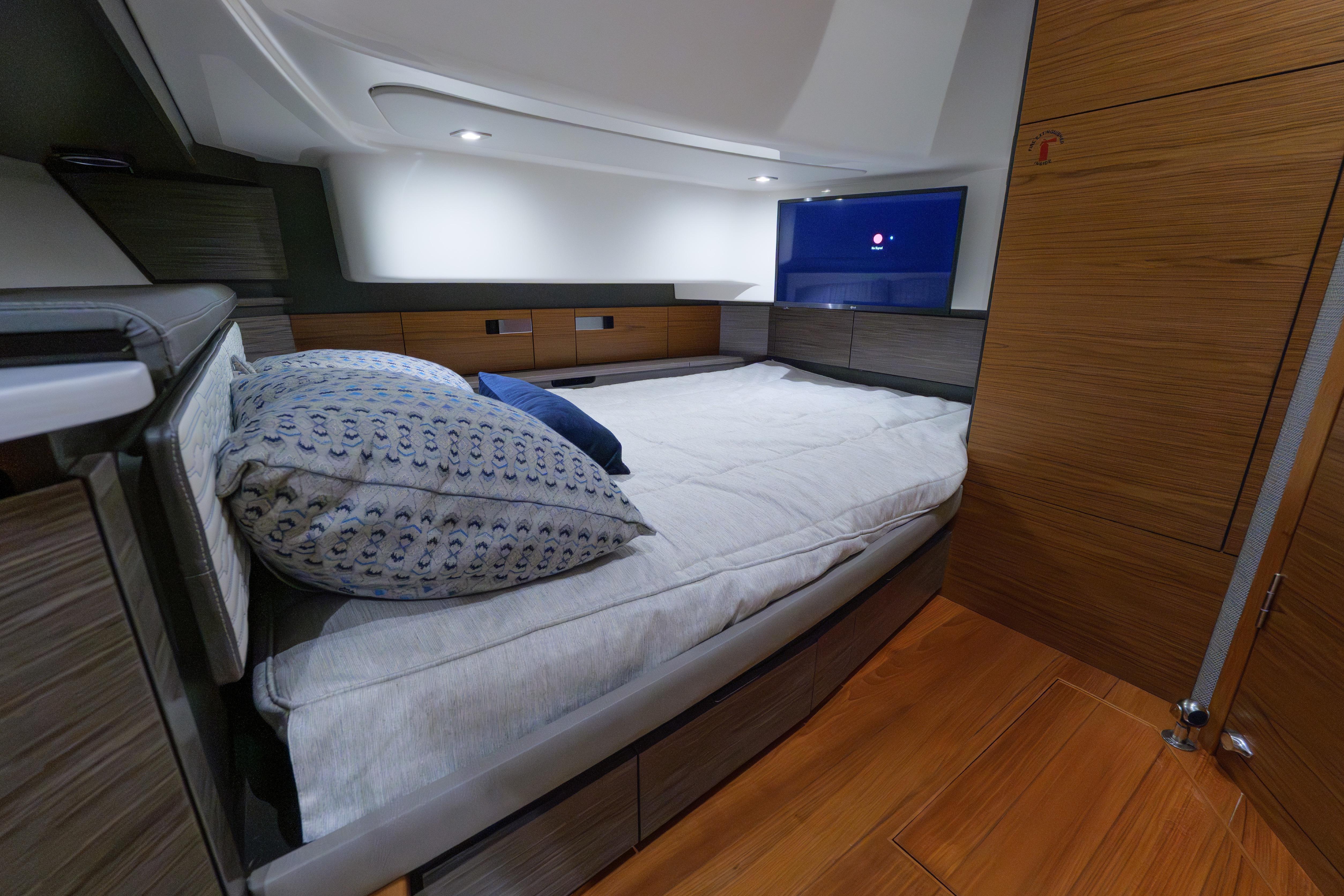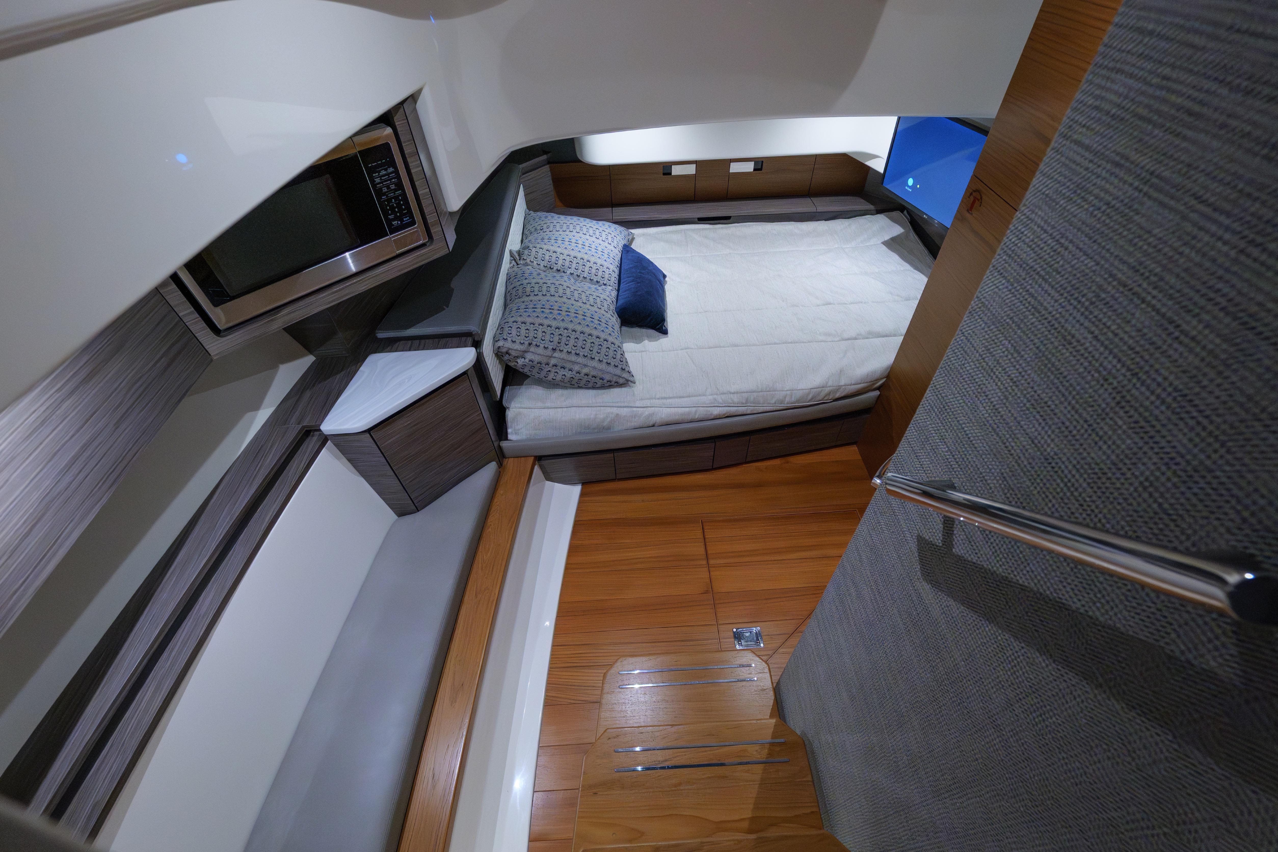 Below deck, the interior showcases Tiara’s renowned craftsmanship and thoughtful design. The space is warm, refined, and exceptionally well laid out for a yacht of this size. High-quality teak joinery, premium materials, and excellent sound insulation create a quiet and comfortable retreat. The forward stateroom features a spacious full berth with quality mattress, ample storage, and elegant finishes. A separate aft-cabin sleeping area provides additional accommodations, allowing for comfortable overnight stays for owners and guests.