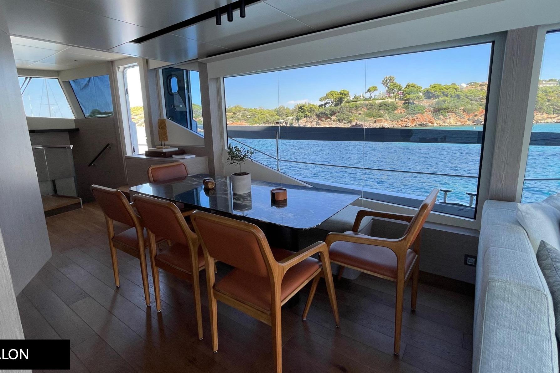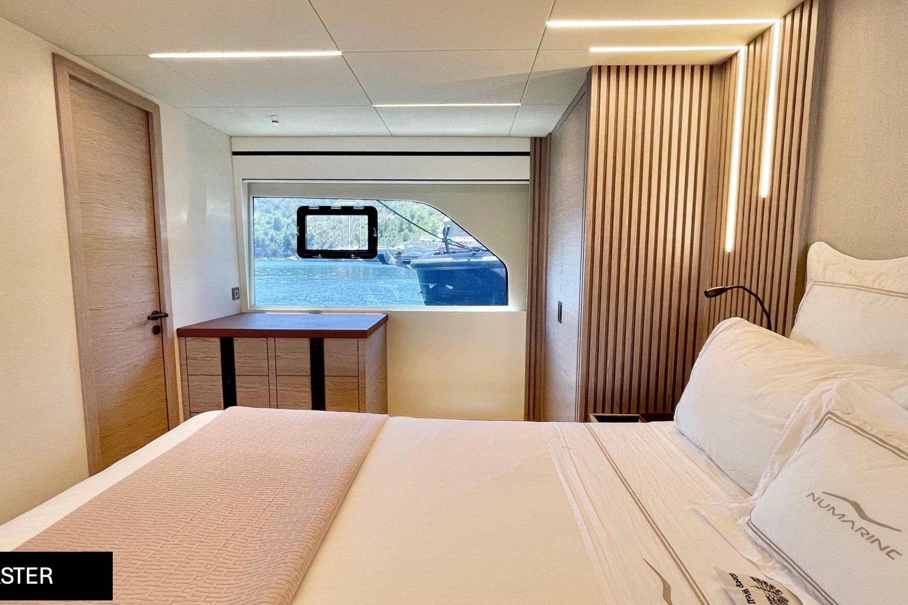 Owner's cabin with panoramic sea views and minimalist luxury is a full-beam sanctuary.