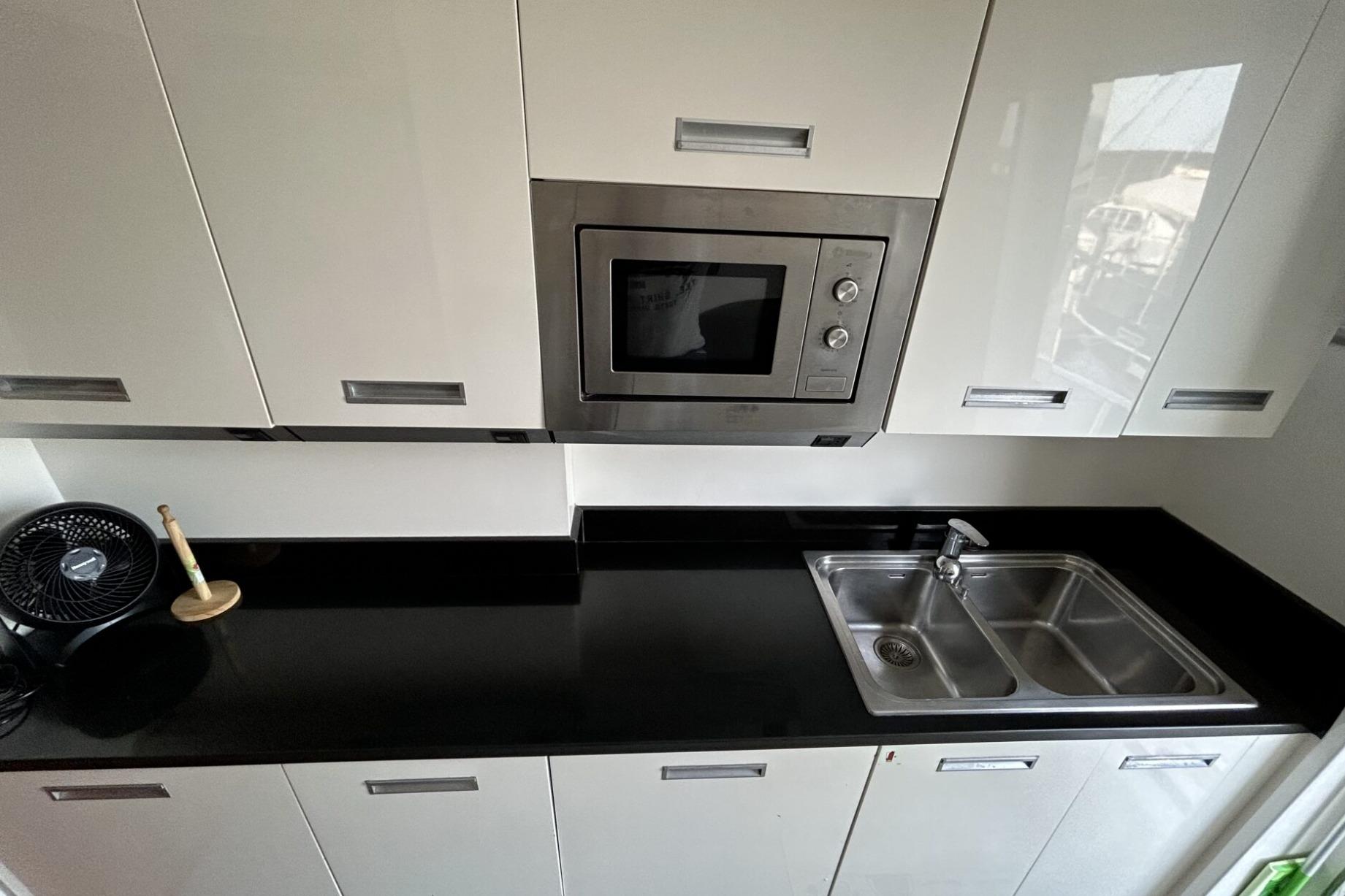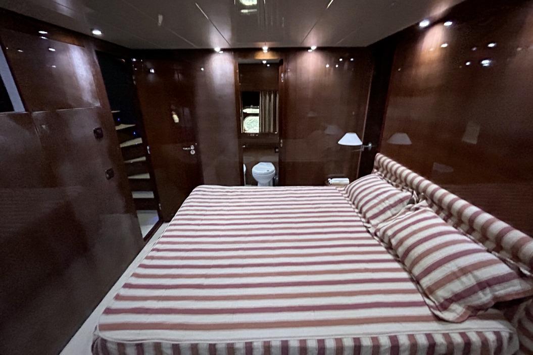 Full-beam aft master cabin with sofa and walk-in closet, private bathroom with shower and bidet. VIP cabin forward with bathroom with shower and bidet. Guest cabin on the port side, two twin beds, private bathroom with shower and bidet. Guest cabin on the port side, one twin bed, private bathroom with shower. Crew cabin, external access from the forward hatch, with two V-shaped beds and bathroom.