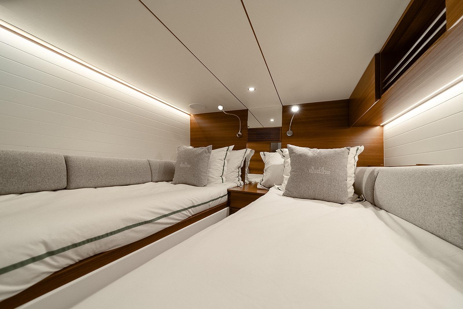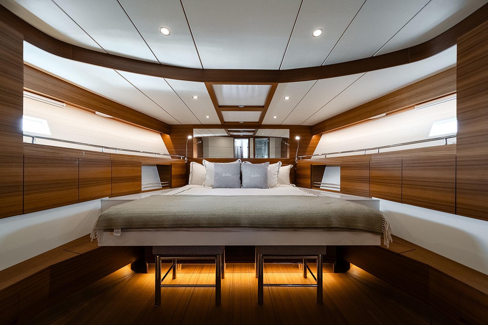 Interior design in finest selected teak, eight layers of varnish, removable panels covered in Italian fabrics.