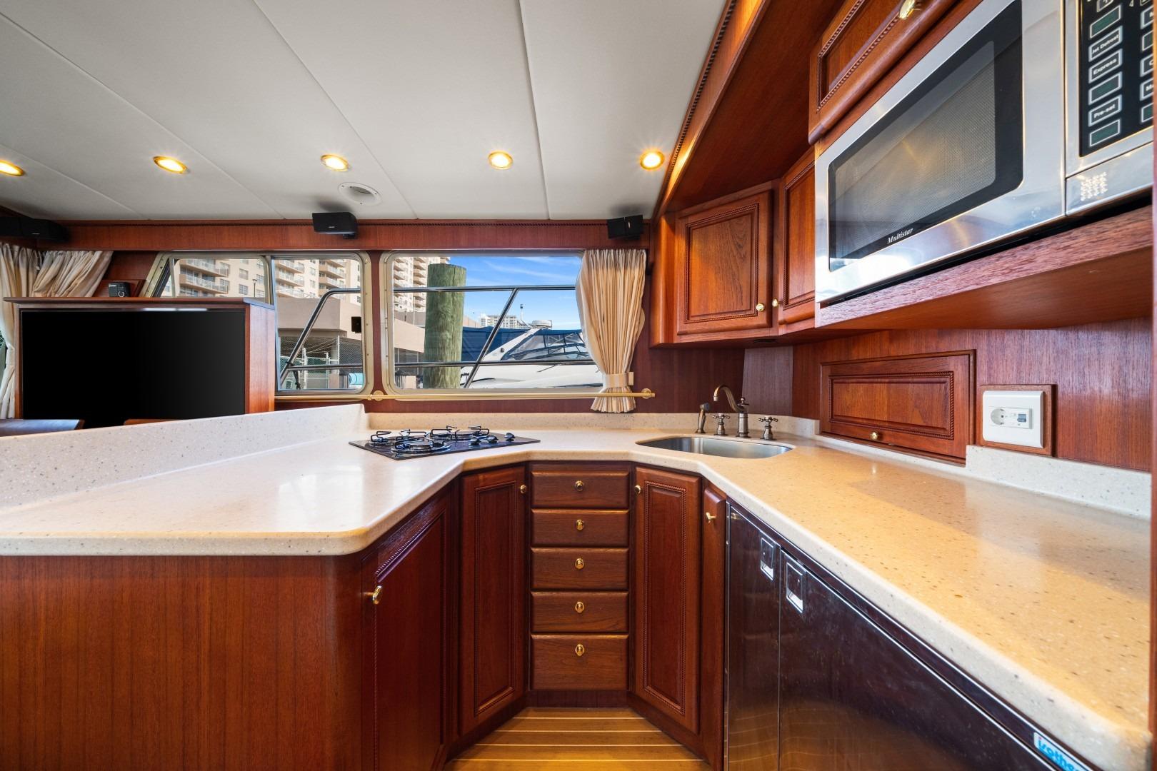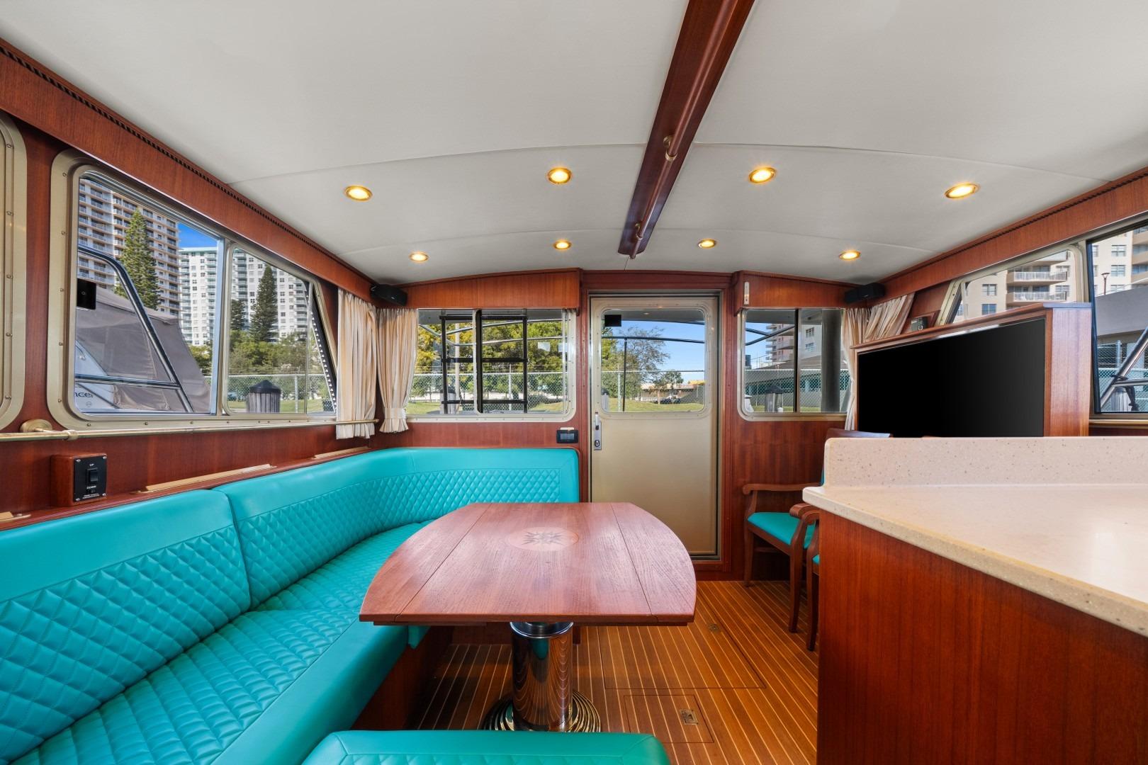 You and your guests will enjoy your time on the water fishing off the aft deck or relaxing in one of the many entertaining spaces around the boat like the co-pilot lounge, the roof top sun pad and the flybridge settee. At the end of the day, you can unwind in the generous master state room featuring a queen berth with a separate head and shower while your guests retire to a second private stateroom with two single bunks. Seating for 8 and beds for 4, 2 heads, a spacious galley fully equipped with a deep sink, fridge/freezer, cooktop, microwave, and ample storage provides you will all the necessities to enjoy your cruising and fishing lifestyle.