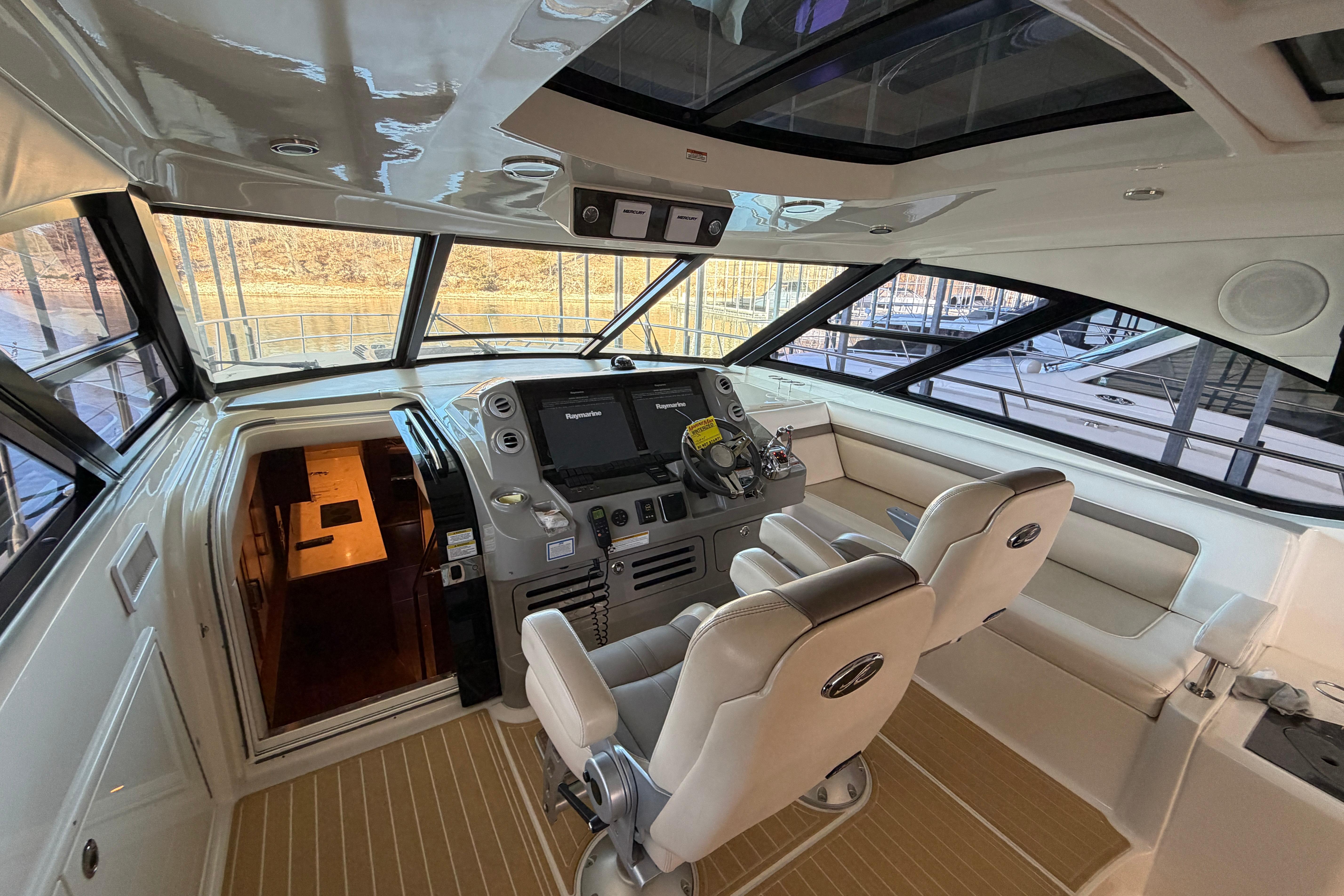 Our 540 Sundancer takes signature sleekness and purposeful design with standard V-drive propulsion. A centerline helm enhances visibility and pivots to face the starboard lounge at rest, while in the cockpit a transom "sun gate" opens to extend the sun pad. Inside, the redesigned sofa and new hinged table improves comfort, as does the new deluxe décor.