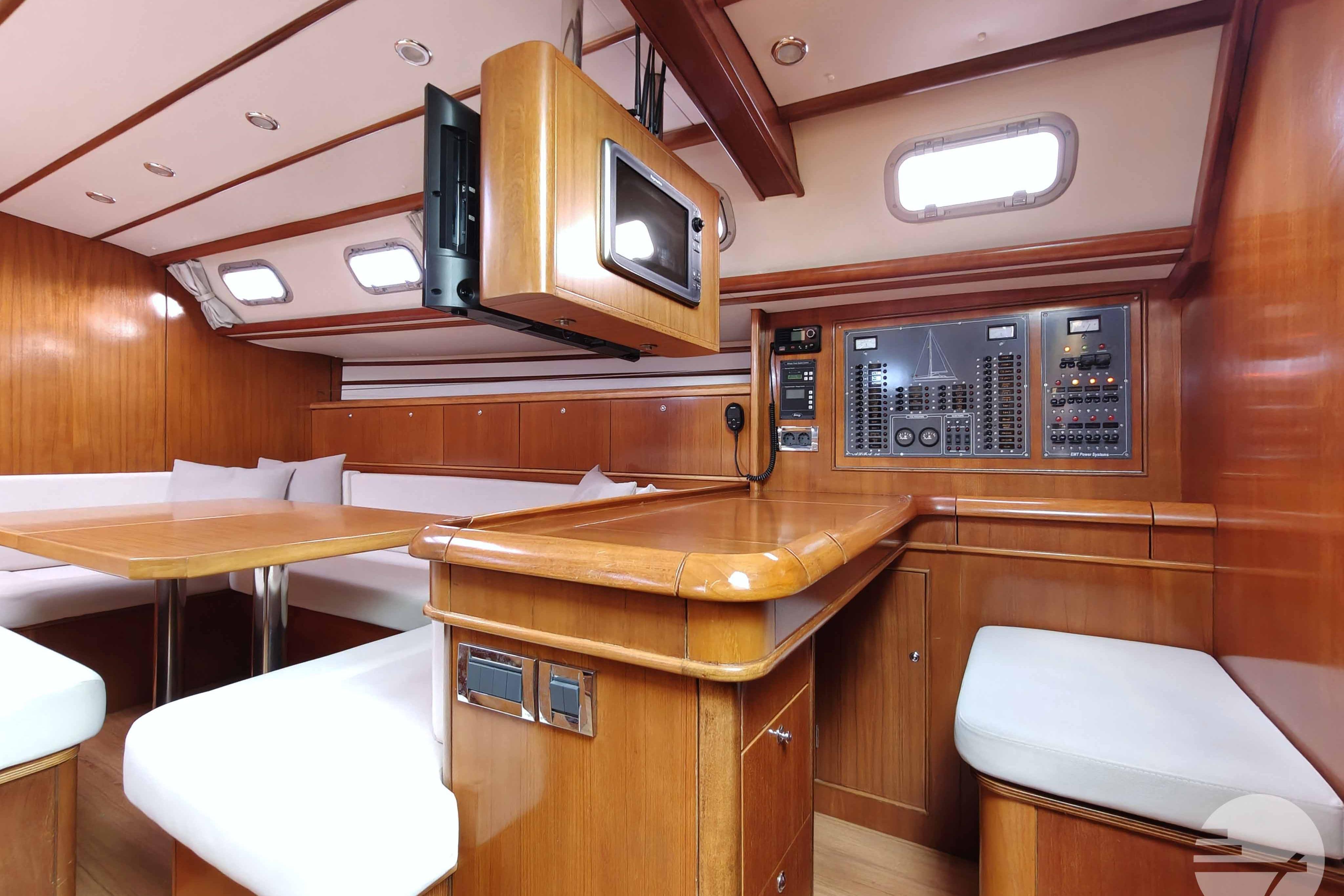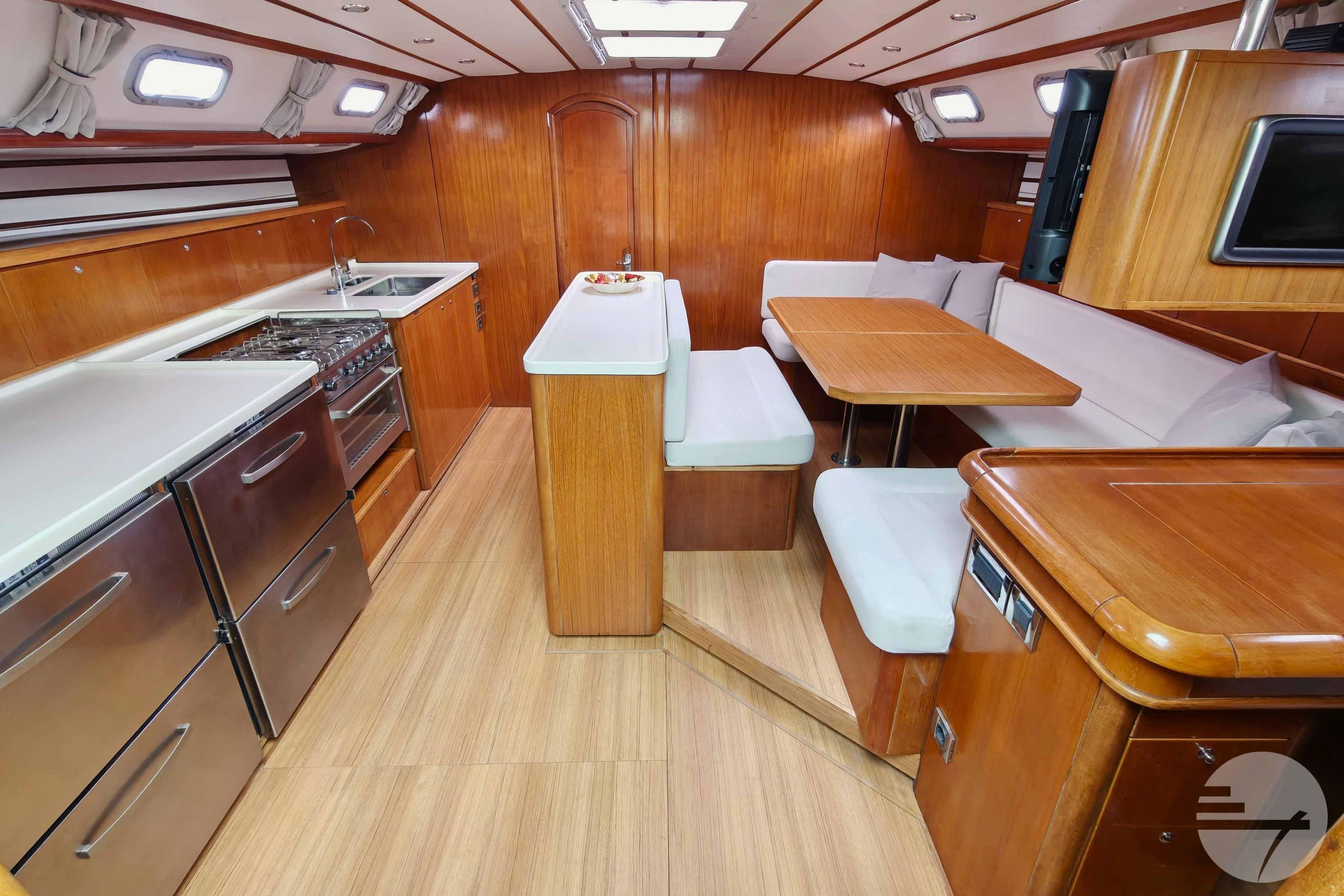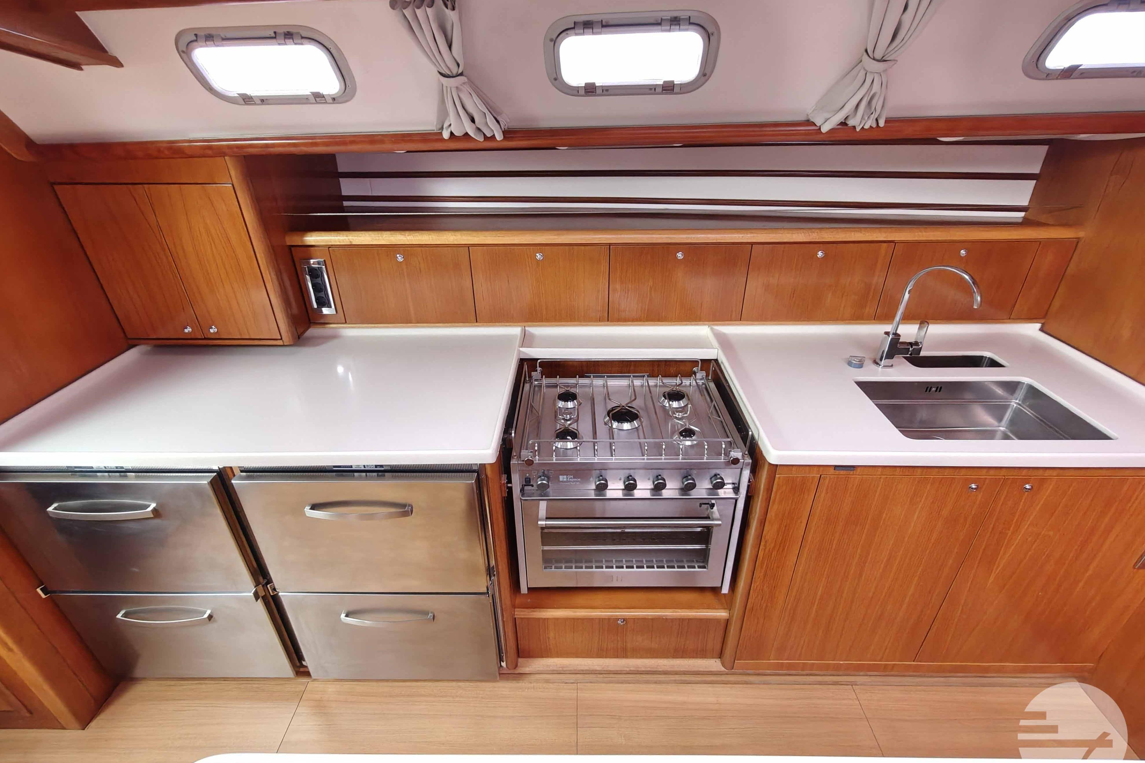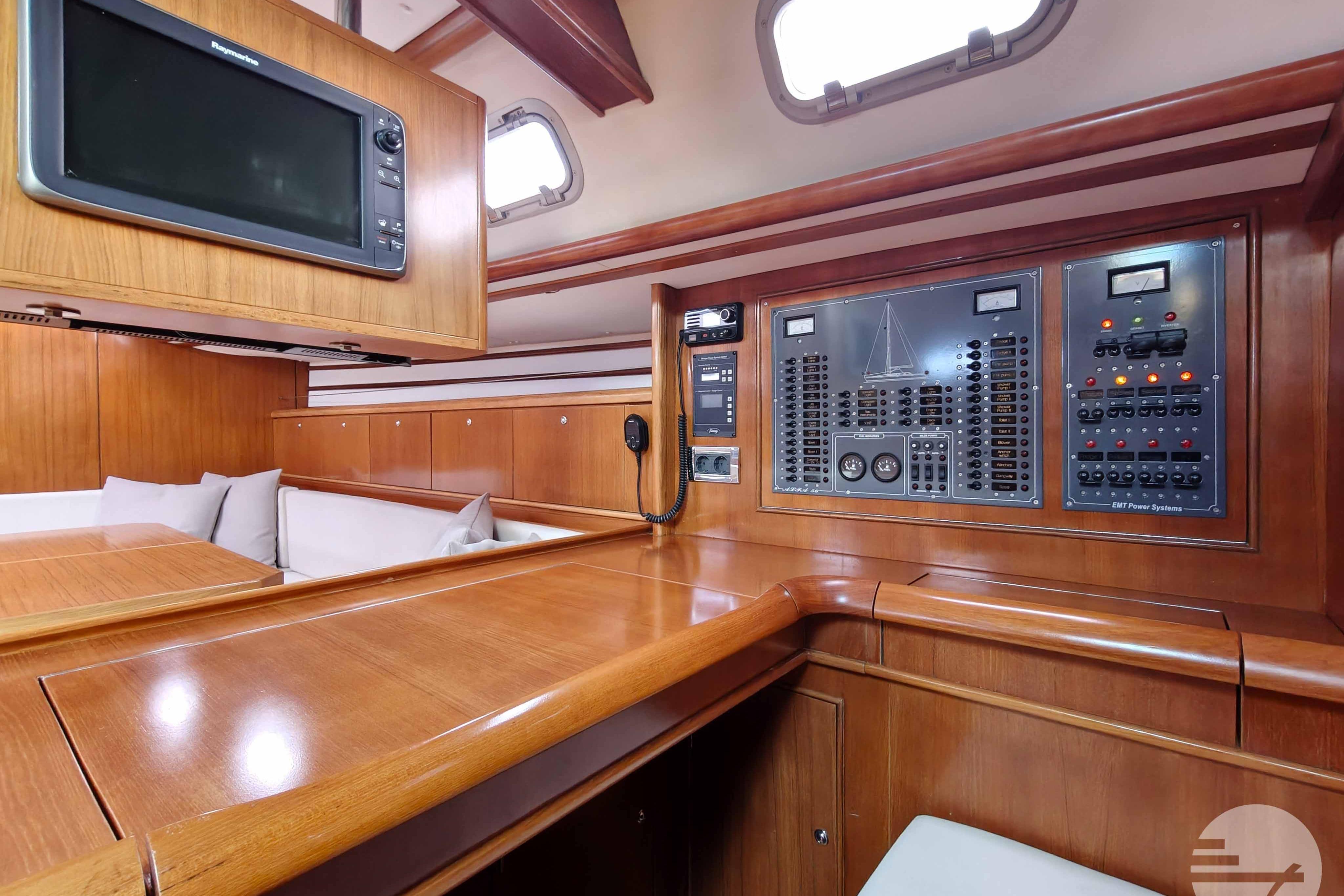 The yacht is easy to steer with her two well-kept sails, in very good condition. At both steering positions you have the same navigation instruments. The sturdy Davidts and gangway make for easy boarding and disembarking. The cockpit has two symetrical benches with cushions and in the center a folding table. Down below, the spacious interior surprises. The chart table has clear instruments. Adjacent is a large salon in a light gray alcantara. Against the back of the sofa is built a half-height cabinet. In addition to storage space, it offers a nice extra work surface and, above all, lots of support while sailing. Even with strong waves, you can continue cooking calmly. The wide countertop has a composite worktop and lots of storage space. The refrigerators and stove are chosen to live aboard for a long time.