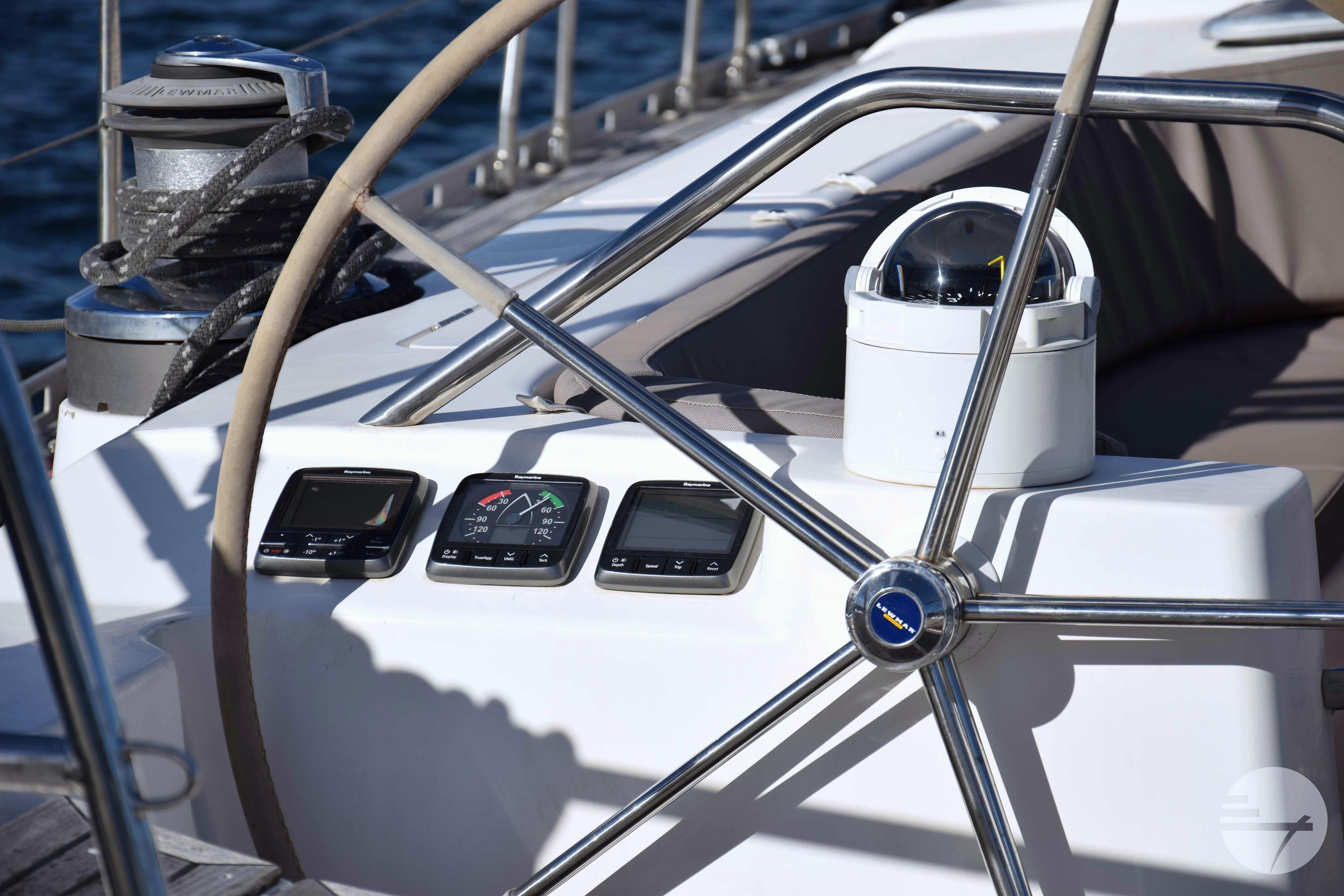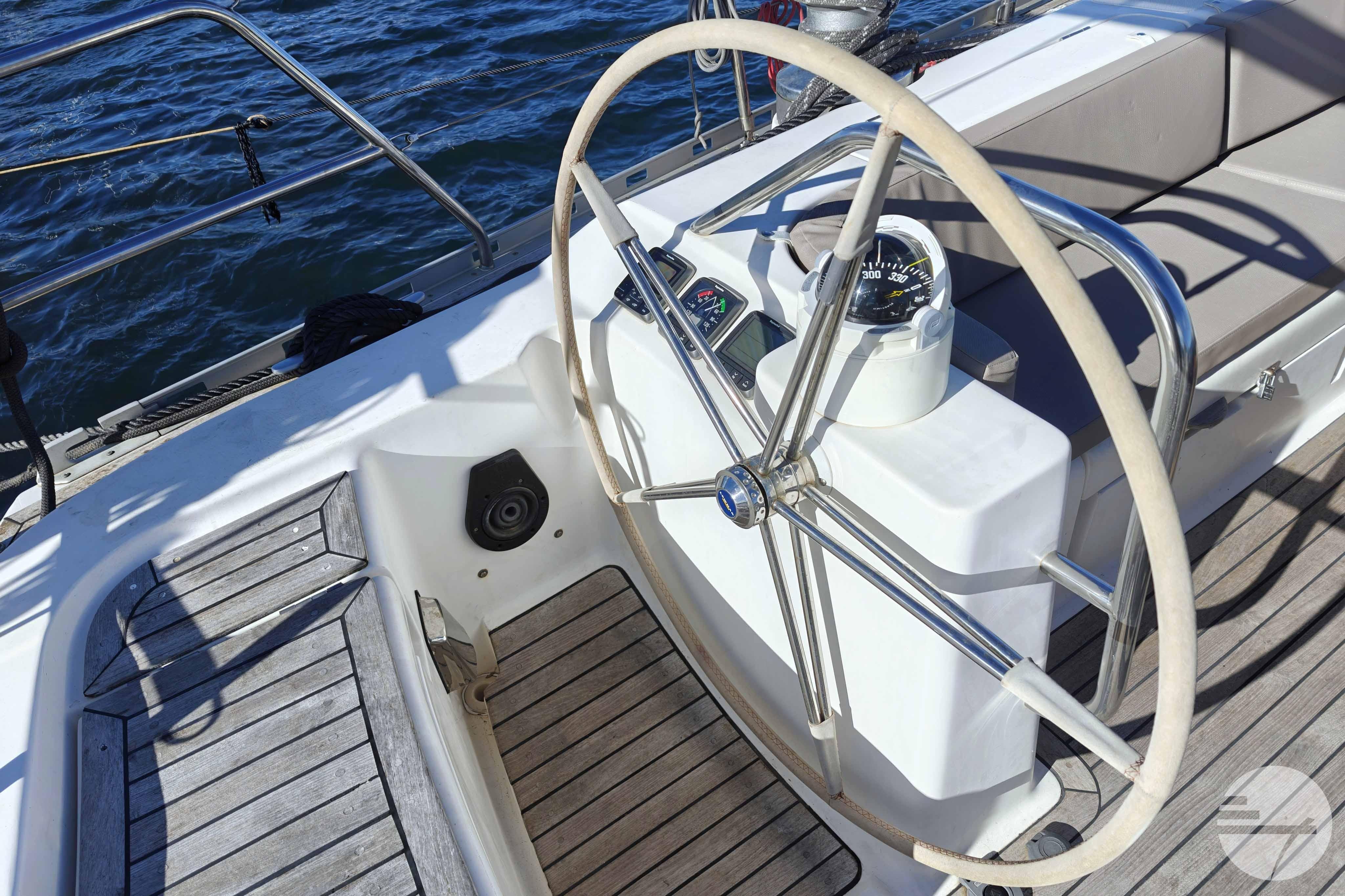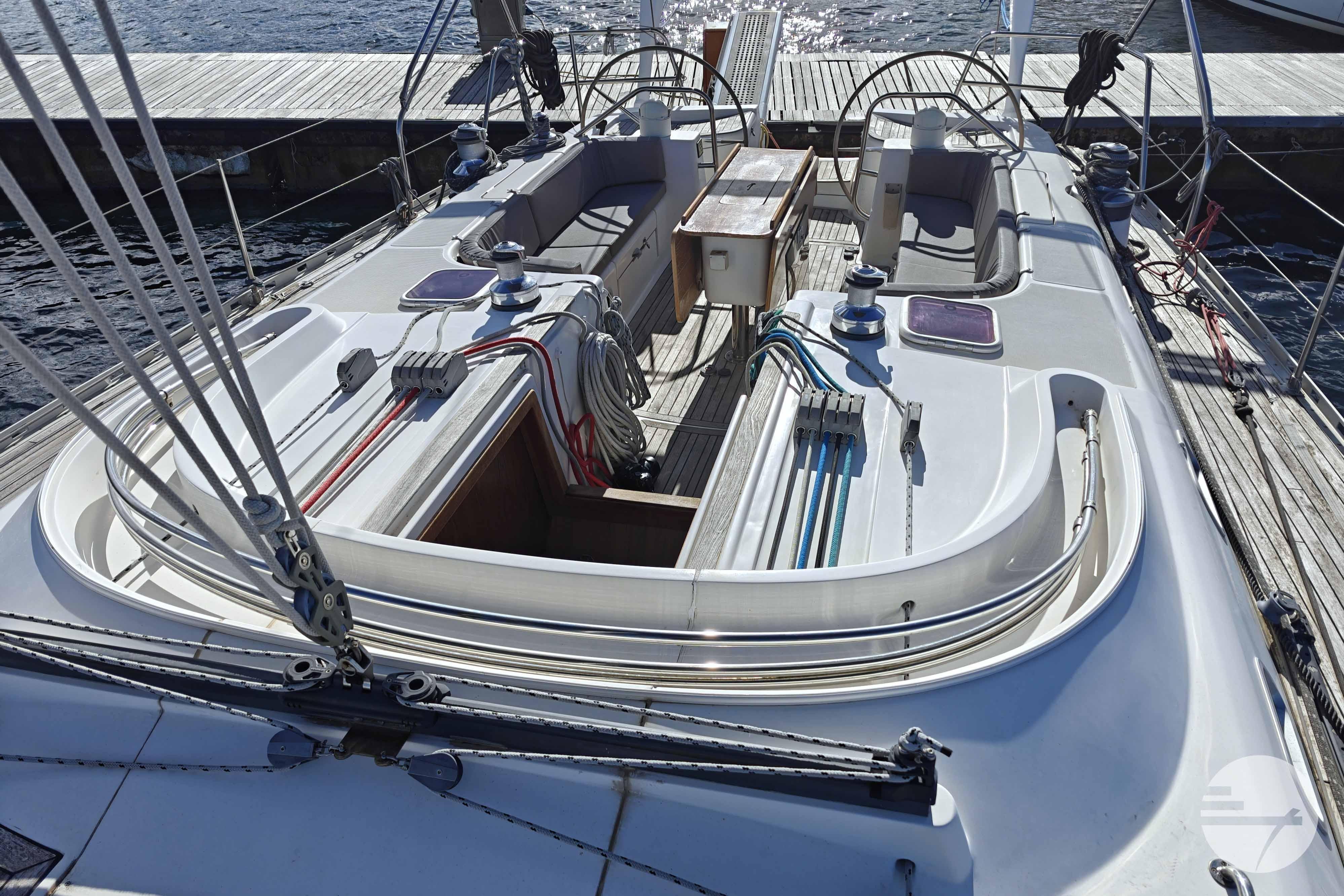 The yacht is easy to steer with her two well-kept sails, in very good condition. At both steering positions you have the same navigation instruments. The sturdy Davidts and gangway make for easy boarding and disembarking. The cockpit has two symetrical benches with cushions and in the center a folding table. Down below, the spacious interior surprises. The chart table has clear instruments. Adjacent is a large salon in a light gray alcantara. Against the back of the sofa is built a half-height cabinet. In addition to storage space, it offers a nice extra work surface and, above all, lots of support while sailing. Even with strong waves, you can continue cooking calmly. The wide countertop has a composite worktop and lots of storage space. The refrigerators and stove are chosen to live aboard for a long time.