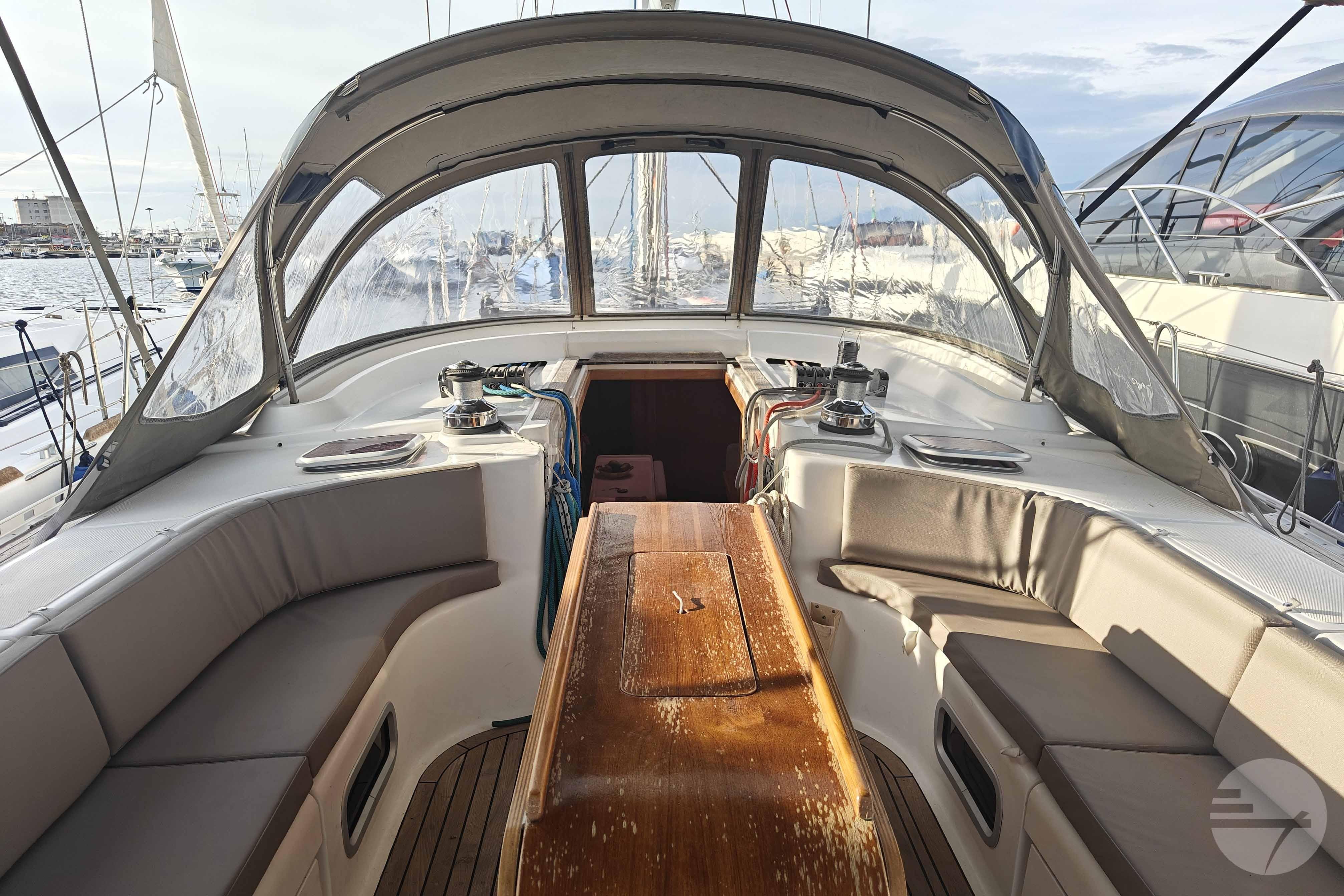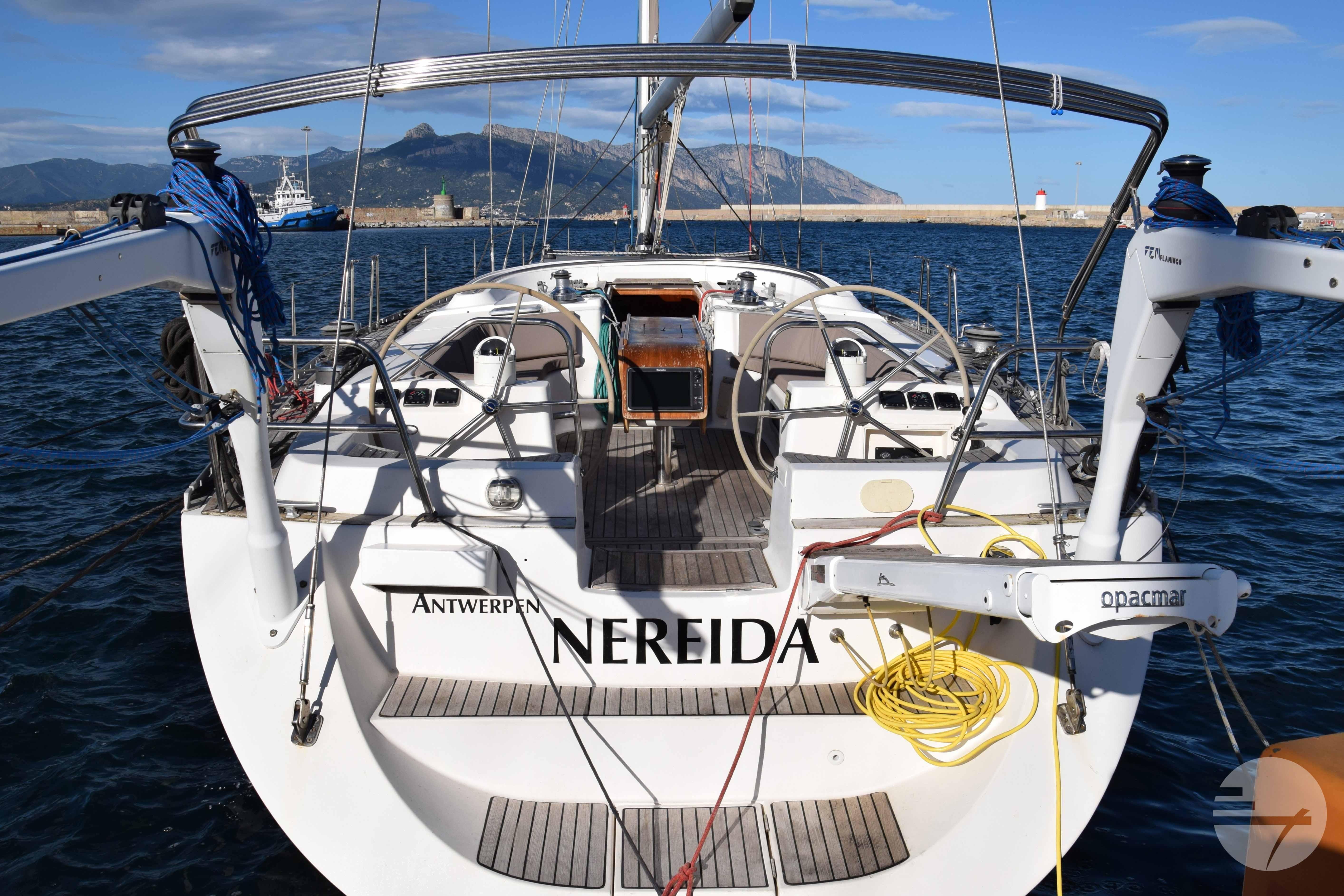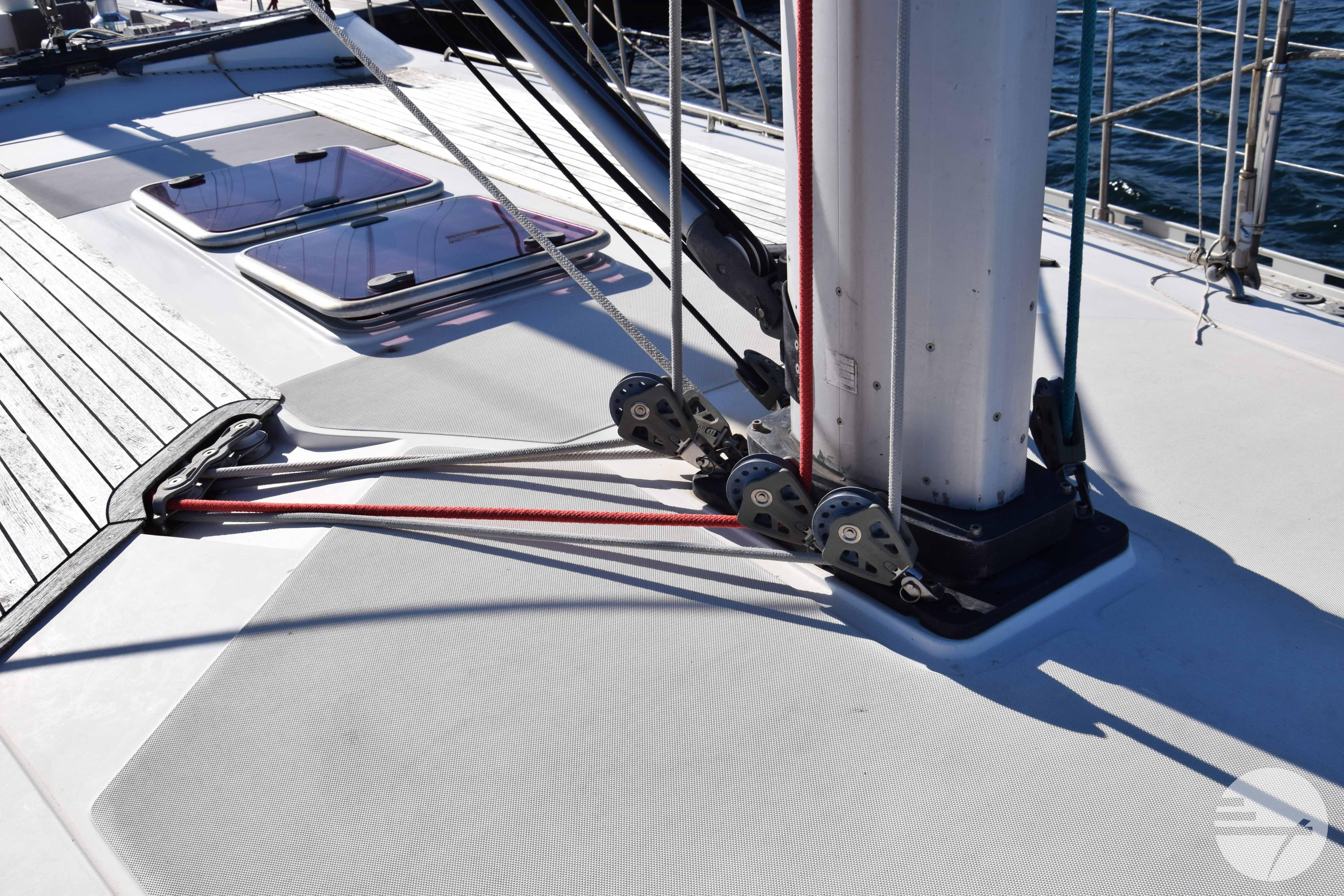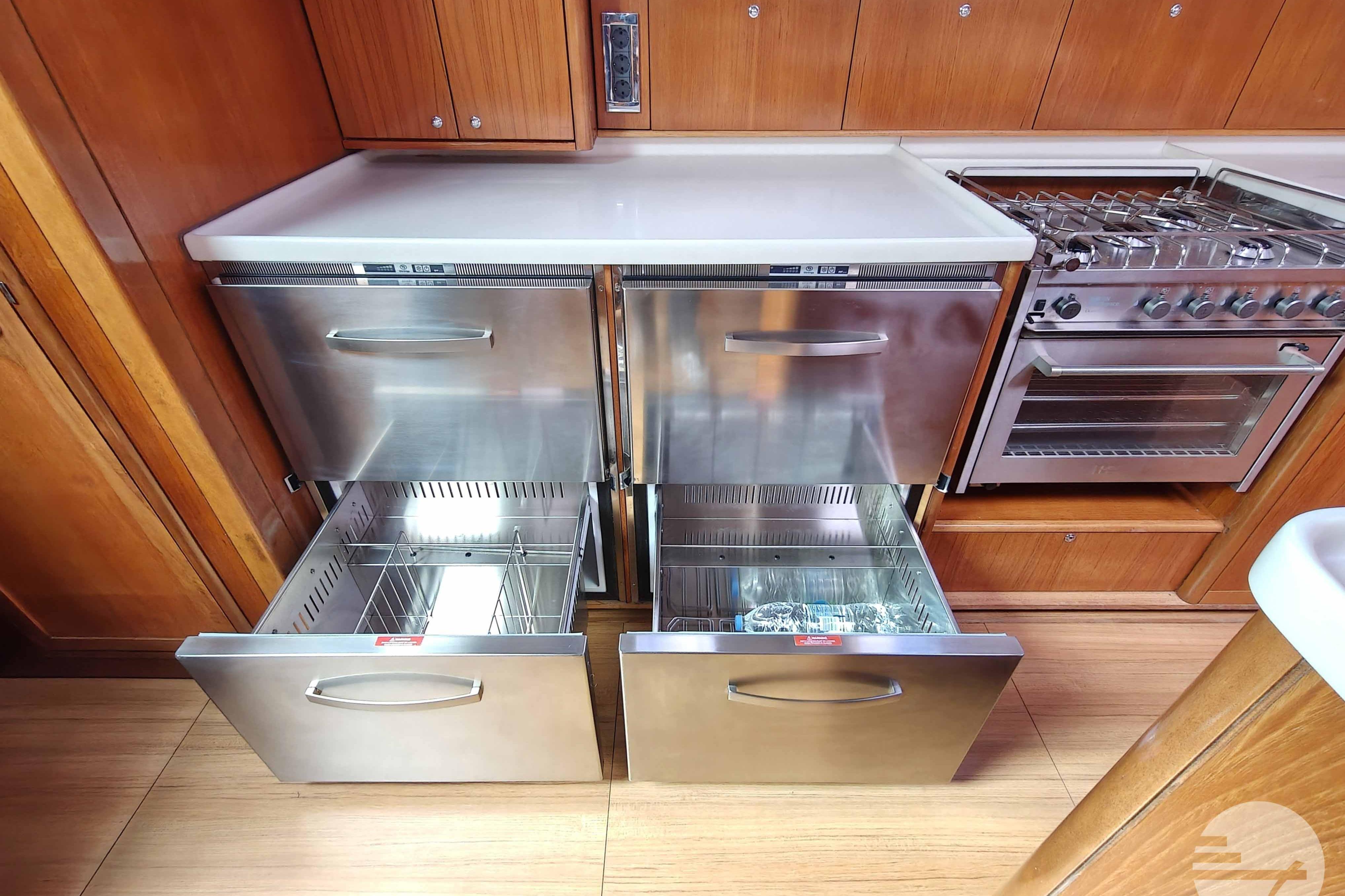 The yacht is easy to steer with her two well-kept sails, in very good condition. At both steering positions you have the same navigation instruments. The sturdy Davidts and gangway make for easy boarding and disembarking. The cockpit has two symetrical benches with cushions and in the center a folding table. Down below, the spacious interior surprises. The chart table has clear instruments. Adjacent is a large salon in a light gray alcantara. Against the back of the sofa is built a half-height cabinet. In addition to storage space, it offers a nice extra work surface and, above all, lots of support while sailing. Even with strong waves, you can continue cooking calmly. The wide countertop has a composite worktop and lots of storage space. The refrigerators and stove are chosen to live aboard for a long time.