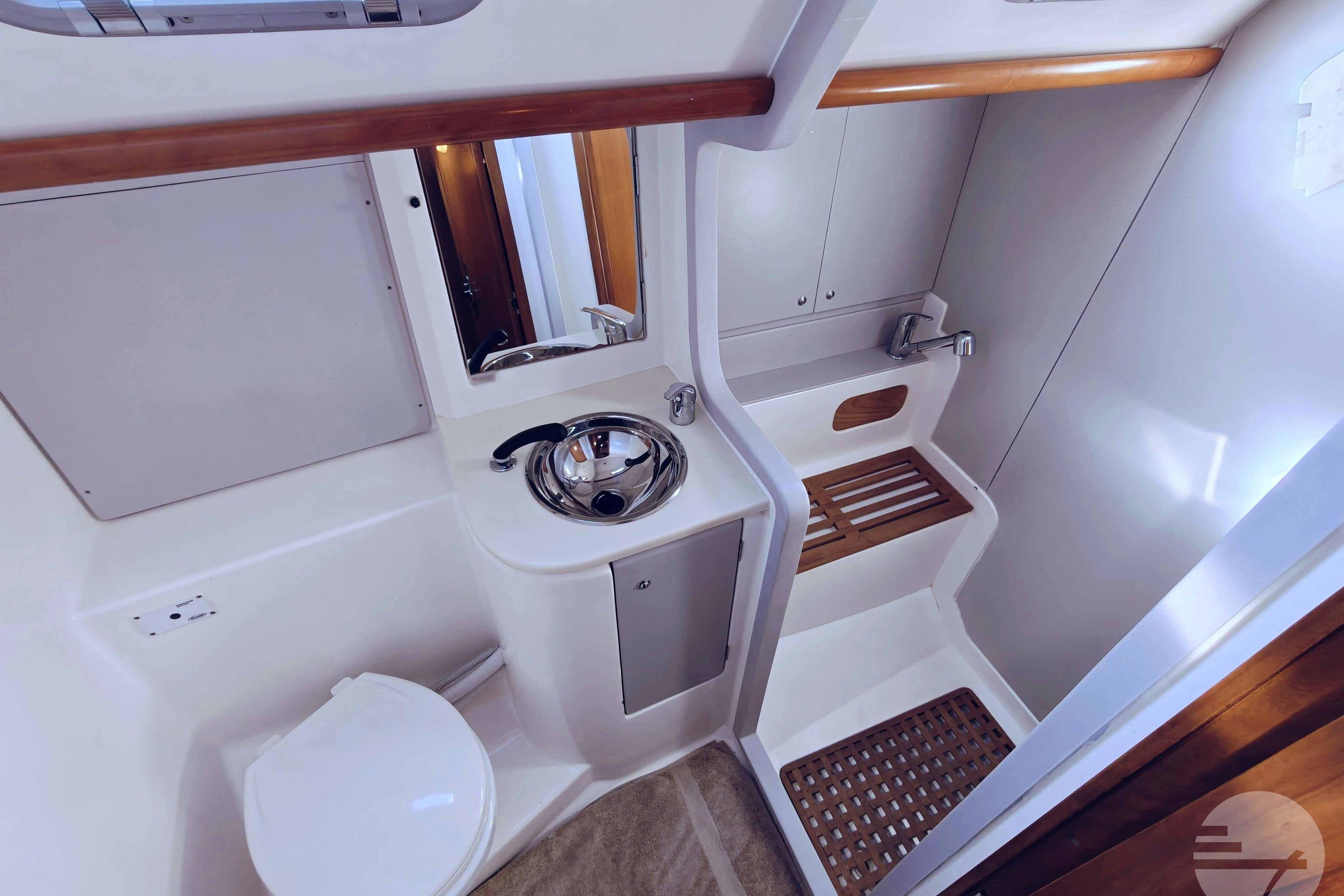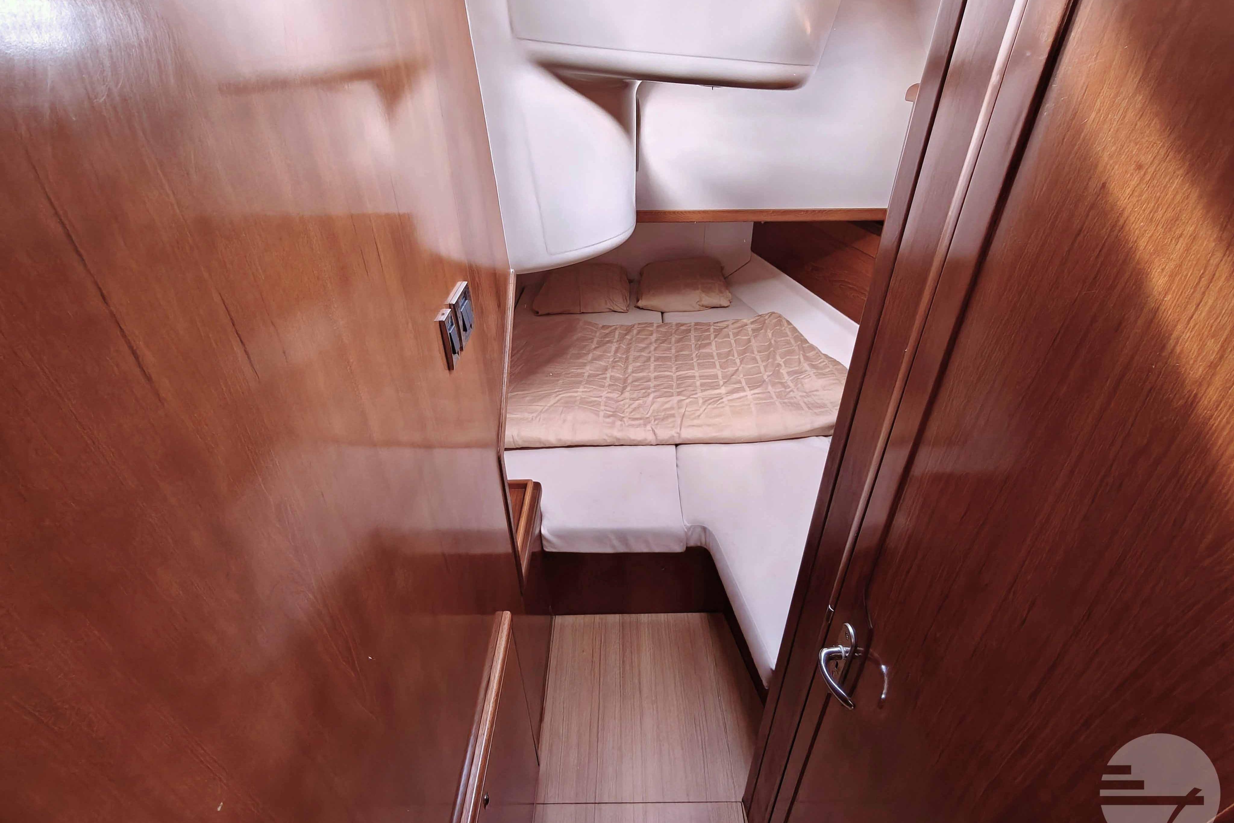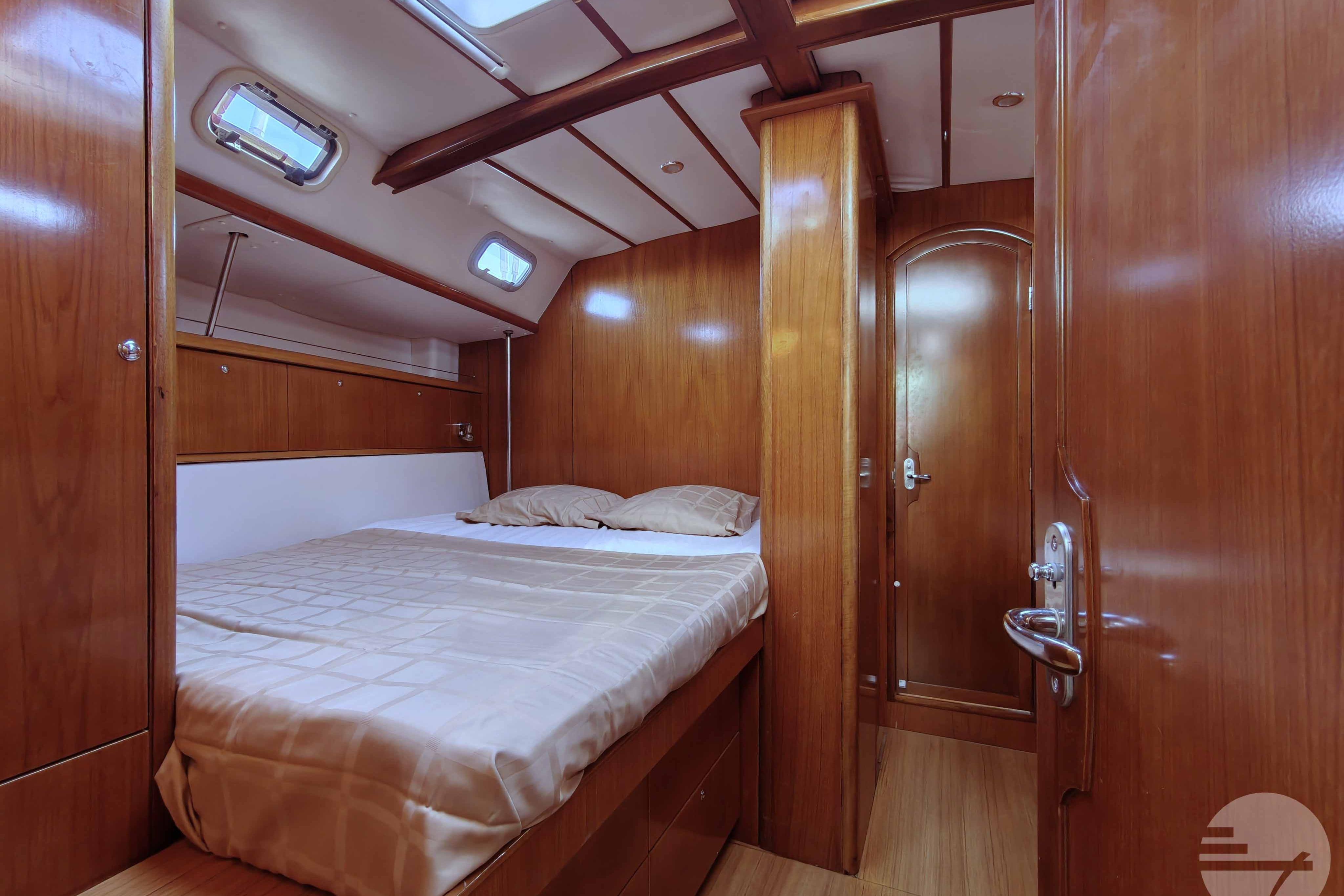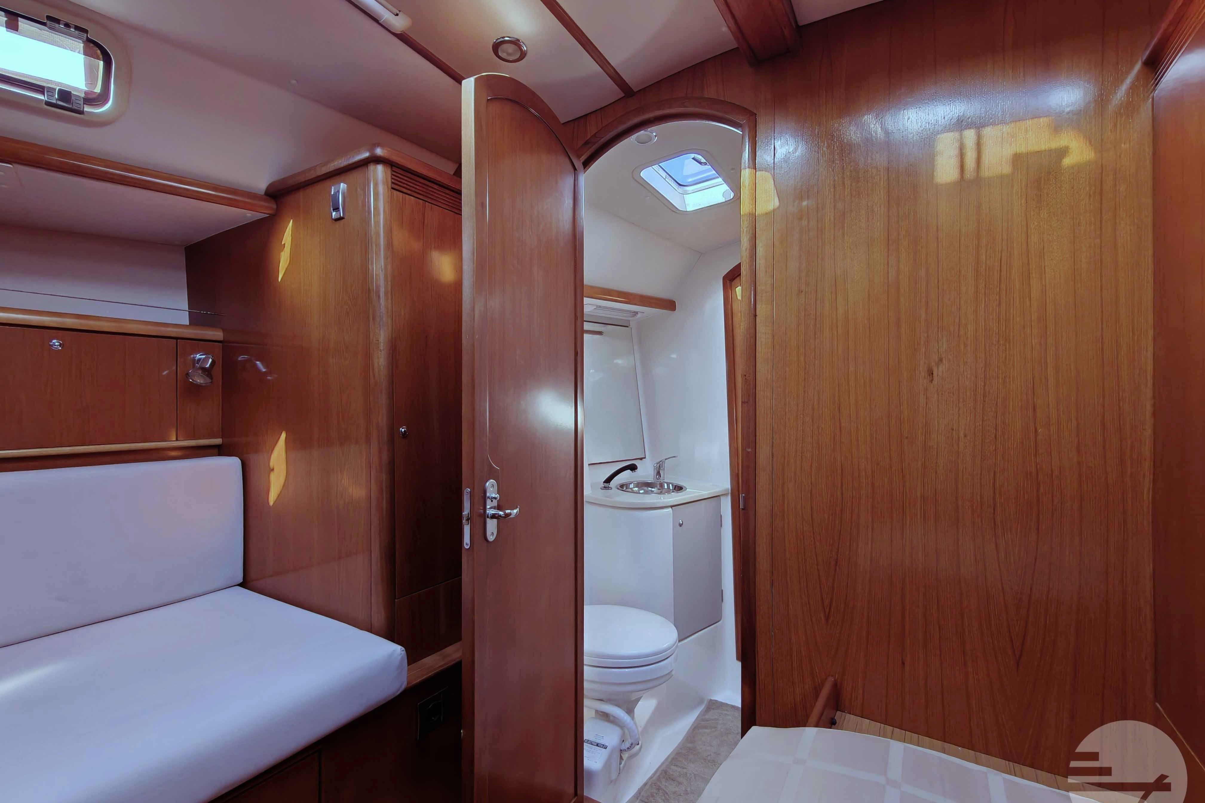 This yacht has two guest cabins, each with its own bathroom with toilet and shower. Forward is a large, nicely appointed owner's cabin with a double bed on the starboard side. The bed has a comfort mattress. There are many drawers and half-height closets. The sofa can be used as an extra bed. The bathroom has a space shower, toilet and sink.