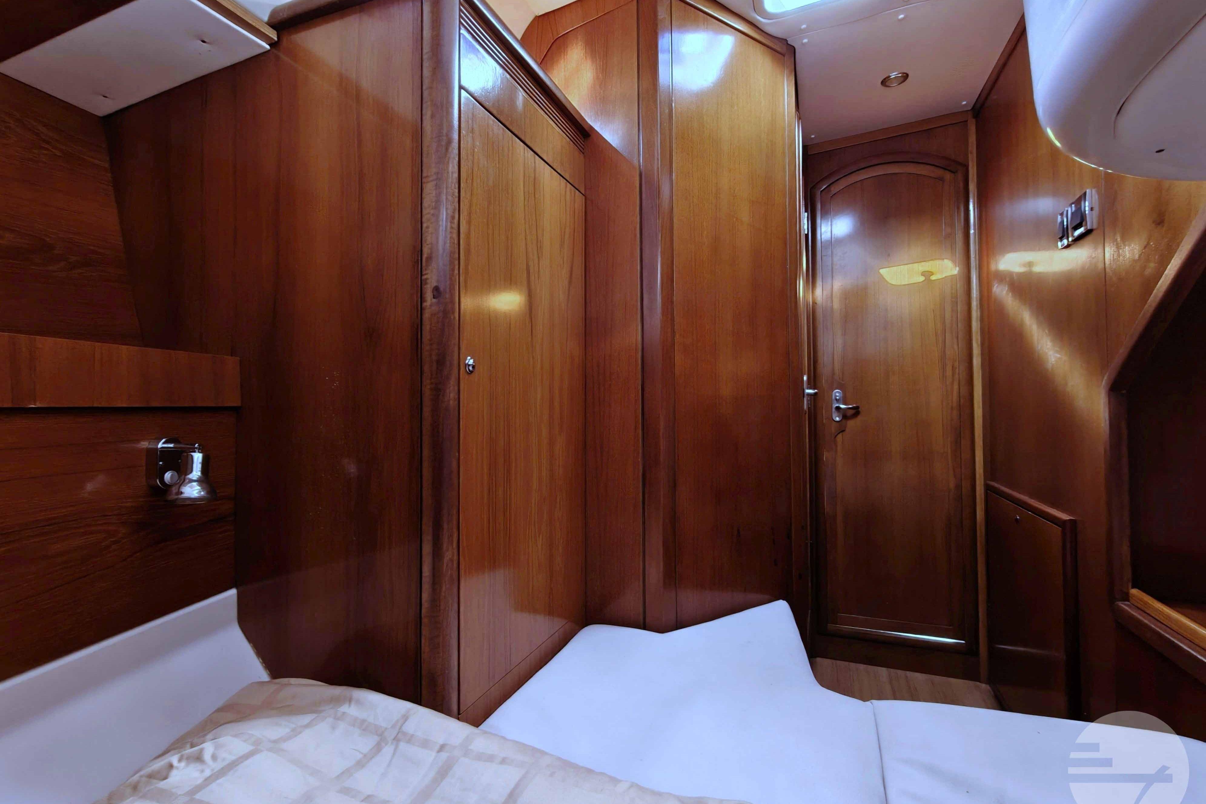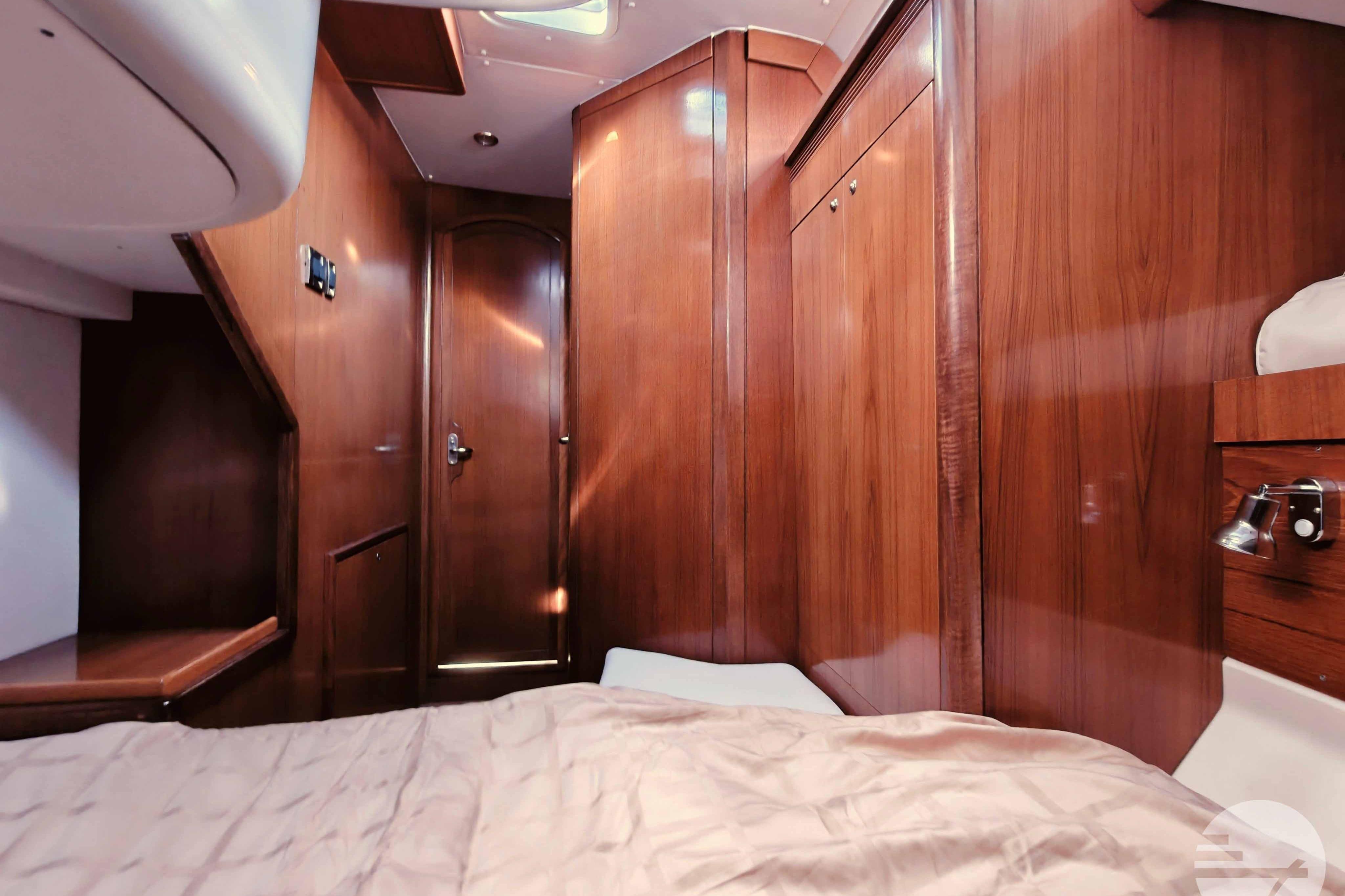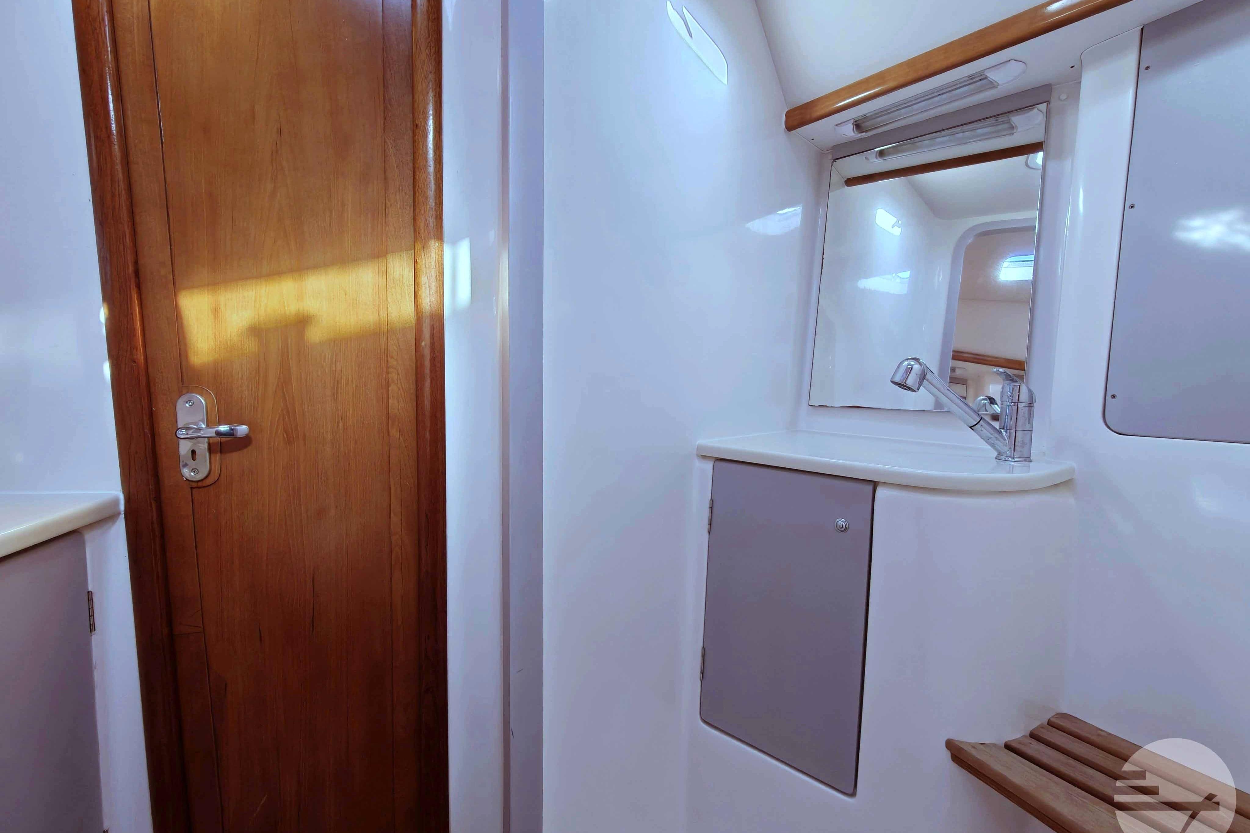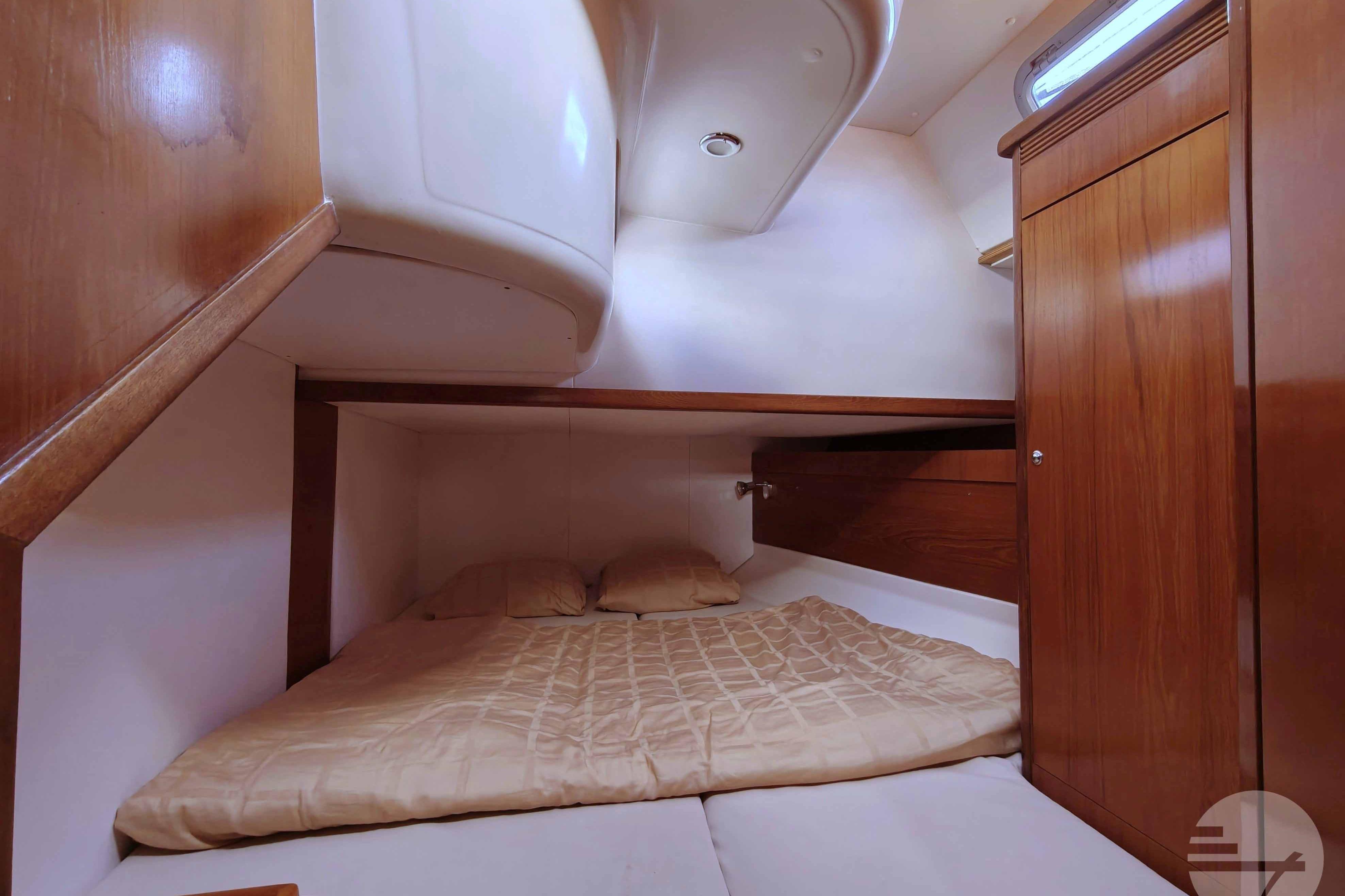 This yacht has two guest cabins, each with its own bathroom with toilet and shower. Forward is a large, nicely appointed owner's cabin with a double bed on the starboard side. The bed has a comfort mattress. There are many drawers and half-height closets. The sofa can be used as an extra bed. The bathroom has a space shower, toilet and sink.